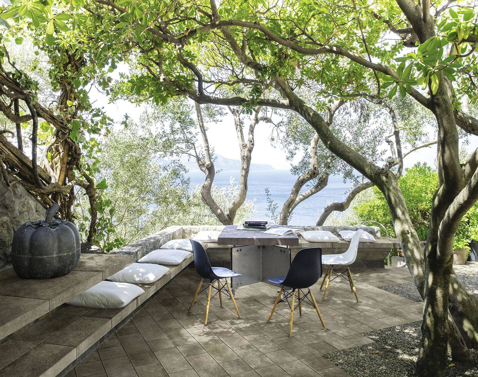 Il y a le ciel, le soleil et la mer, mais aussi la pierre et les arbres… Cette image idyllique d’une beauté sauvage quelque part en Italie est plus contemporaine qu’on ne le croit : un banc en pierres taillées pour recevoir les coussins a été ajouté tandis que les dalles en grès cérame recouvrent le sol. Et pourtant, tout participe d’une quiétude, d’un lieu serein avec vue, d’une terrasse intemporelle.
