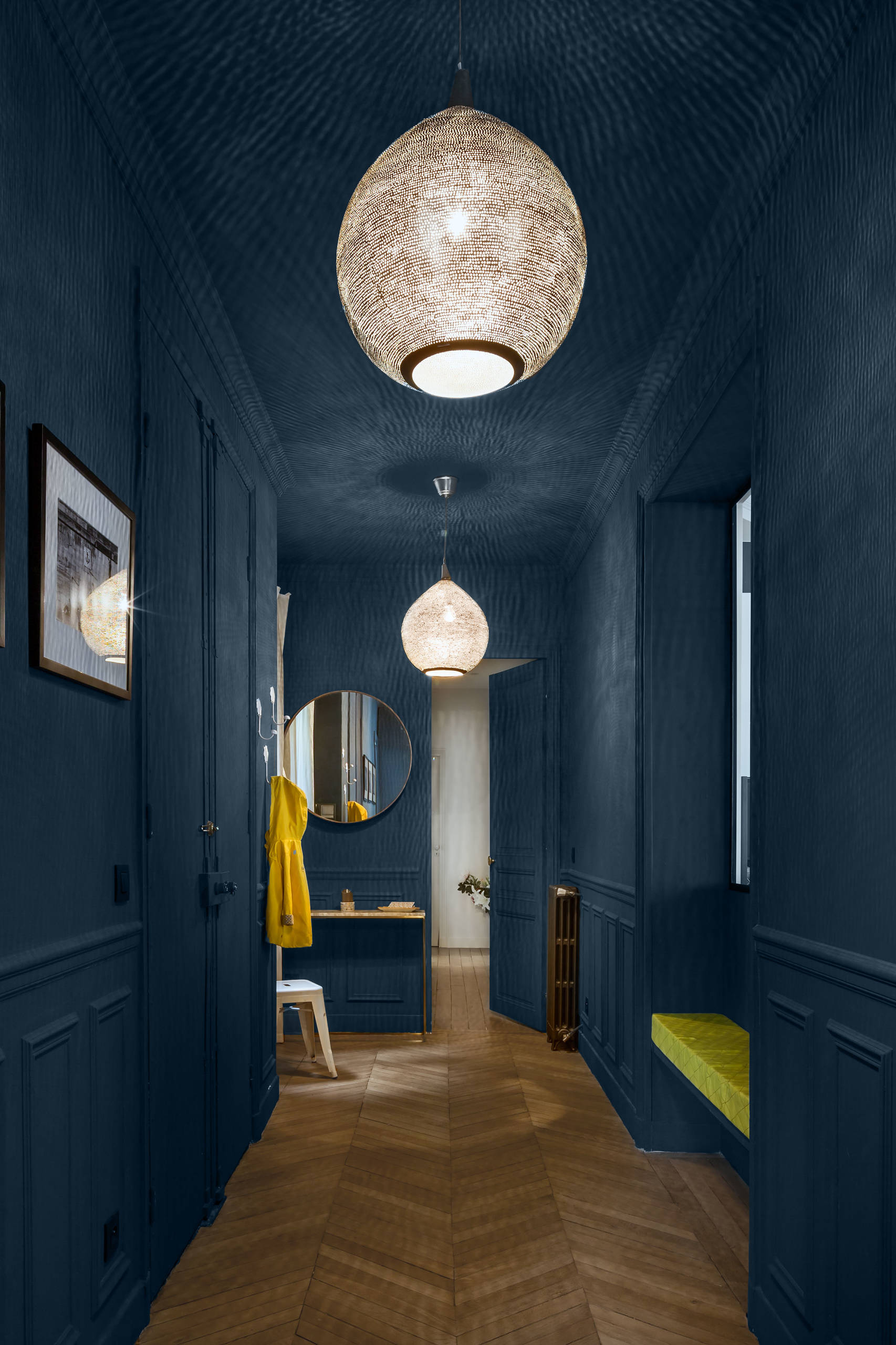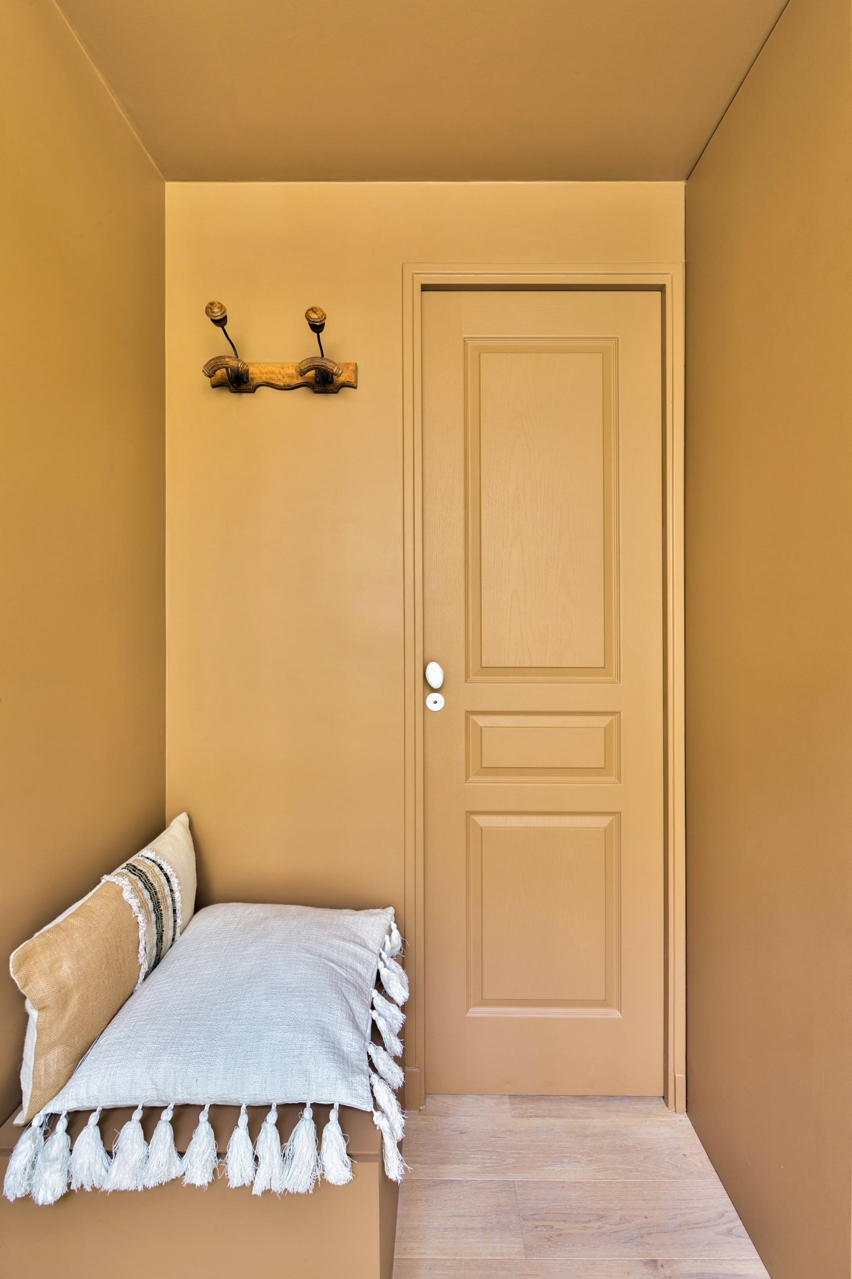 Cette architecte d’intérieur nous offre un exemple concret de son utilisation personnelle de l’uni avec l’entrée de ce petit appartement parisien. Elle l’a égayée d’une unique tonalité forte, le « miel ambré » du coloriste Dulux Valentine, en recouvrant même le plafond.