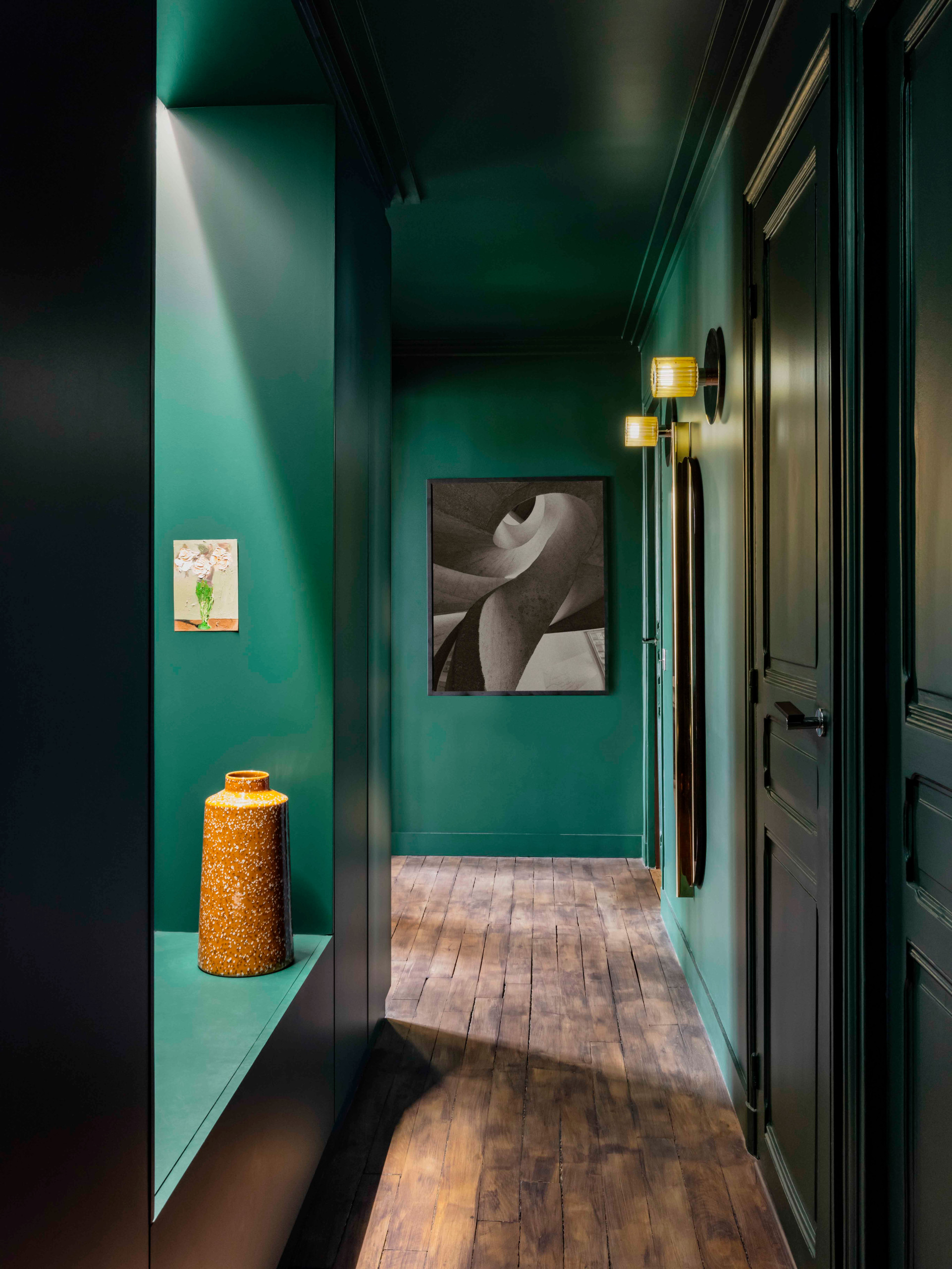 Il n’est pas interdit non plus de créer plusieurs zones monochromes dans un même appartement. C’est précisément le choix fait par l’architecte Thibaut Picard dans le deux-pièces de Montmartre qu’il a repensé façon suite d’hôtel. « Toutes les pièces d’un appartement peuvent être traitées dans une unité chromatique. Il faut réussir à trouver l’équilibre pour que chaque couleur puisse se répondre et ne pas être en opposition. Dans ce projet, nous avons, par exemple, traité l’entrée dans un vert profond qui accentue l’unité et permet des contrastes forts avec les autres pièces, en particulier la chambre saumon. Tout comme les espaces, les couleurs doivent dialoguer les unes avec les autres », insiste-t-il.
