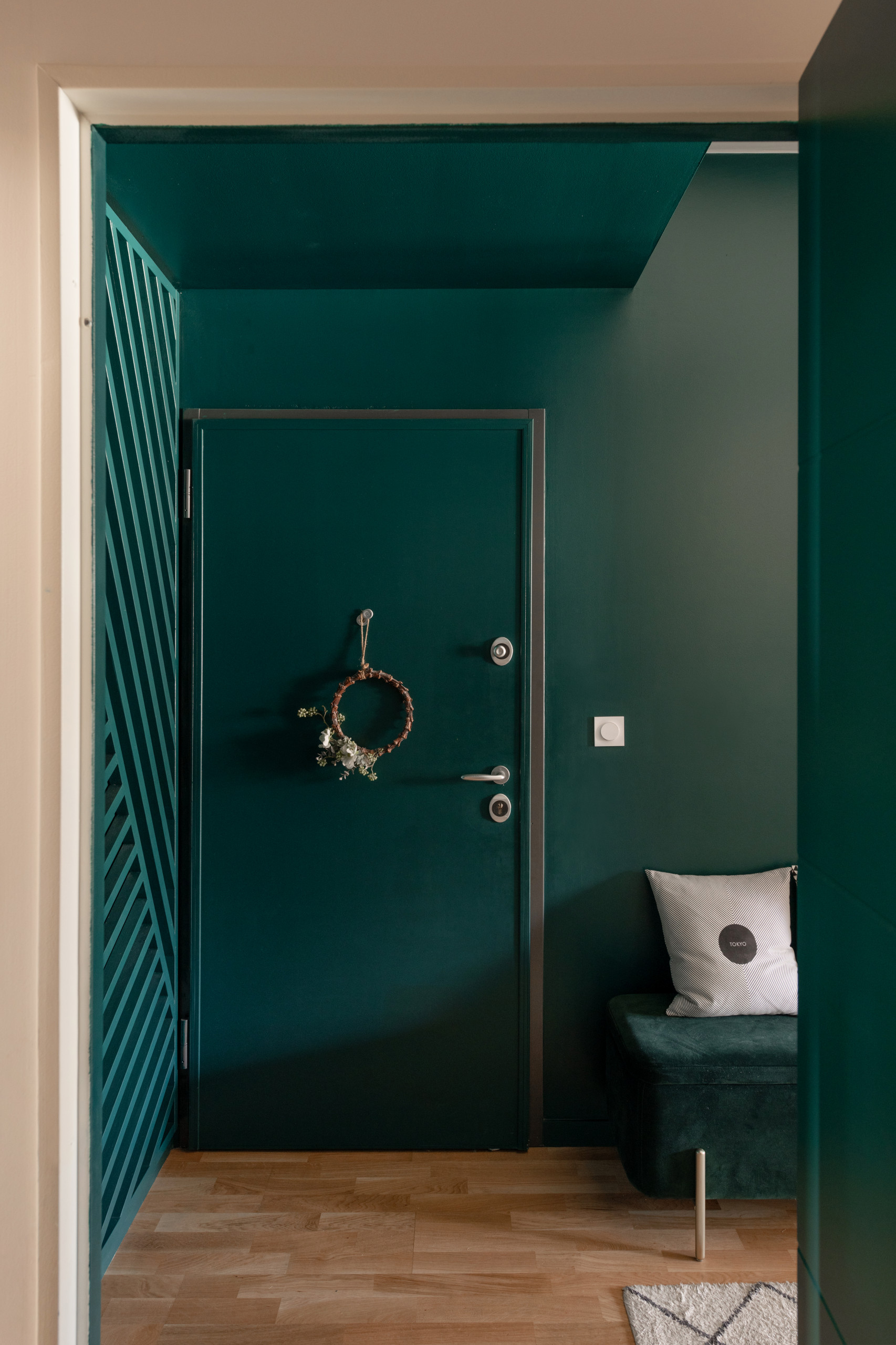 Margaux Carnavelli n’est pas la seule à trouver judicieux de transformer les entrées en boîtes unies pour provoquer la surprise. Ci-dessus, l’architecte d’intérieur Camille Basse, a choisi le vert sapin pour parer l’entrée de cet appartement familial à Lyon.
