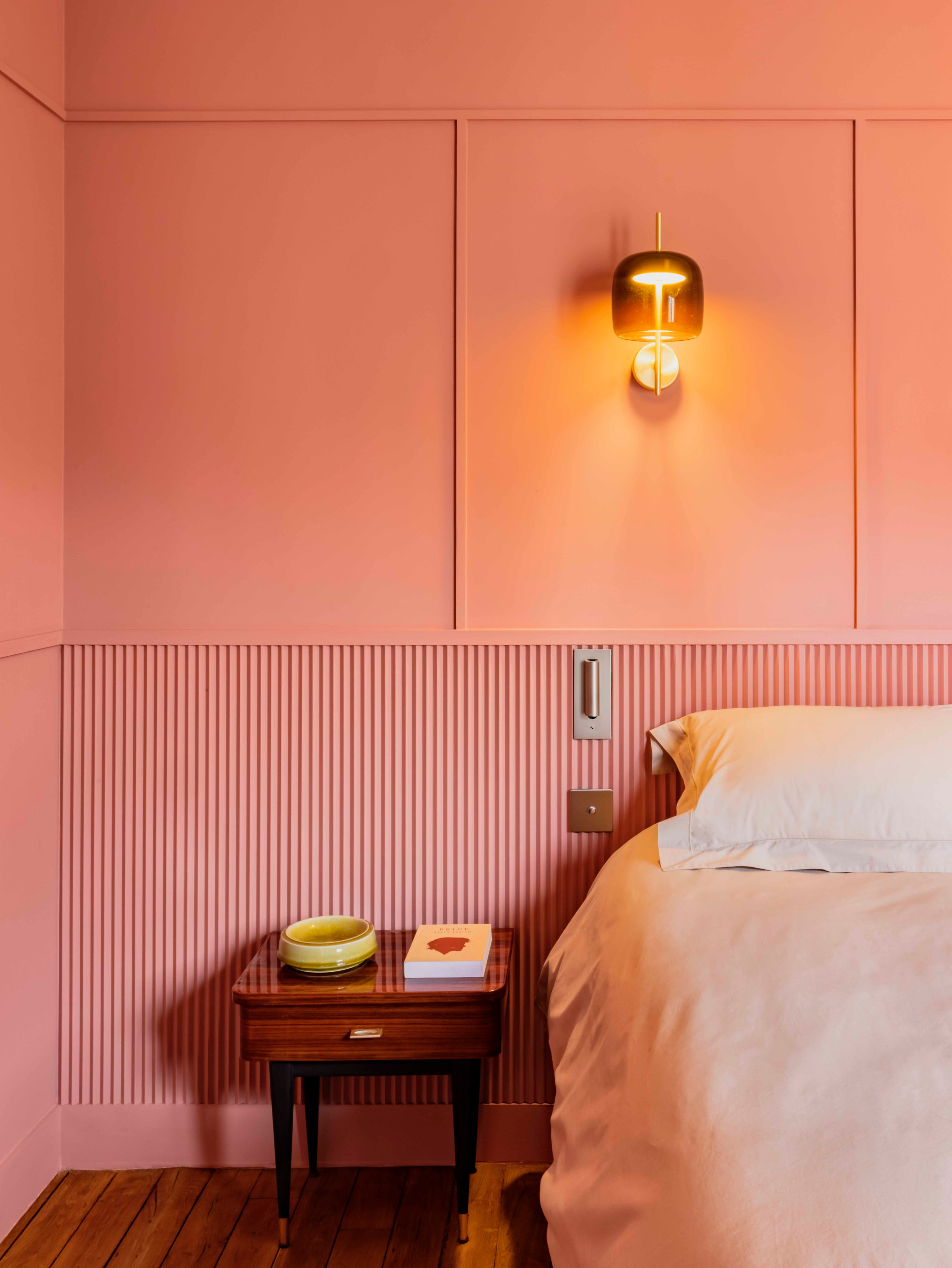 Thibaut Picard décrypte : « Nous avons voulu donner une atmosphère unique à cette chambre en jouant sur une unité de couleur. Nous avons donc utilisé la teinte S64 de chez Ressource sur l’ensemble des murs avec un traitement particulier de la tête de lit pour créer un jeu de matière. Cette unité chromatique permet de créer une sensation de cocon propice à la chambre. De plus, cette couleur évolue en fonction de la lumière et crée différentes ambiances au cours de la journée. »