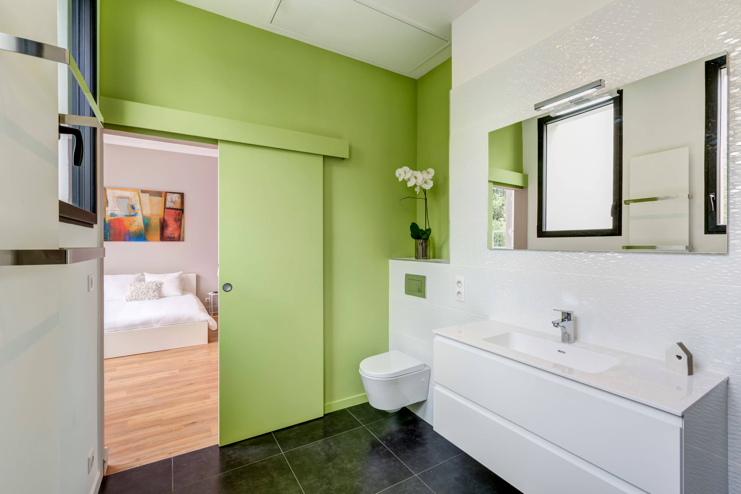 La porte escamotable est préférée pour équiper les espaces nuit et les salles de bains. Pour ces dernières, les portes en verre opaques sont très prisées, car elles permettent de récupérer la lumière en second jour quand la pièce ne dispose pas de fenêtre.