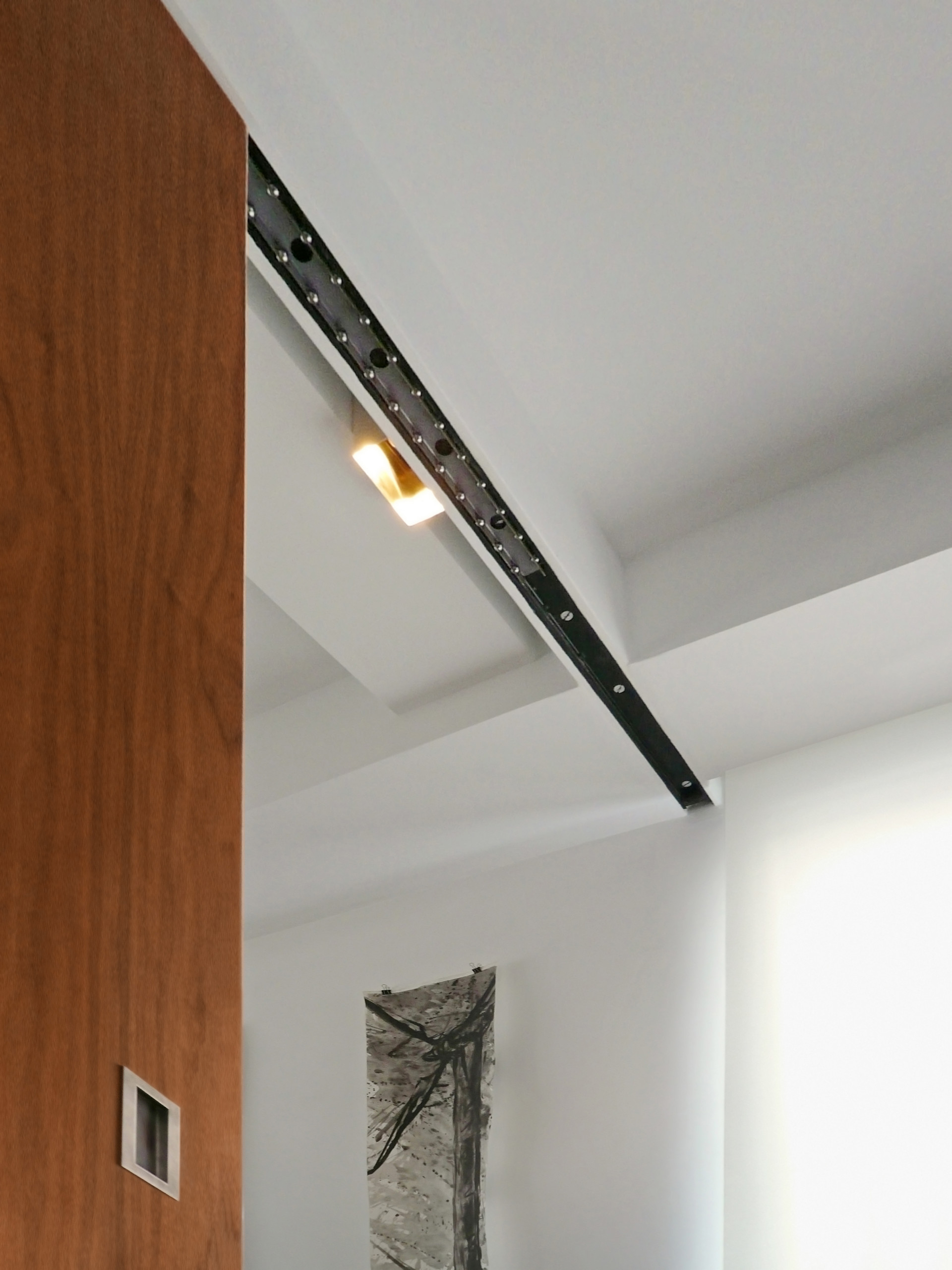 Au départ, les portes coulissantes s’adressaient aux placards. C’était des portes très légères, emprisonnées sur des rails en haut et en bas. Aujourd’hui, l’offre a beaucoup évolué pour pouvoir équiper tout type de portes intérieures. Pour David Laredo, il est une règle incontournable : « On n’emploie pas de rail au sol ! » Ce n’est pas très esthétique et il peut être blessant pour les pieds nus.