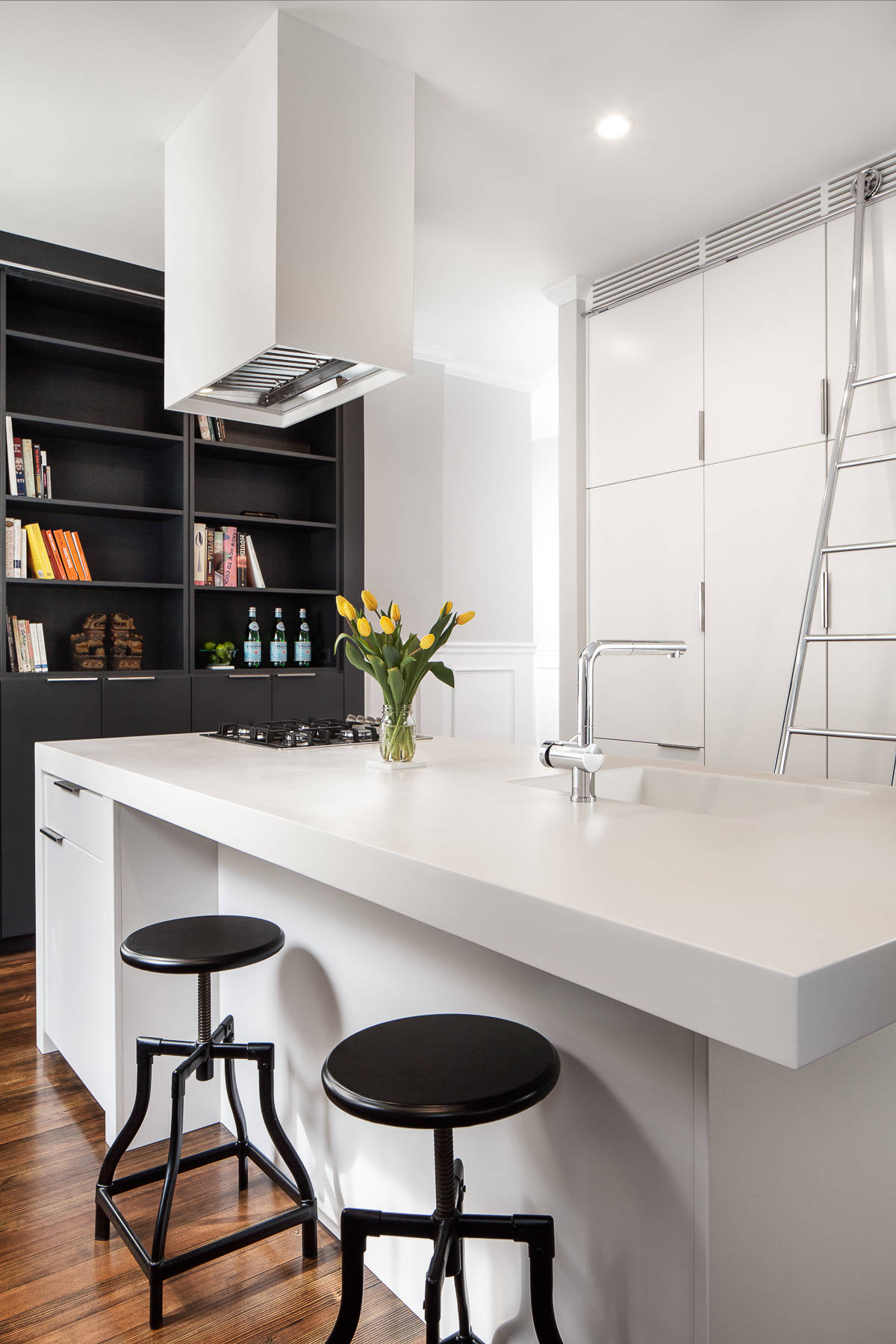 Le Corian se présente en plaques de 11 ou 6 mm qui permettent de réaliser des plans de travail très fins ou épais, de réaliser un îlot complet comme s’il était monobloc. On commence toujours par faire en dessous un support en bois, puis on applique dessus les plaques de Corian. On peut le travailler en de longues dimensions sans aucun joint visible et même faire une continuité avec la crédence par collage chimique, ce qui est plus hygiénique. Le joint n’est jamais apparent, ne jaunit pas. Je dirais que par rapport aux autres matériaux, c’est un vrai plus.