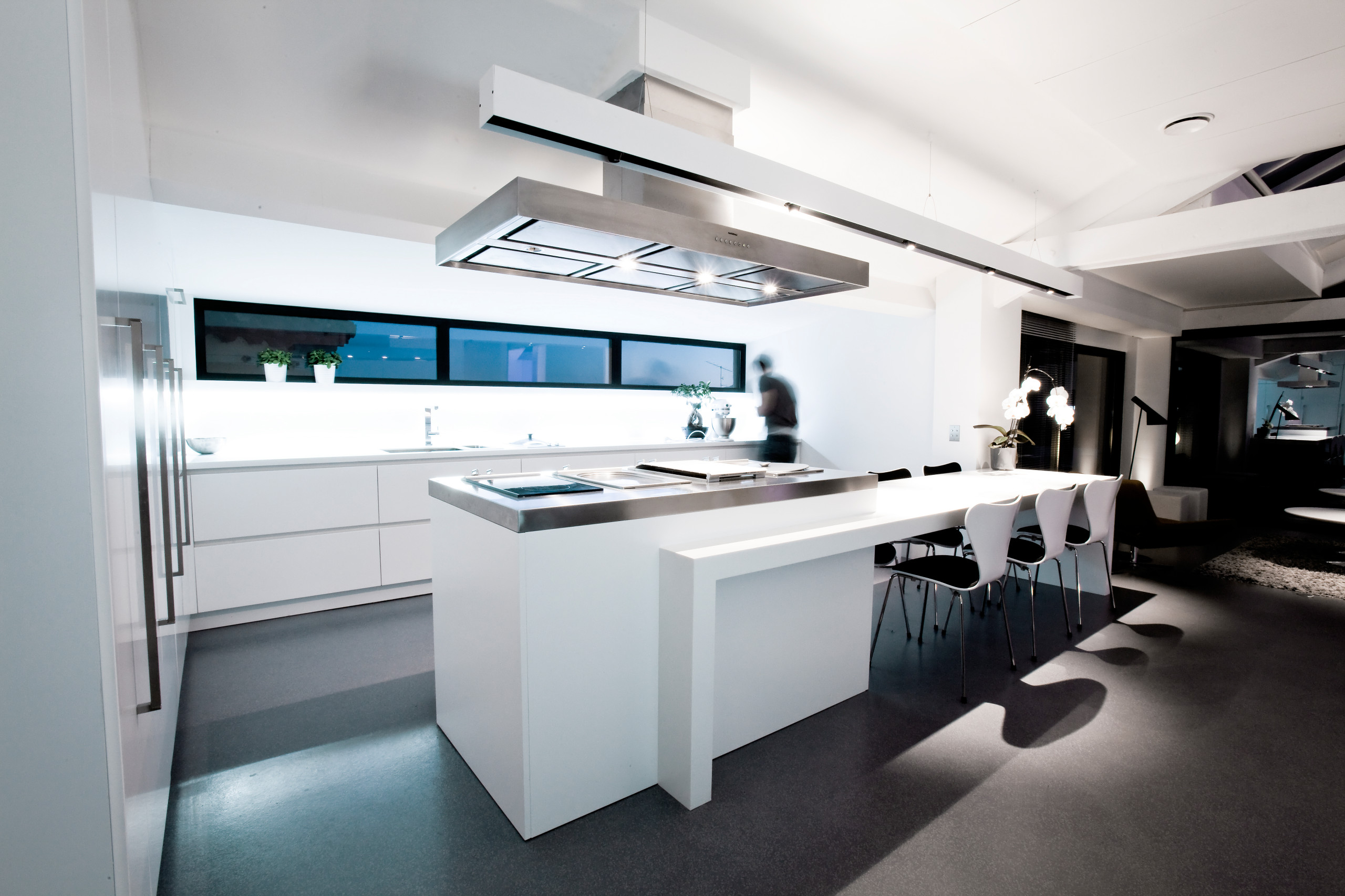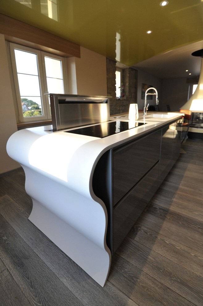 On peut aller encore plus loin avec le Corian, car il est thermoformable, c’est-à-dire cintrable à 160°. Toutes les fantaisies sont permises. On peut réellement dire que c’est un matériau sans limite. Pour cela, il faut néanmoins être équipé d’un four spécial. Il est alors possible de réaliser des formes organiques, à l’image du jambage ondulant de cet îlot.