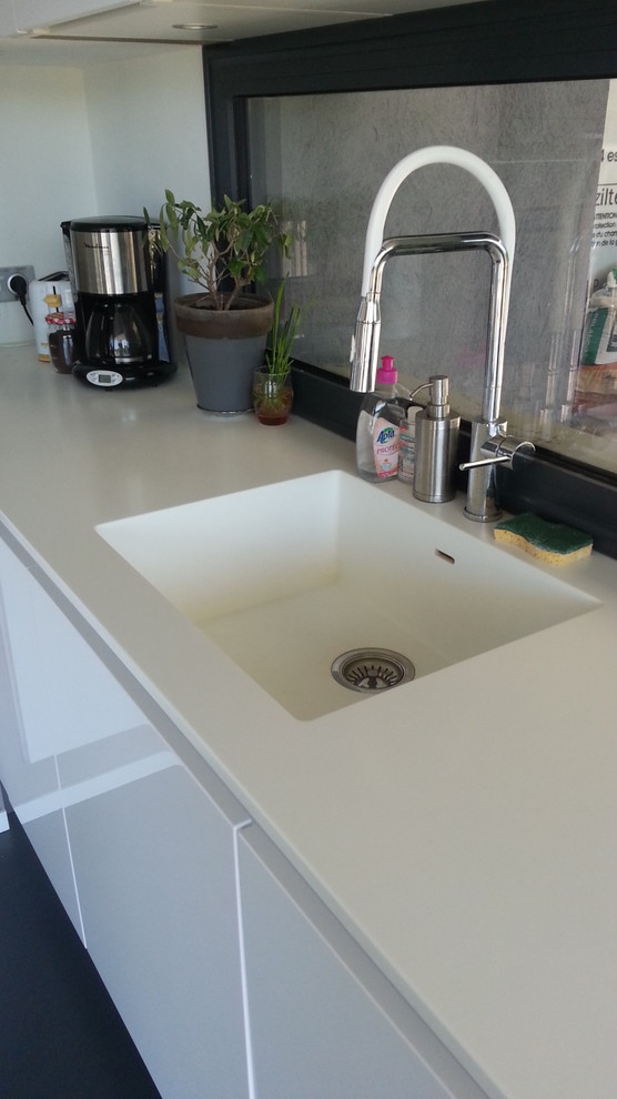 Dupont vend des cuves assorties, ce qui permet de coller le plan à l’évier et d’obtenir un résultat monolithique. Tout semble taillé dans le même bloc ce qui est à la fois très design et très hygiénique. On peut également associer un plan Corian avec un évier Inox posé sous le plan. Dans ce cas, on jointe simplement au silicone les deux matériaux.