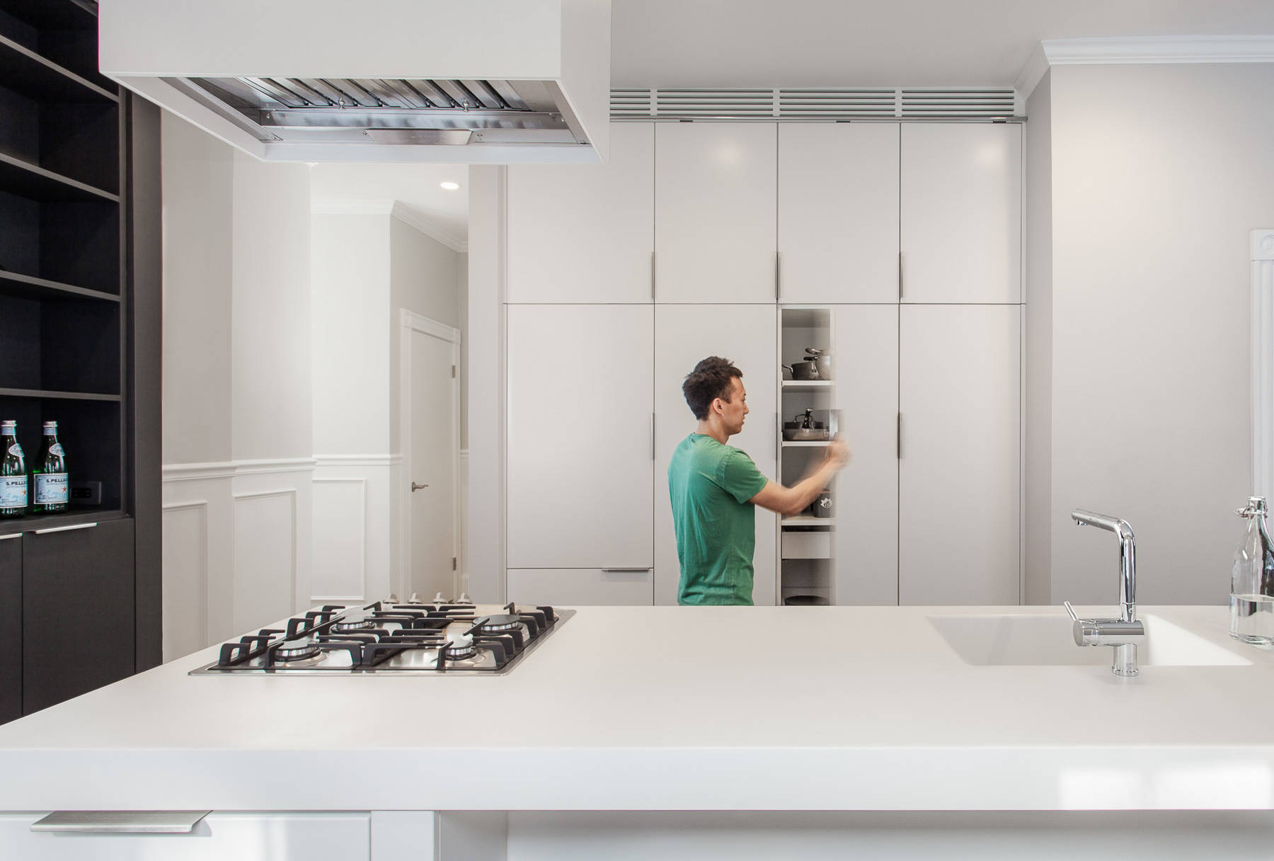 Nous l’avons compris, Nicolas Duchateau préfère travailler le Corian, le matériau qui a ouvert la voie aux Solid surface. Mais nous avons néanmoins cherché à en savoir davantage sur ses cousins, dont le Krion, qui compose le plan de travail de cette photo, est l’un des représentants. Ils seraient moins chers, avec des déclinaisons de couleurs différentes, parfois avec une garantie plus longue (quinze ans pour le Hi-Macs) mais semblables à travailler, nous a affirmé un menuisier. Un forum de consommateurs assure que le Corian serait le plus solide dans le temps, mais impossible de nous faire confirmer cette information. Que tous ceux qui auraient des points de comparaison fiables entre ces matériaux n’hésitent pas à nous éclairer !
