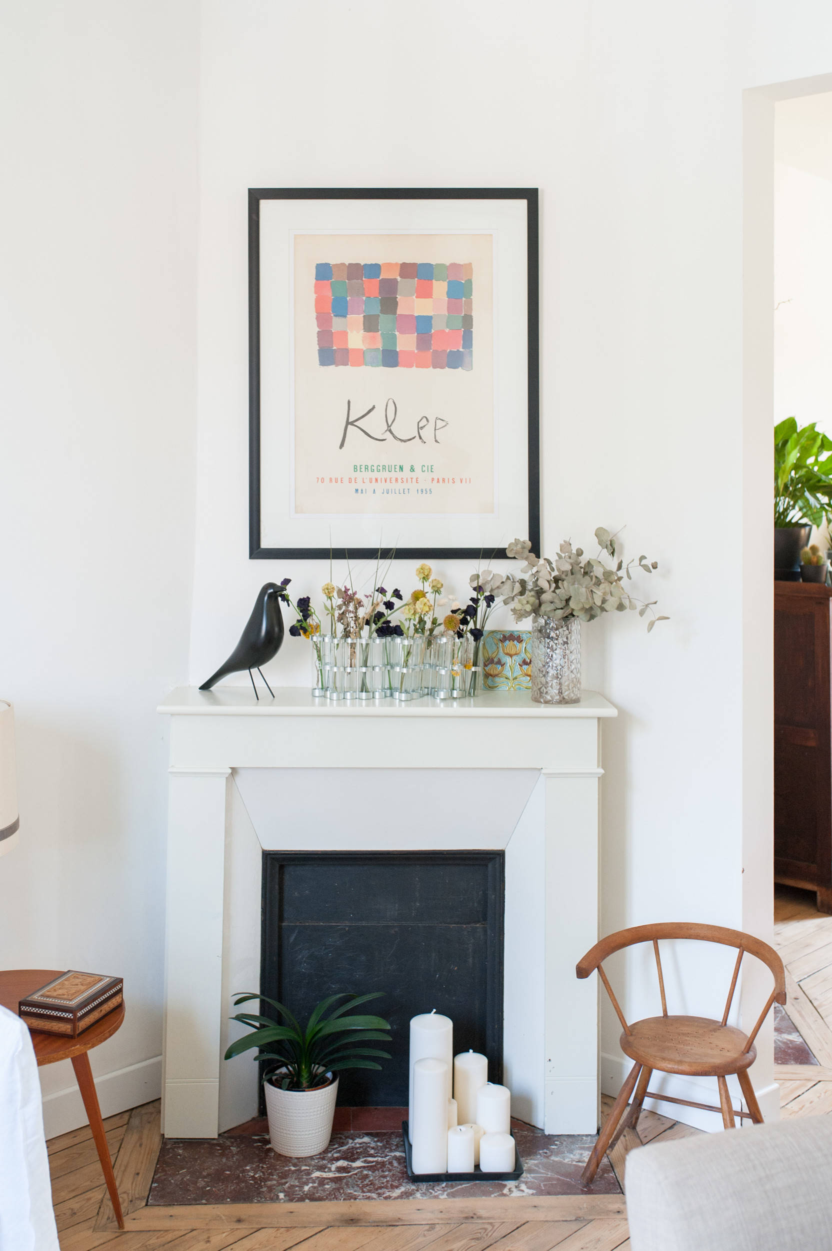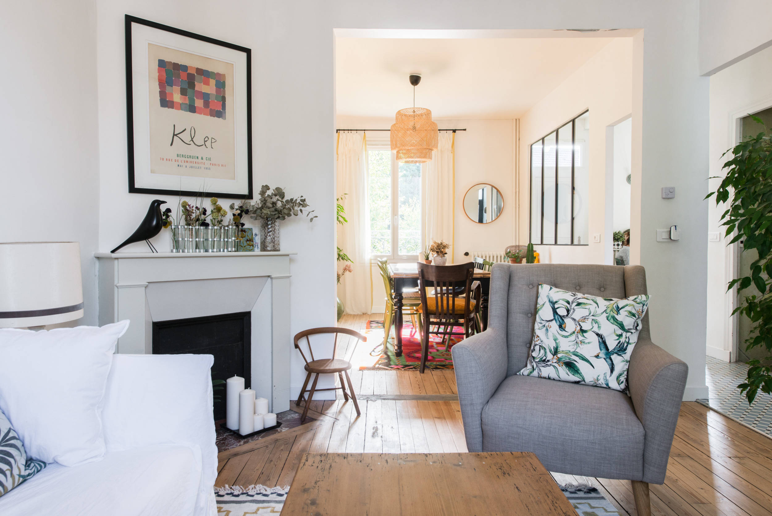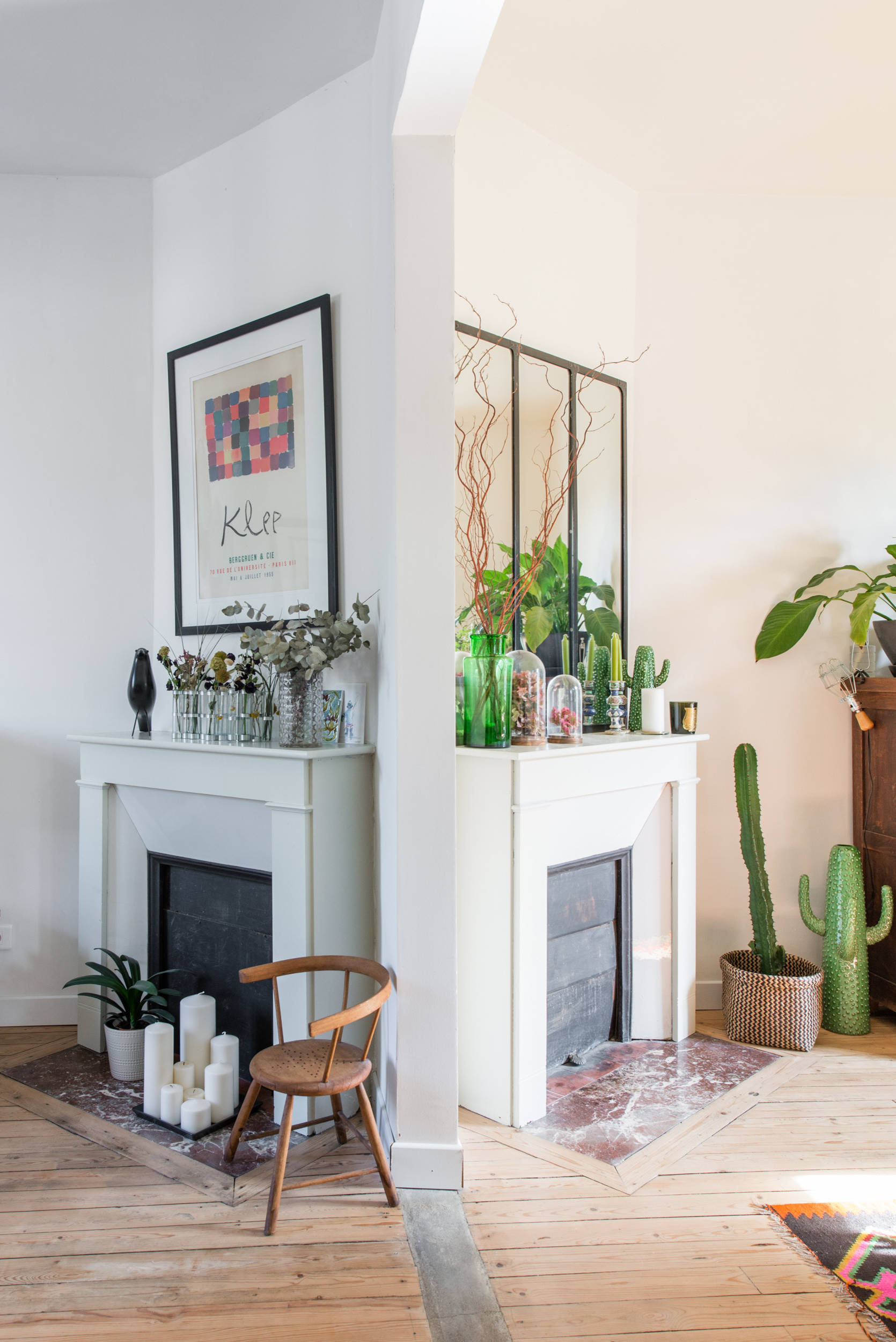 Autre avantage des cheminées : elles offrent un support idéal pour mettre en valeur de petits accessoires déco. « J’adore mélanger les époques, associer des trouvailles à quelques objets iconiques pour lesquels j’ai économisé et patienté », explique Béatrice. Dans le salon, par exemple, on aperçoit le vase d’Avril de chez Tsé Tsé, la suspension Vertigo de chez Petite Friture ou encore le canapé Ghost dessiné par Paola Navone pour Gervasoni. On aperçoit aussi le petit fauteuil en bois qui permet au petit Paul de s’installer confortablement pour dessiner sur la table basse.