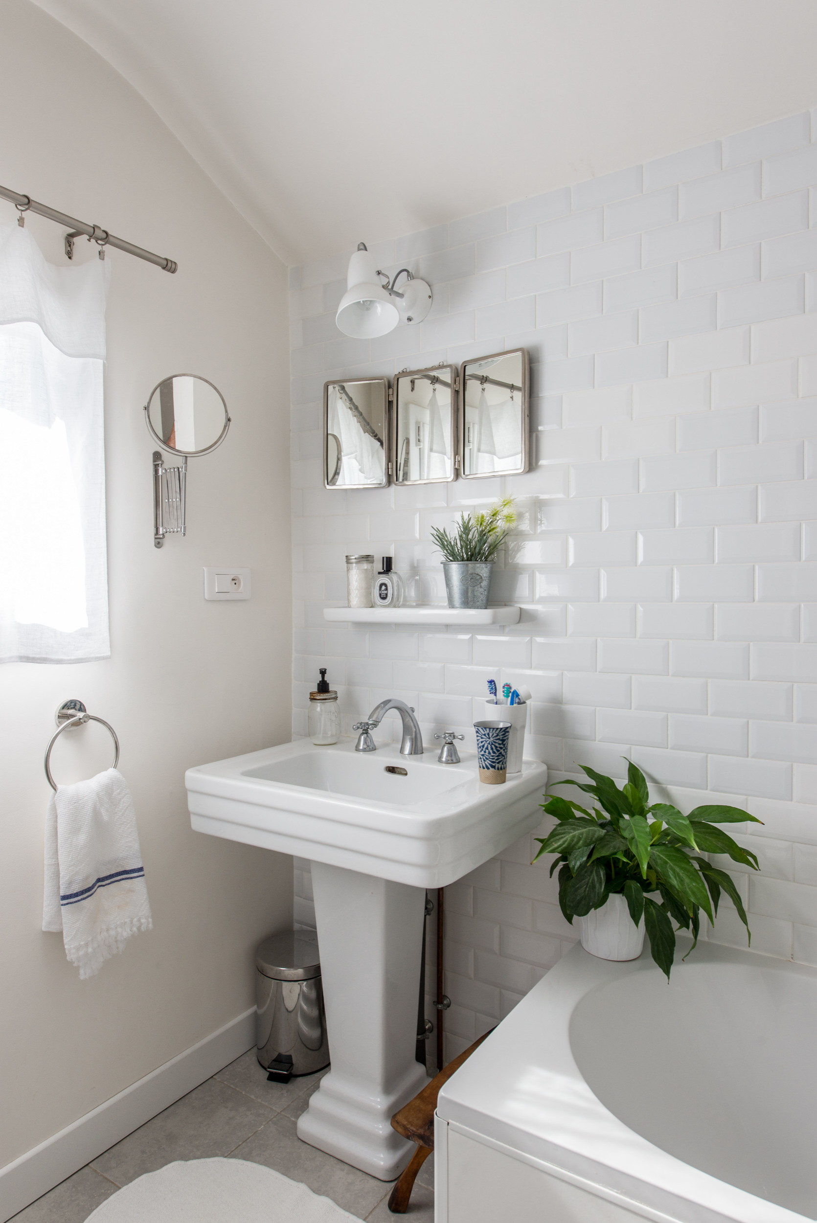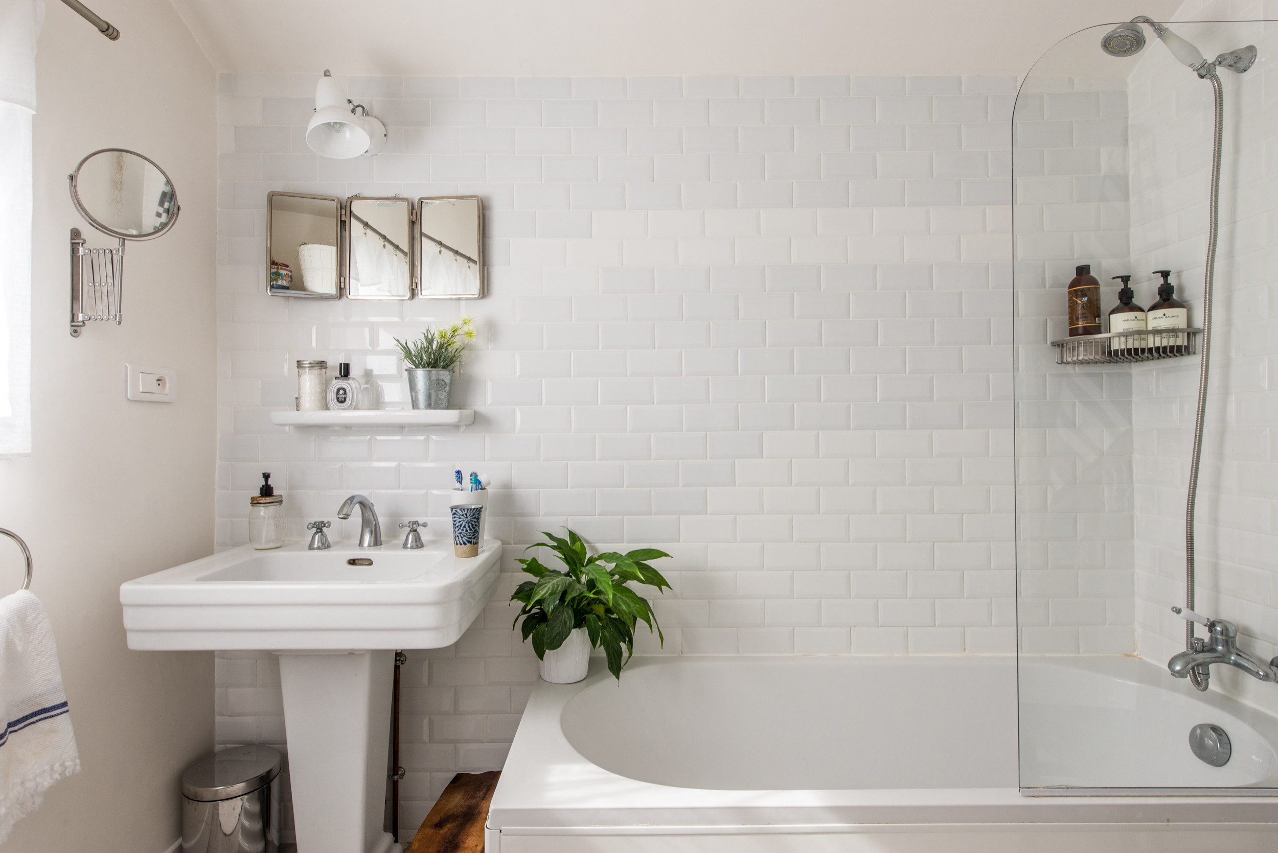 « J’avais envie d’une salle de bains inspirée des années 30 pour rester fidèle à l’histoire de la maison », explique Béatrice. « J’avais très envie de carreaux de ciment, mais comme il y avait déjà ce type de motif dans l’entrée et que mon mari n’en raffole pas, nous avons plutôt opté pour des carreaux de métro. »