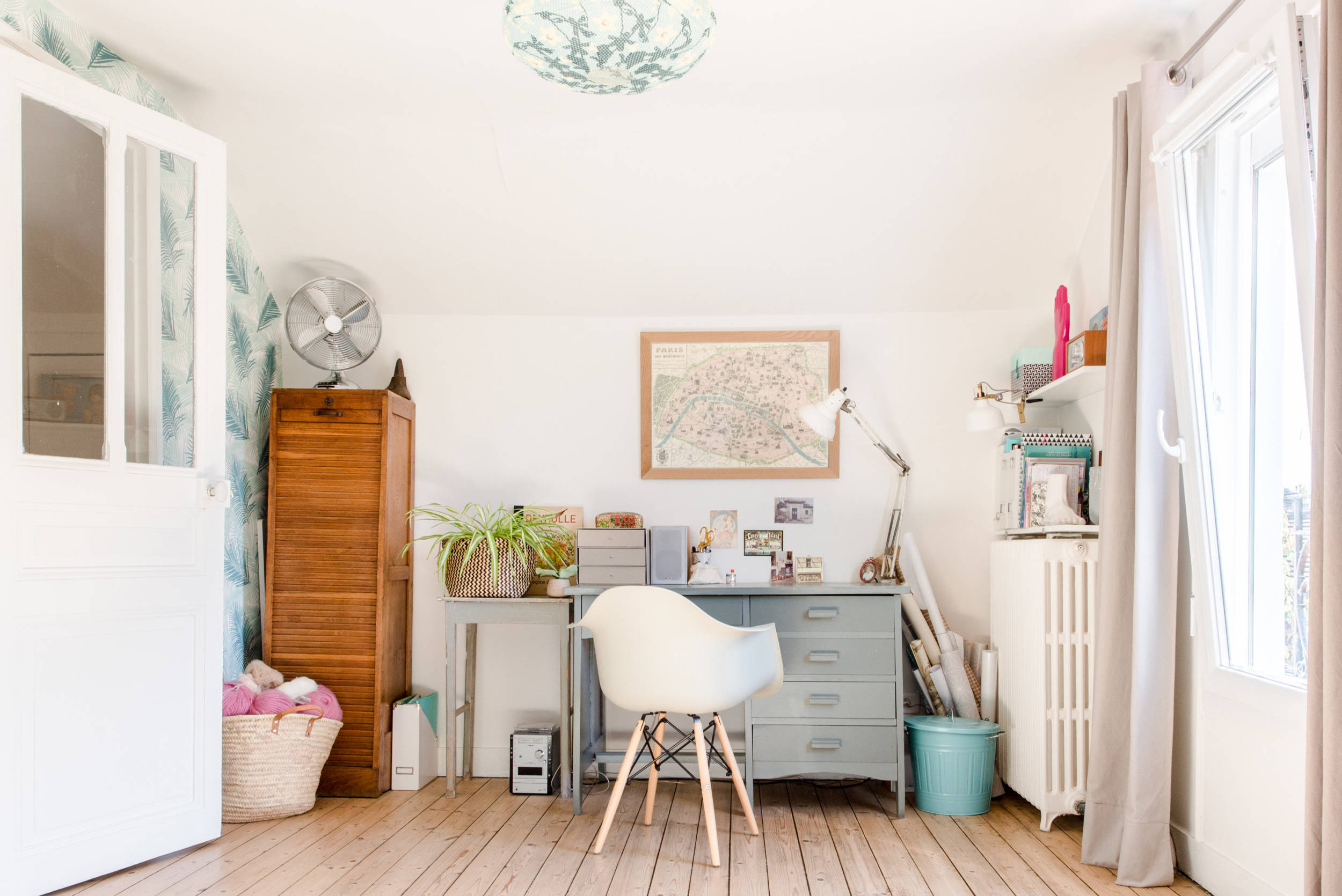 Vase pied : Fleux’ ; Carte de Paris : Le Petit Florilège ; Ventilateur : Castorama ; Gant rose : chez Fish Eddy, une boutique située à New York