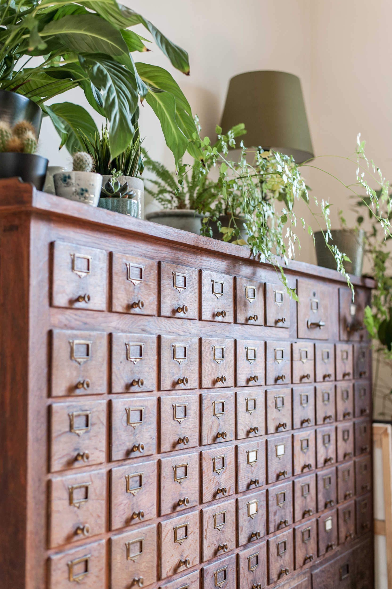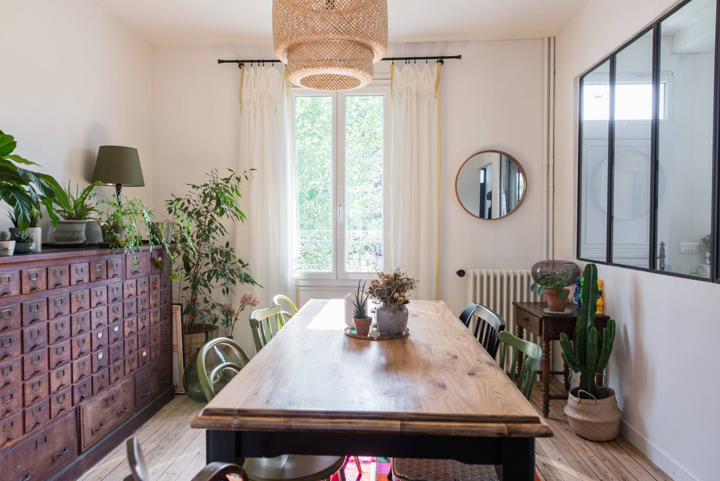 La décoration de la salle à manger traduit le goût de Béatrice pour la chine. Ici, rien n’est neuf, à commencer par le grainetier, déniché sur Le Bon Coin. « L’astuce, quand on chine sur Internet, c’est de ne pas se fixer de date limite : il faut prendre le temps de chercher ! », explique-t-elle. « Je rêvais de trouver un meuble de ce type, alors j’ai regardé tous les jours avec le même mot-clé et en me fixant un budget. »