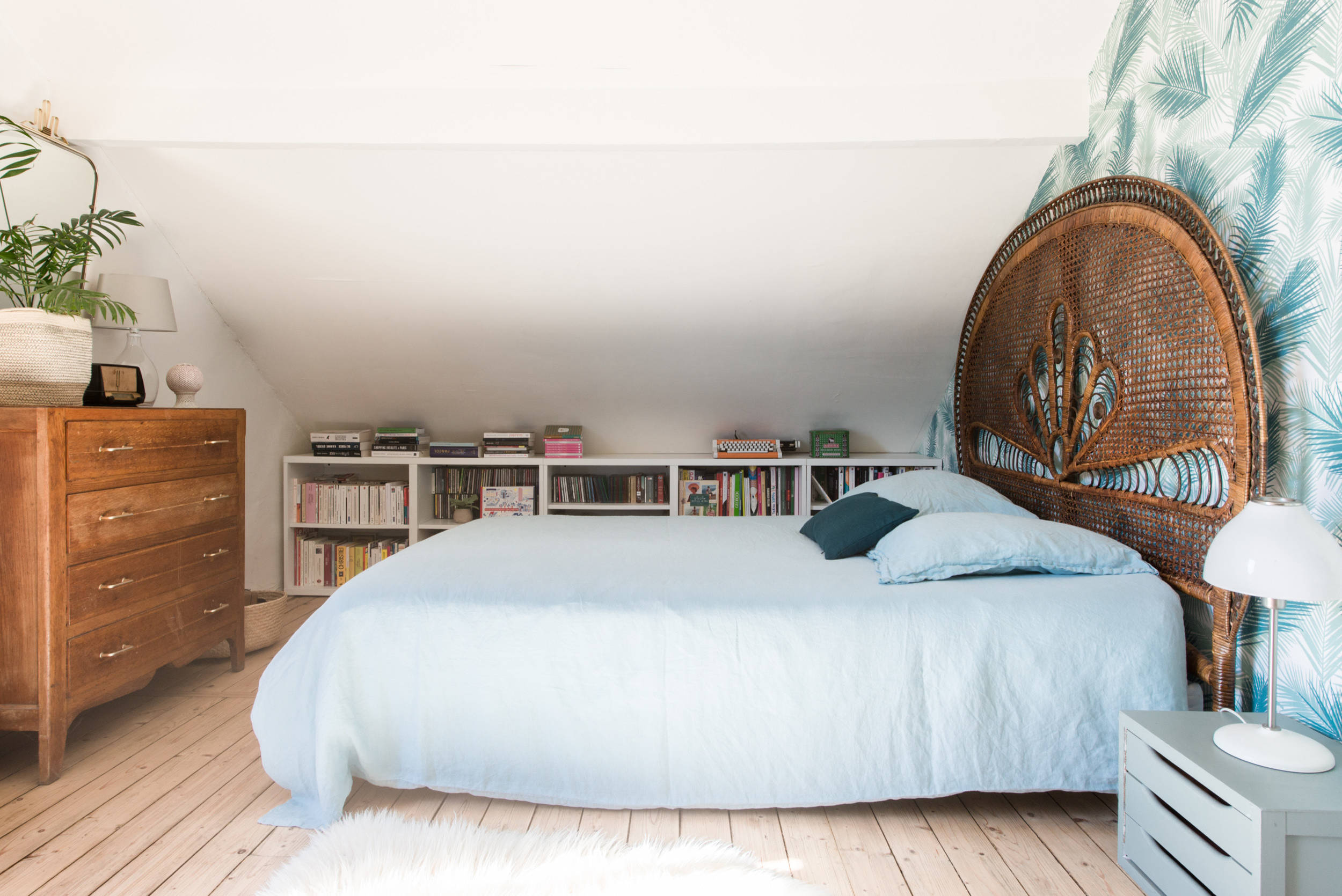 Peau de mouton et modules de rangement : Ikea ; Tête de lit : chinée sur Internet ; Linge de lit : La Redoute ; Papier peint : Leroy Merlin (n’est plus disponible)