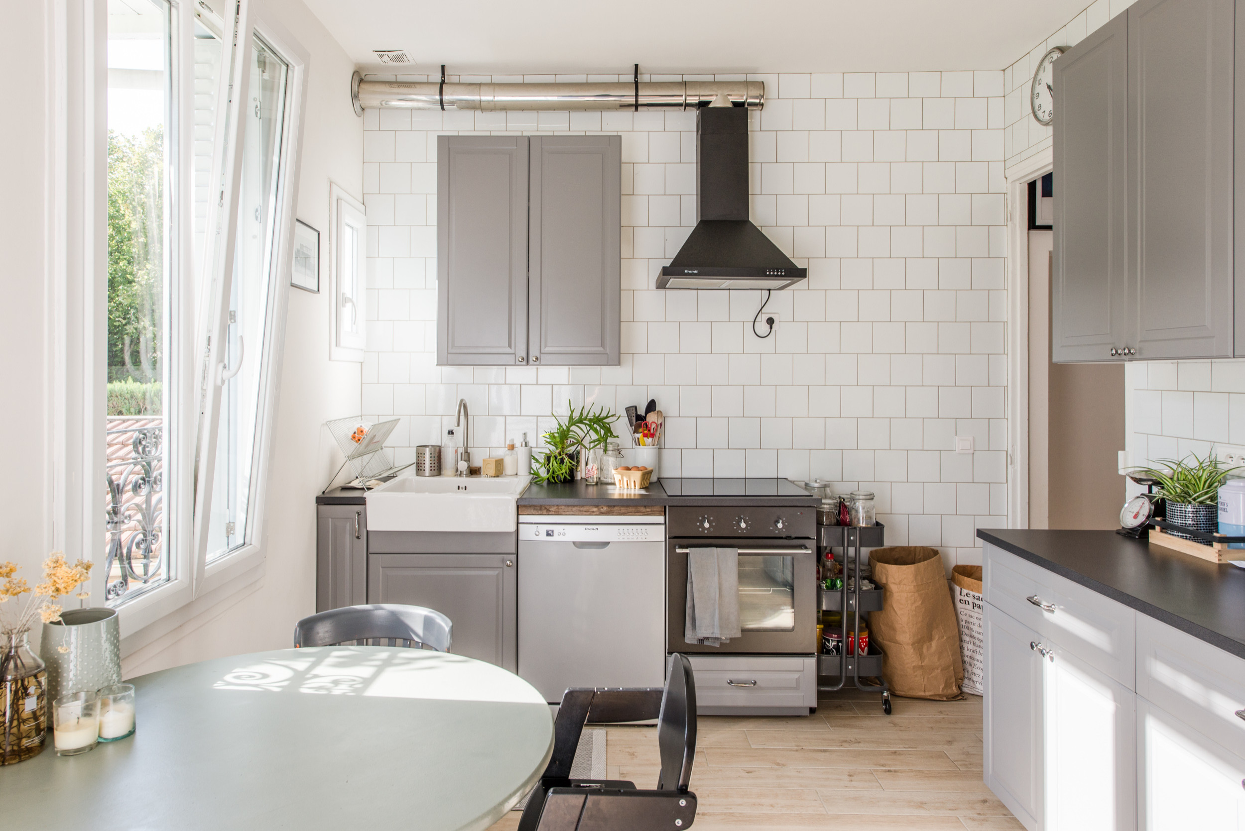 Inspirée des aménagements scandinaves, la cuisine installée par le couple affiche un côté labo parfaitement assumé. Des carreaux blancs style métro sont ainsi associés à des meubles gris tandis que la hotte est reliée à l’extérieur grâce à un tube en Inox fabriqué par le père de la jeune femme. Au sol, un carrelage imitation bois réchauffe la pièce. Il a remplacé le même carrelage des années 80 qui recouvrait le couloir de l’entrée et s’étend dans le dressing, les toilettes et la chambre du couple.