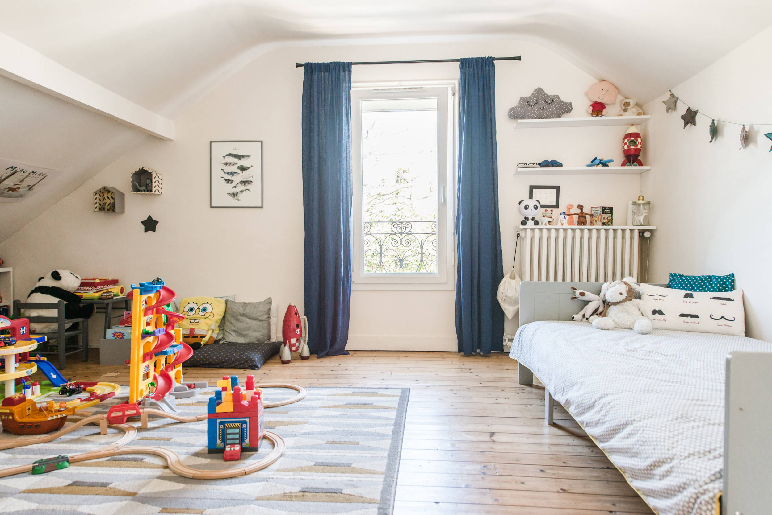 Résultat : la chambre du petit garçon de 4 ans est suffisamment vaste pour accueillir un espace jeu délimité par un tapis. Près de la fenêtre, un petit coin lecture a été aménagé avec des coussins de sol récupérés et recouverts de tissu. « J’essaye de faire avec ce que j’ai déjà pour jeter un minimum », explique Béatrice. « De la même façon, je prends le temps de réfléchir pour éviter les achats compulsifs. Objectif : arrêter de surconsommer ! »