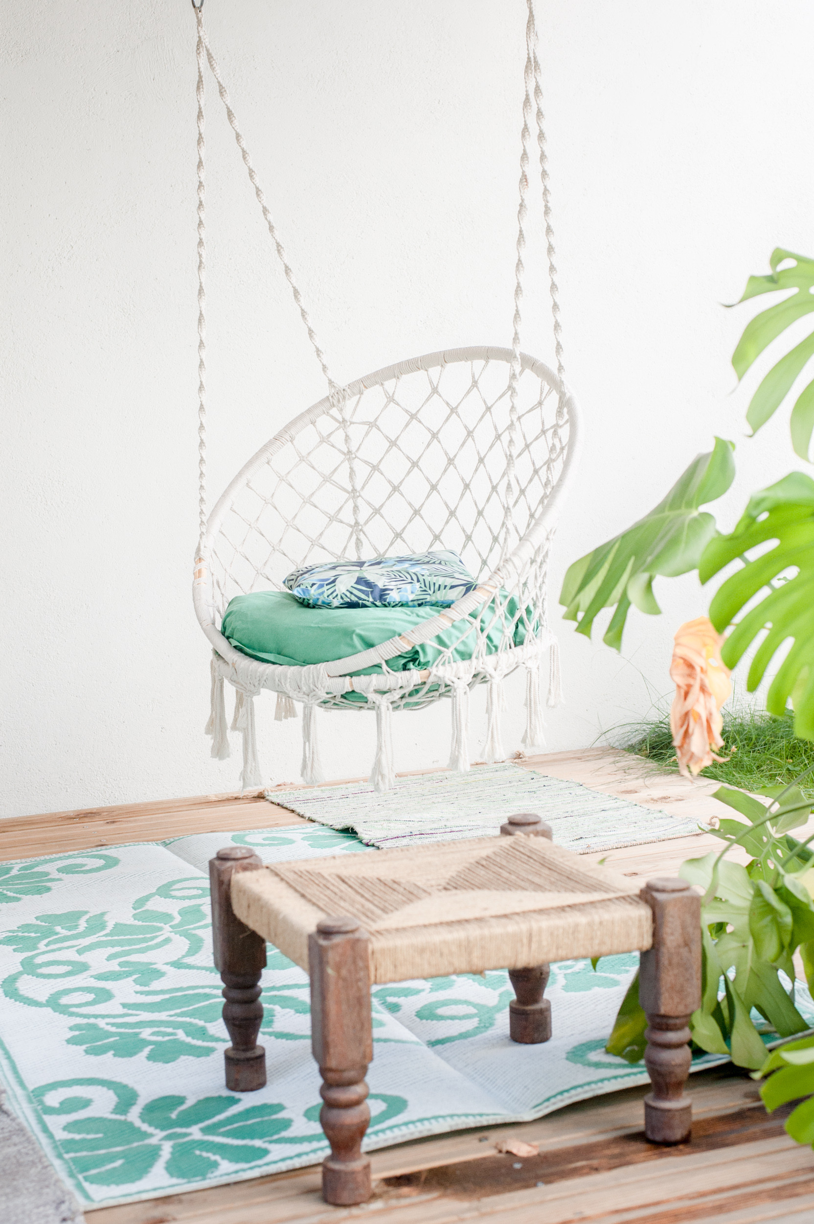 Tapis : H&M Home ; Fauteuil suspendu : La Redoute ; Suspension bleu marine : Ikea ; Suspension blanche : Alinéa