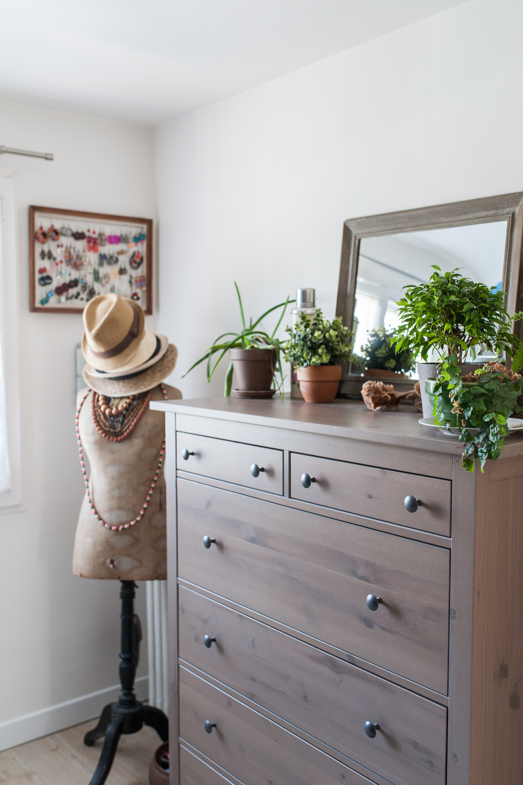 Nous voici dans l’espace dressing aménagé dans la pièce attenante à la chambre. Au mur, Béatrice a accroché un cadre sur lequel elle a fixé un morceau du voile de mariée de sa mère pour y suspendre ses boucles d’oreilles. Déniché sur Le Bon Coin, le buste de couturière lui permet de garder chapeaux et colliers à portée de main. « Il est ancien, je l’adore ! Le tissu est délavé et on voit même les trous d’aiguilles plantées dedans », ajoute la jeune femme.