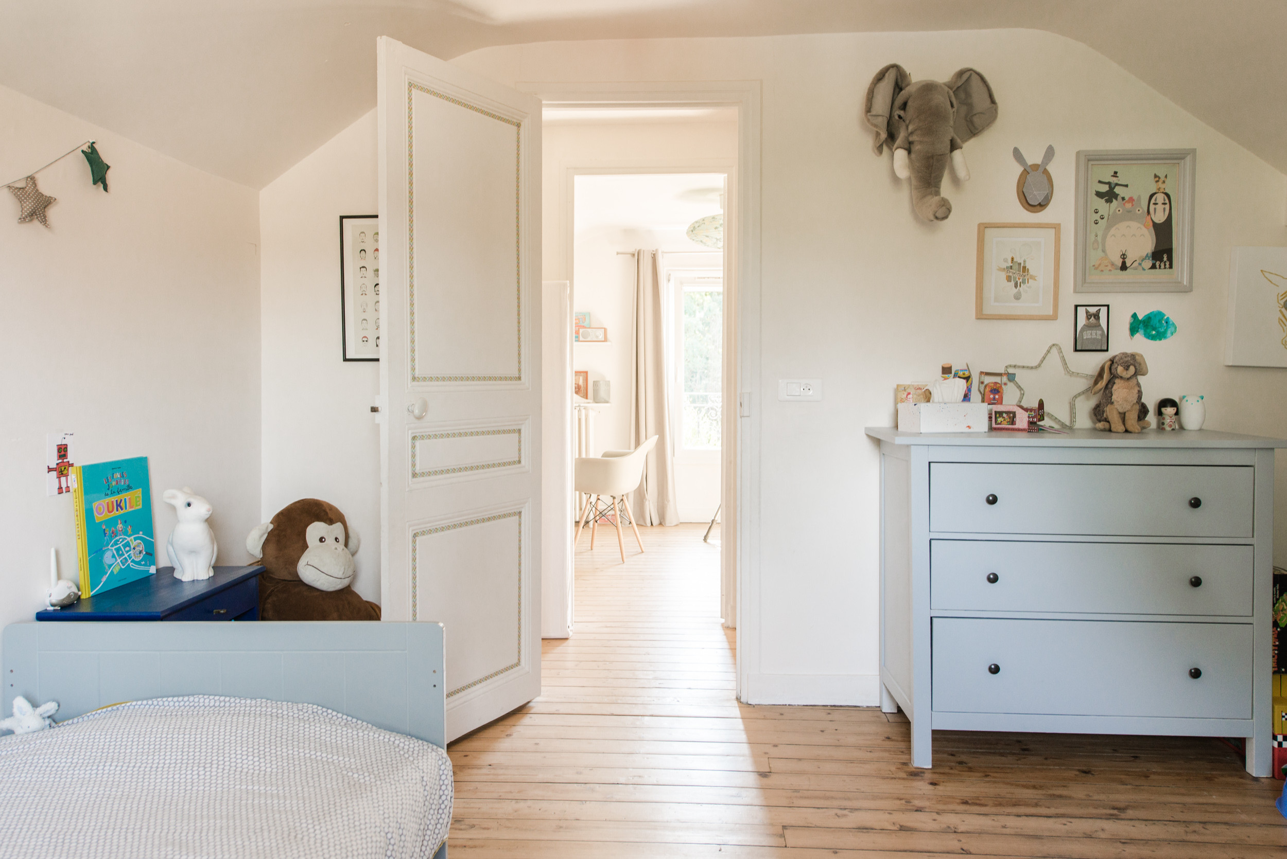 À l’étage, on a aménagé la chambre de Paul, à gauche lorsqu’on arrive sur le palier, et la chambre d’amis, à droite, où se situe également le bureau de Béatrice. Chaque pièce était séparée d’un petit grenier attenant par une cloison, abattue pour gagner en surface.