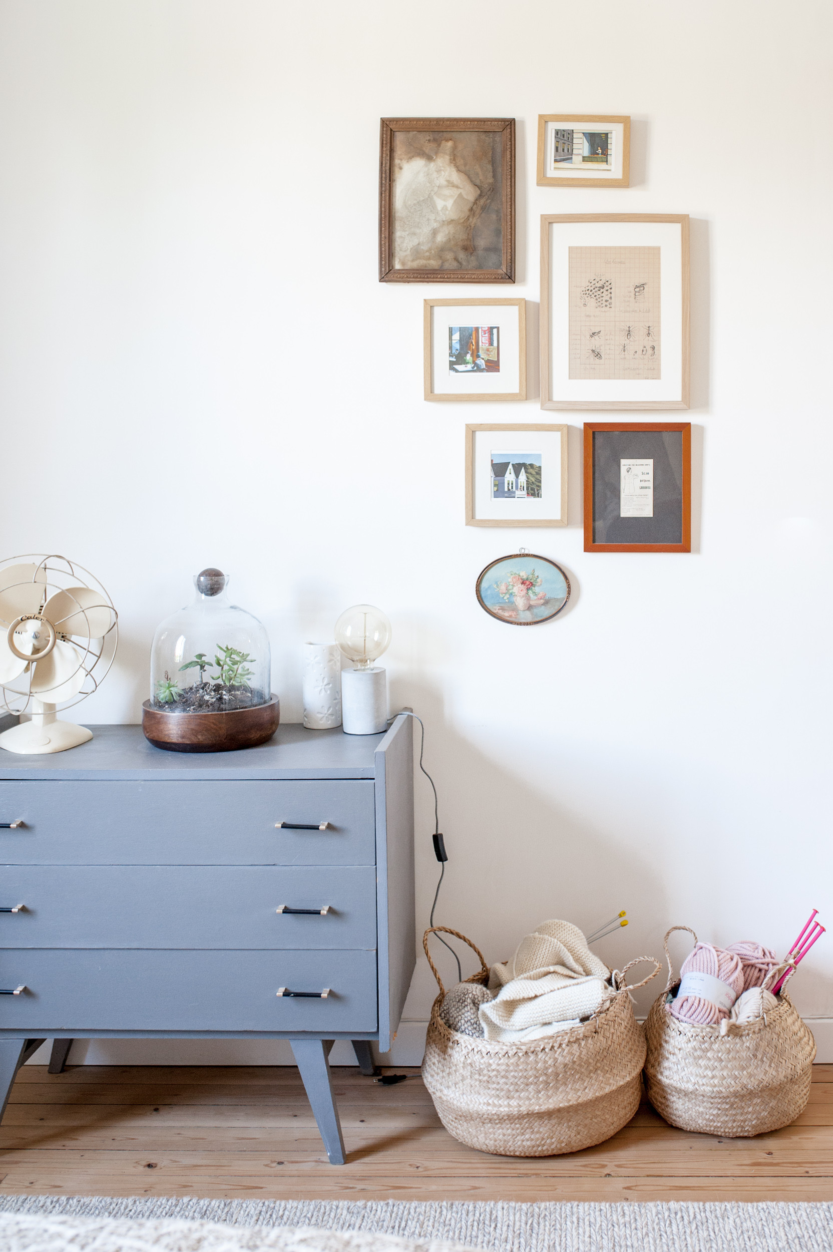 Parmi les rares meubles présents dans la chambre, cette commode a été chinée. Au mur, une composition de cadres mêle des cartes postales, une photo et une aquarelle.