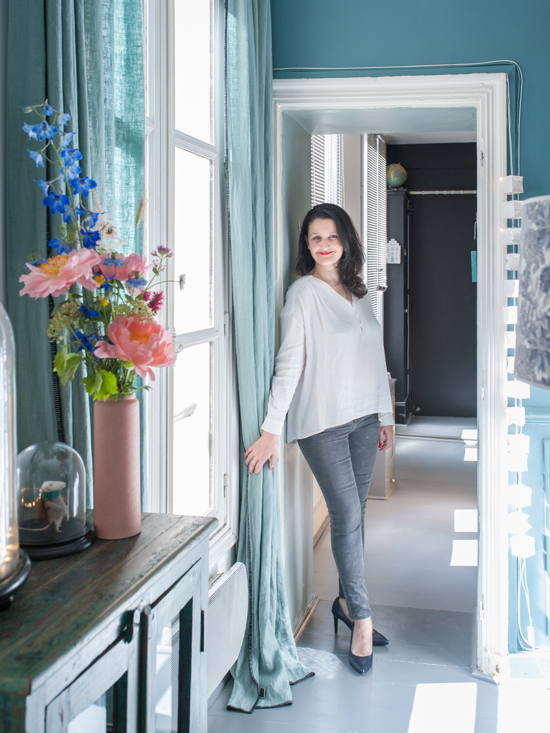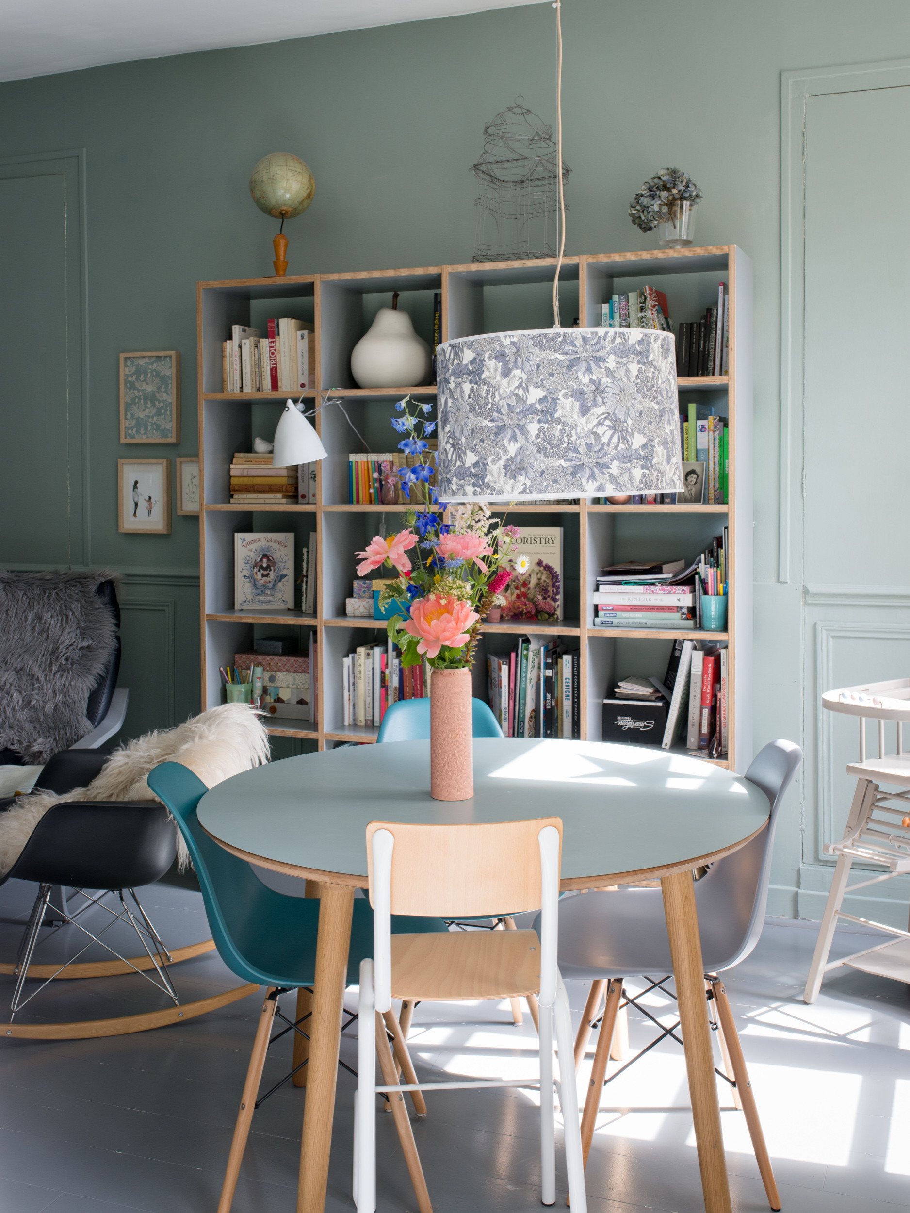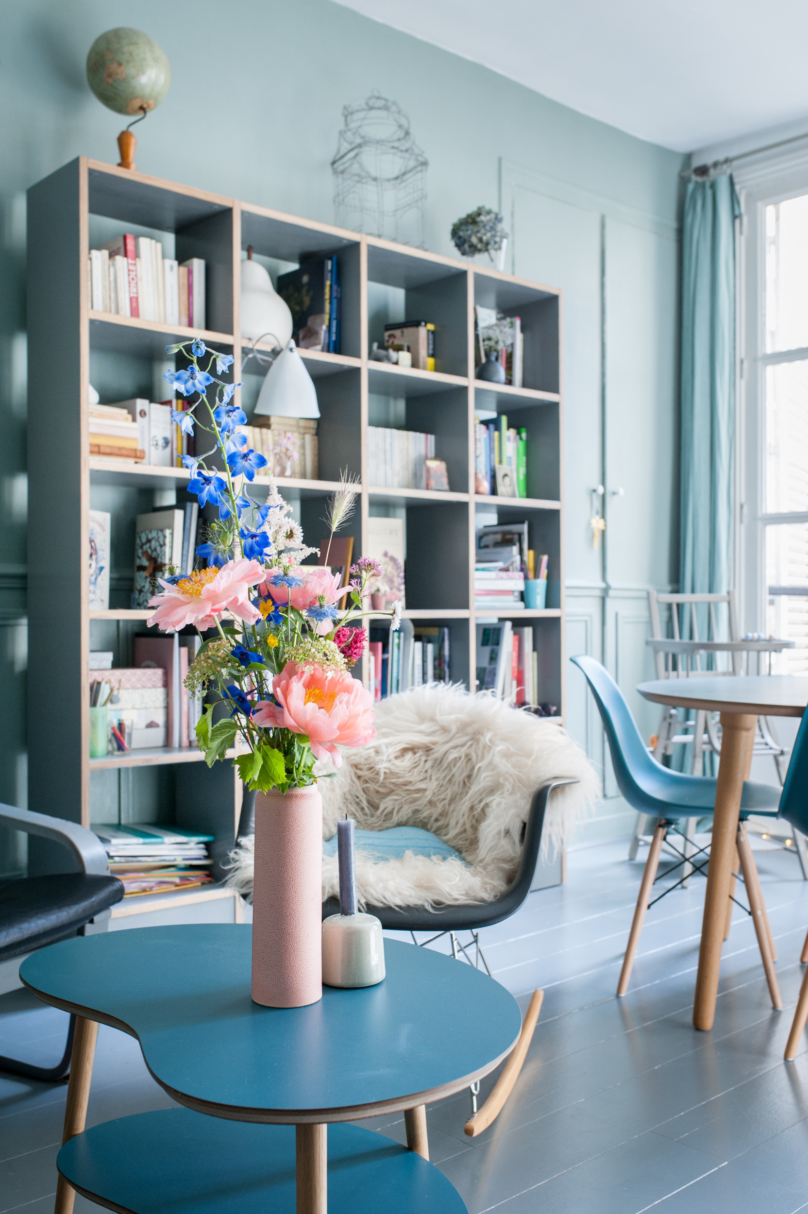 En arrière-plan, la bibliothèque en bois a été relookée en quelques coups de pinceaux. « Le bois brut lui donnait une allure trop massive », explique la jeune femme. La cage à oiseaux que l’on aperçoit, posée dessus, sert à la création de compositions florales.