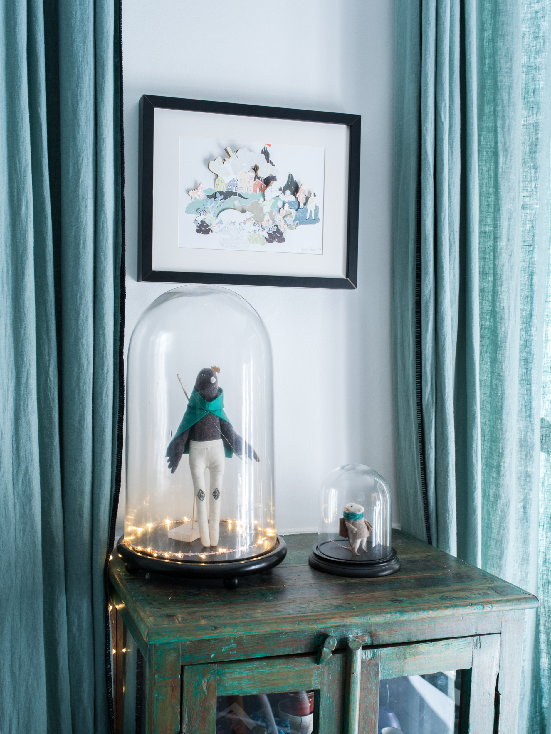 Mis en scène sous un globe de mariée, cet oiseau est l’un des objets fétiches d’Elodie. « J’adore les sculptures en tissu ! », confie-t-elle. « Les mettre sous cloche permet de créer un mini-cabinet de curiosités. »