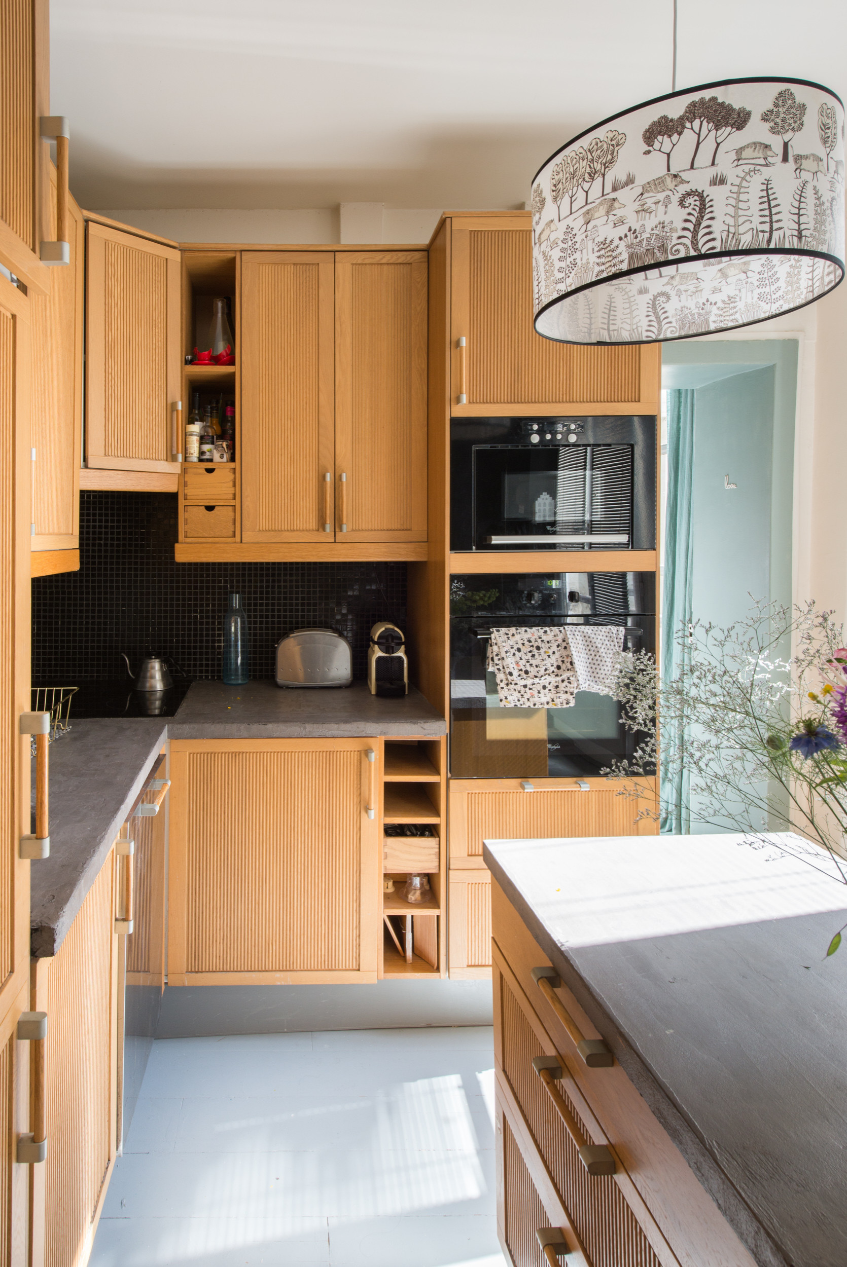 En face du vaisselier, la cuisine en L avec îlot est d’origine. « Nous avons remplacé un plan de travail en mélaminé noir imitation marbre, pas très joli, par du béton », précise Elodie. Prochaine étape : repeindre les meubles dans une teinte verte avant d’avoir suffisamment de budget pour rénover entièrement la pièce.