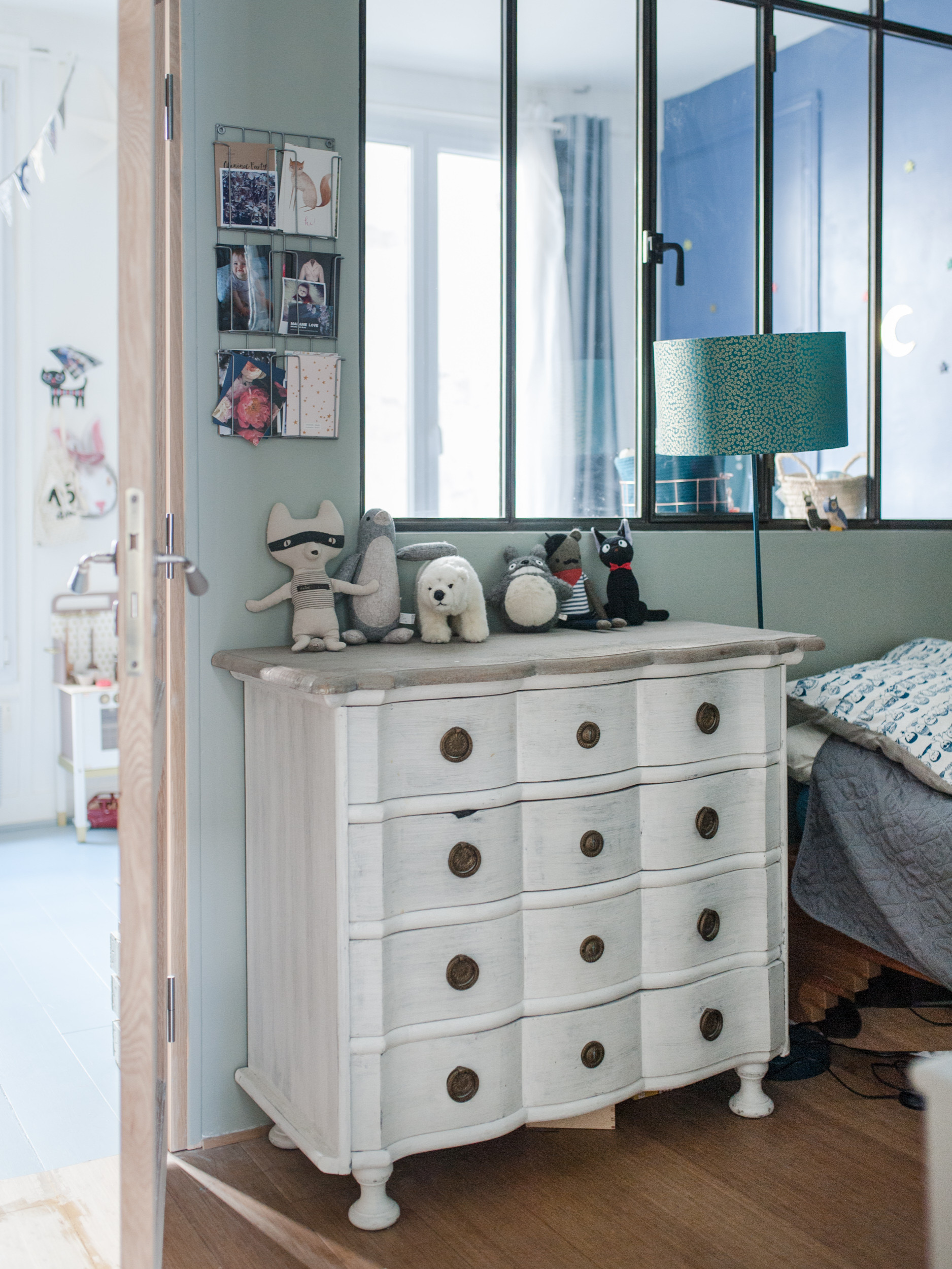 Peinture : Green Smoke chez Farrow & Ball ; Souris suspendue : Rose Minuscule ; Abat-jour recouvert de papier japonais : Adeline Klam ; Commode : AM.PM