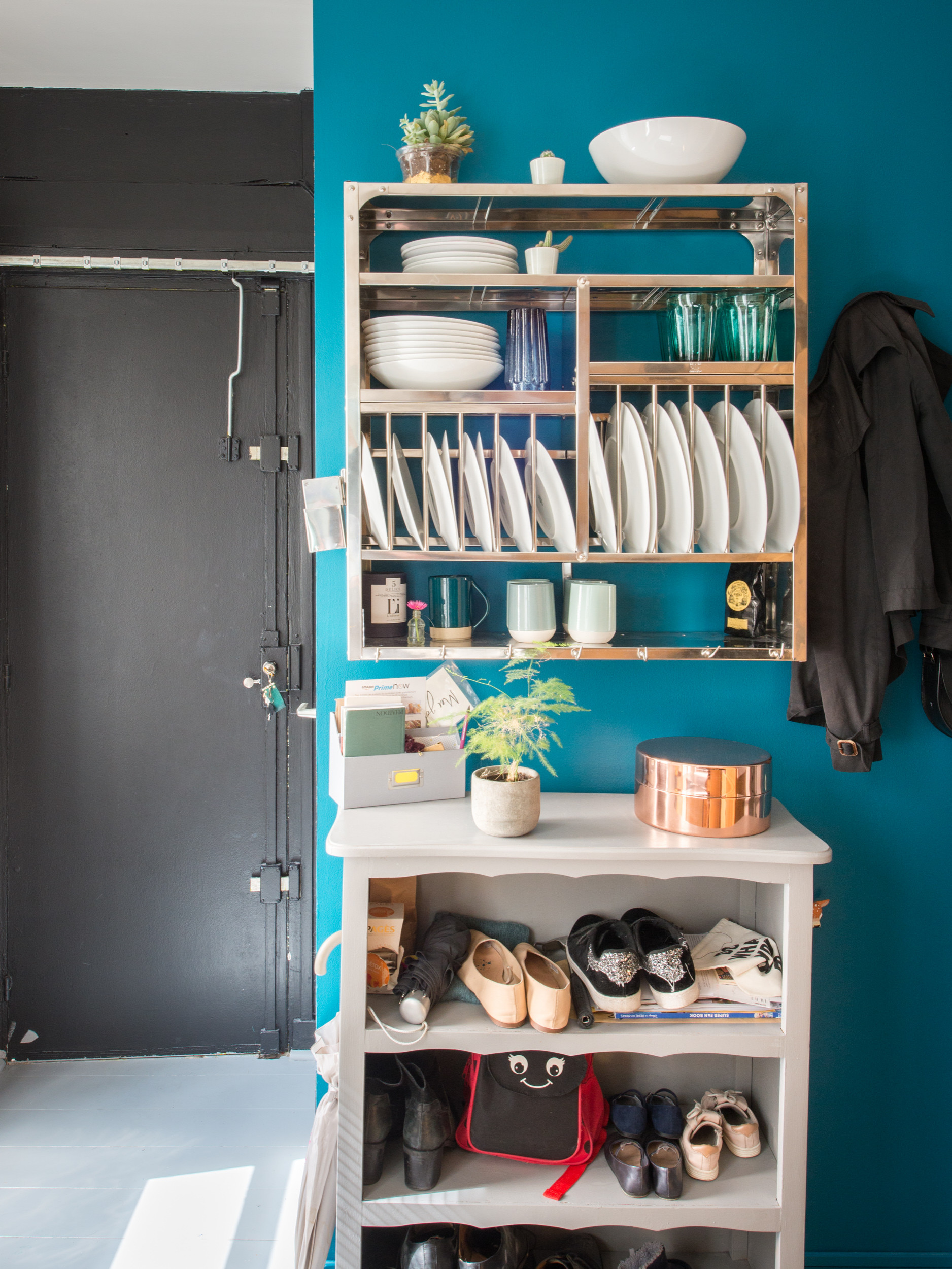 Accroché au mur, le vaisselier indien permet de ranger les assiettes à la verticale. « Ça peut surprendre, mais c’est très pratique ! », ajoute Elodie.