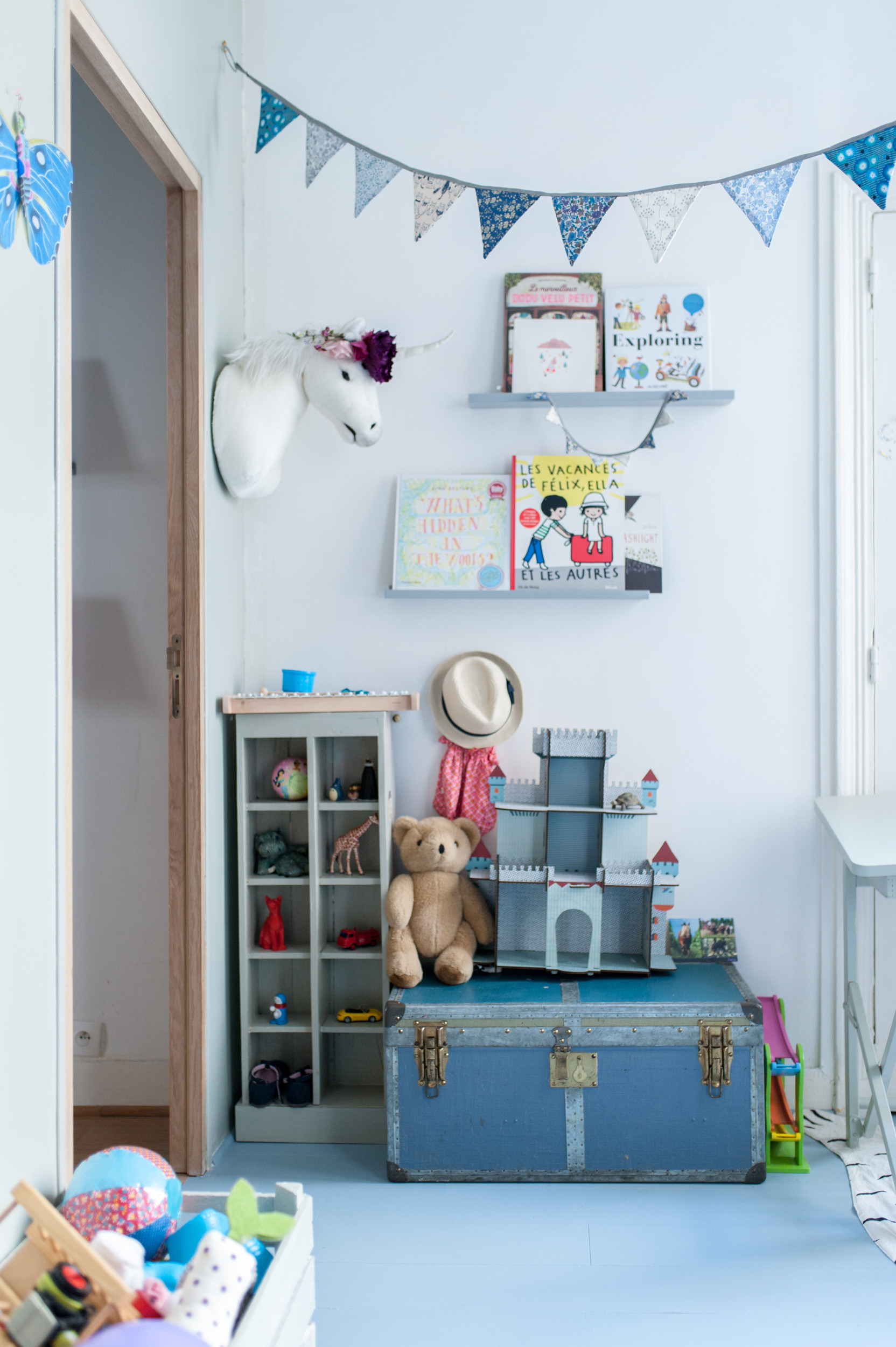 Elodie aussi a des talents de couturière, comme en témoigne la guirlande de fanions qui crée une ambiance festive dans le coin jeu de la chambre. « Je l’ai fabriquée à partir de tissus Liberty, Petit Pan et Jansdotter », confie-t-elle. Un soin de détail qui souligne, une fois de plus, l’envie du couple de projeter un univers très personnel dans leur foyer.