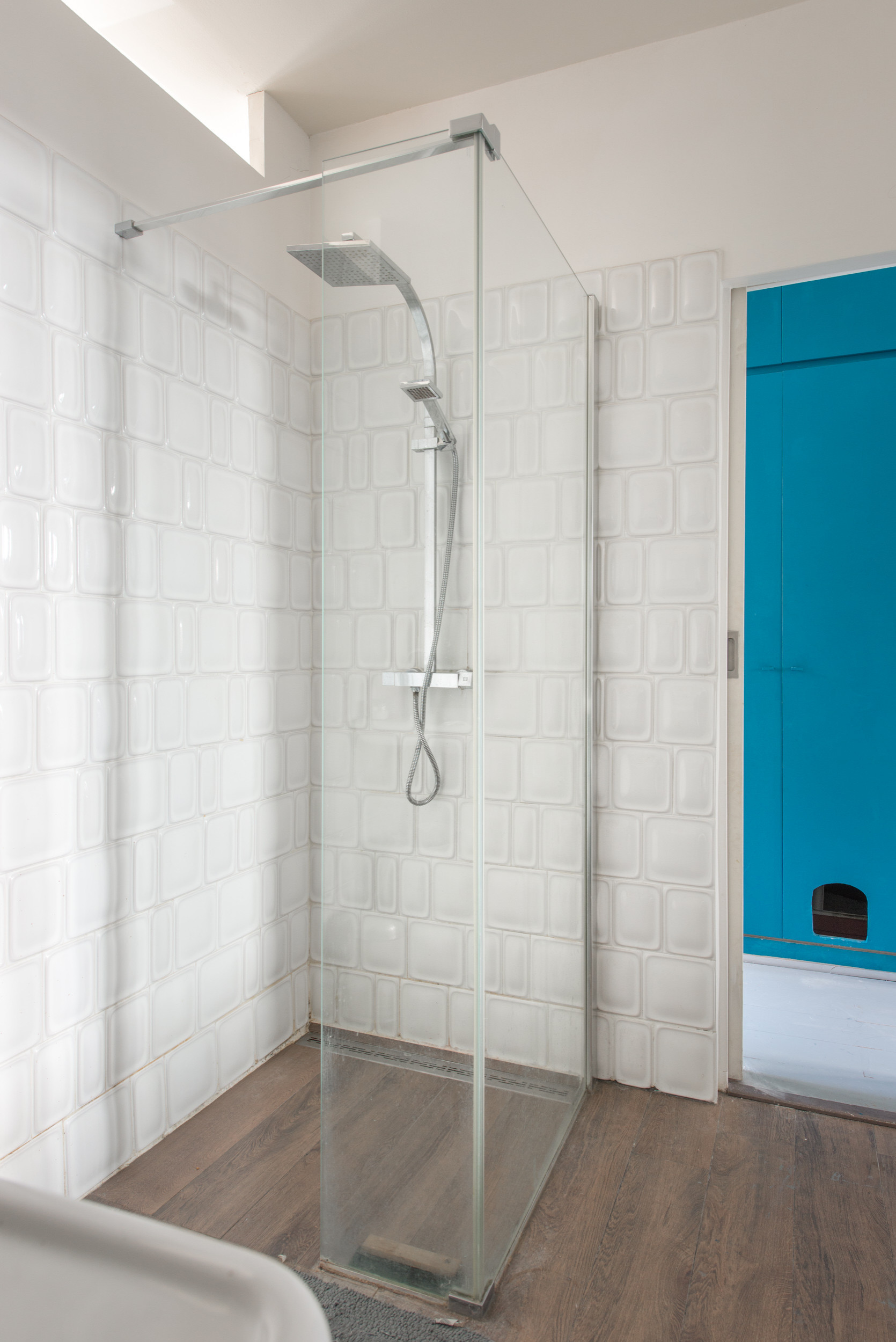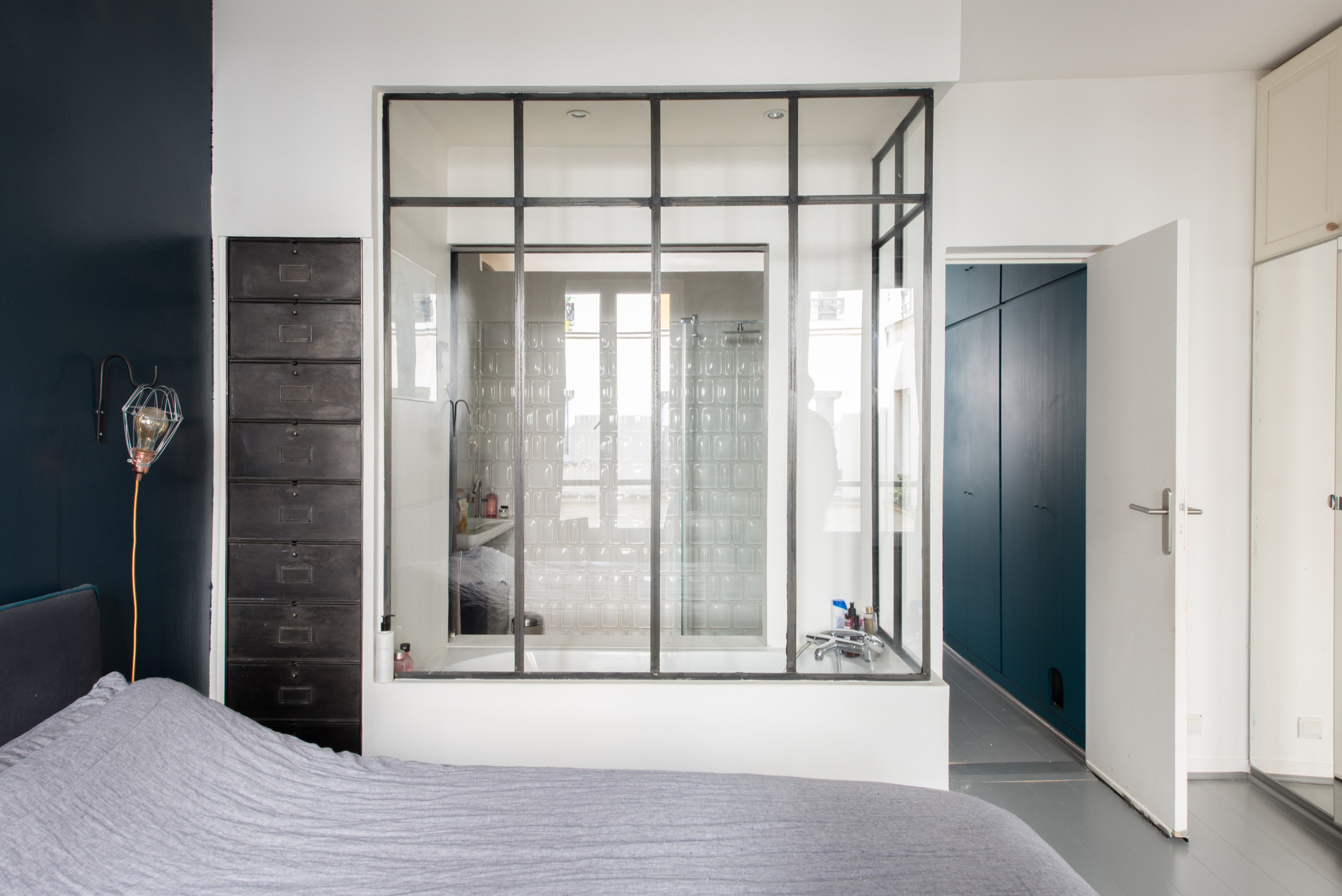 « La verrière est très jolie, mais ce n’est pas très pratique car un vis-à-vis nous oblige à fermer les rideaux de la chambre chaque fois que nous voulons nous doucher ! », explique Elodie. « Nous avons donc prévu de remplacer les vitres par du verre opaque. »