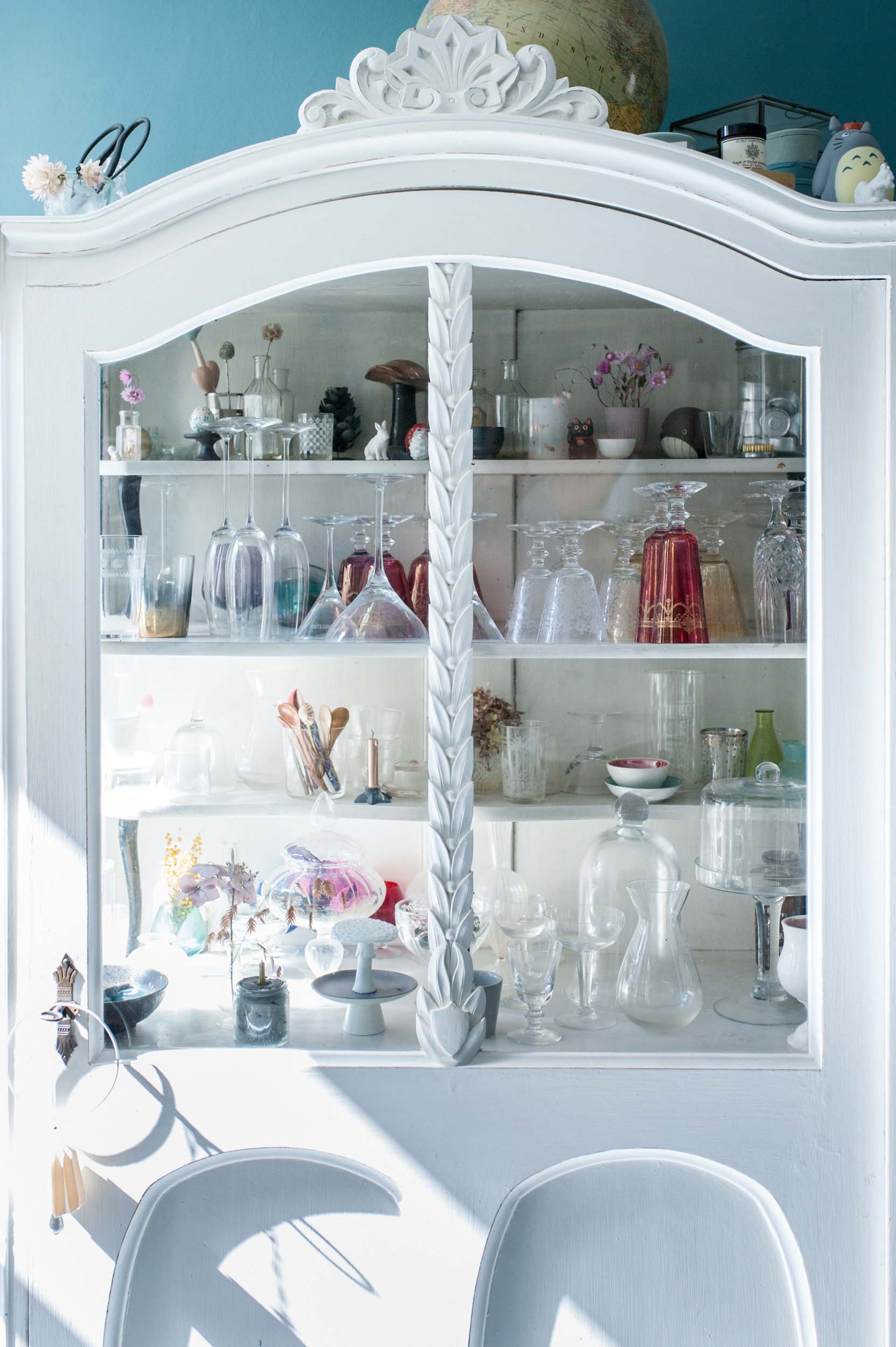 Hors de question, cependant de se séparer d’un tel coup de cœur : le couple lui trouve alors une place au salon, où il offre une jolie vitrine pour la vaisselle et les vases d’Elodie.