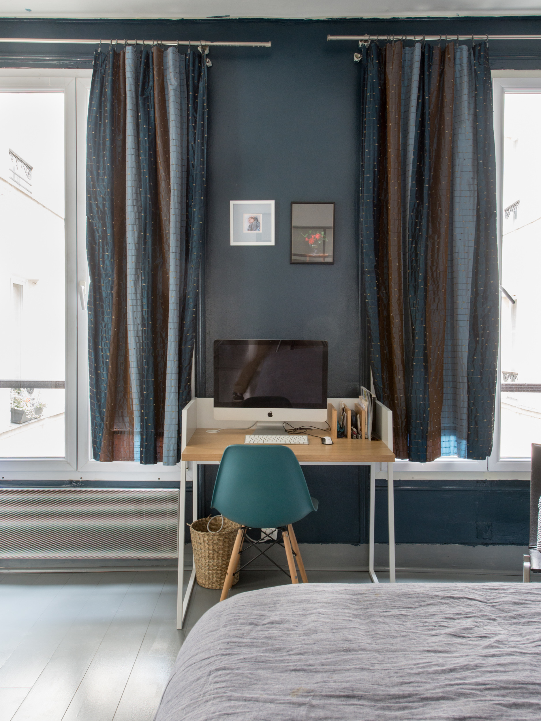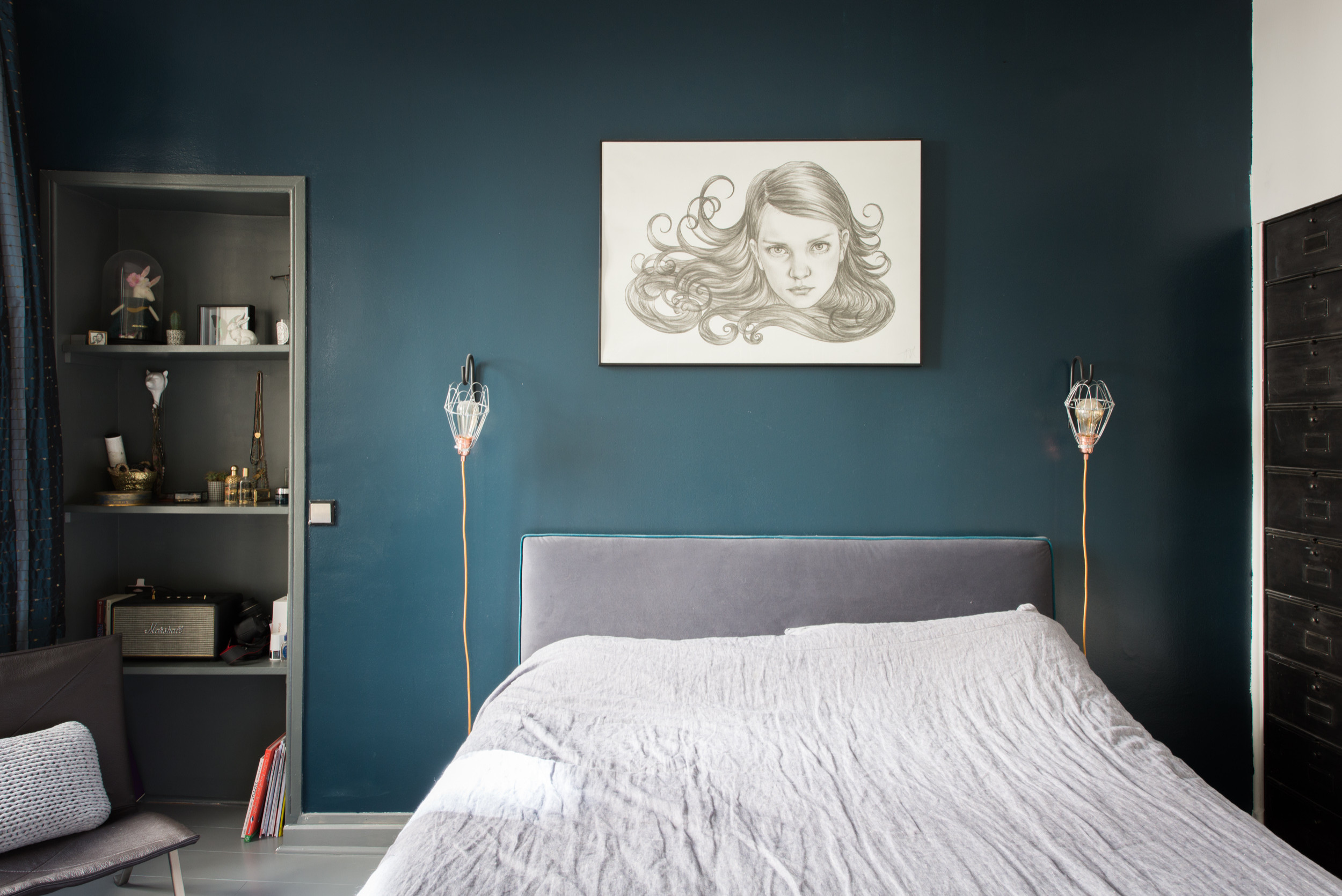 Dans la chambre aussi, les murs revêtent une couleur profonde. « Nous avons toujours adoré cette couleur car elle est très apaisante », explique Elodie. « À notre arrivée, nous avons sauté sur l’occasion de l’utiliser dans notre chambre. »