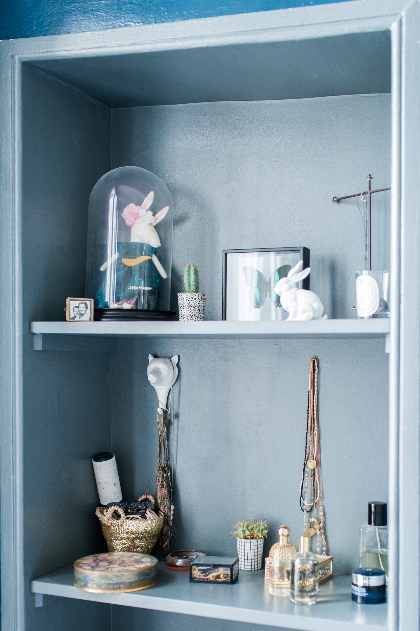 Peinture murale : Hague Blue chez Farrow & Ball ; Grillage des baladeuses : Merci ; Lapin sous cloche : Rose Minuscule