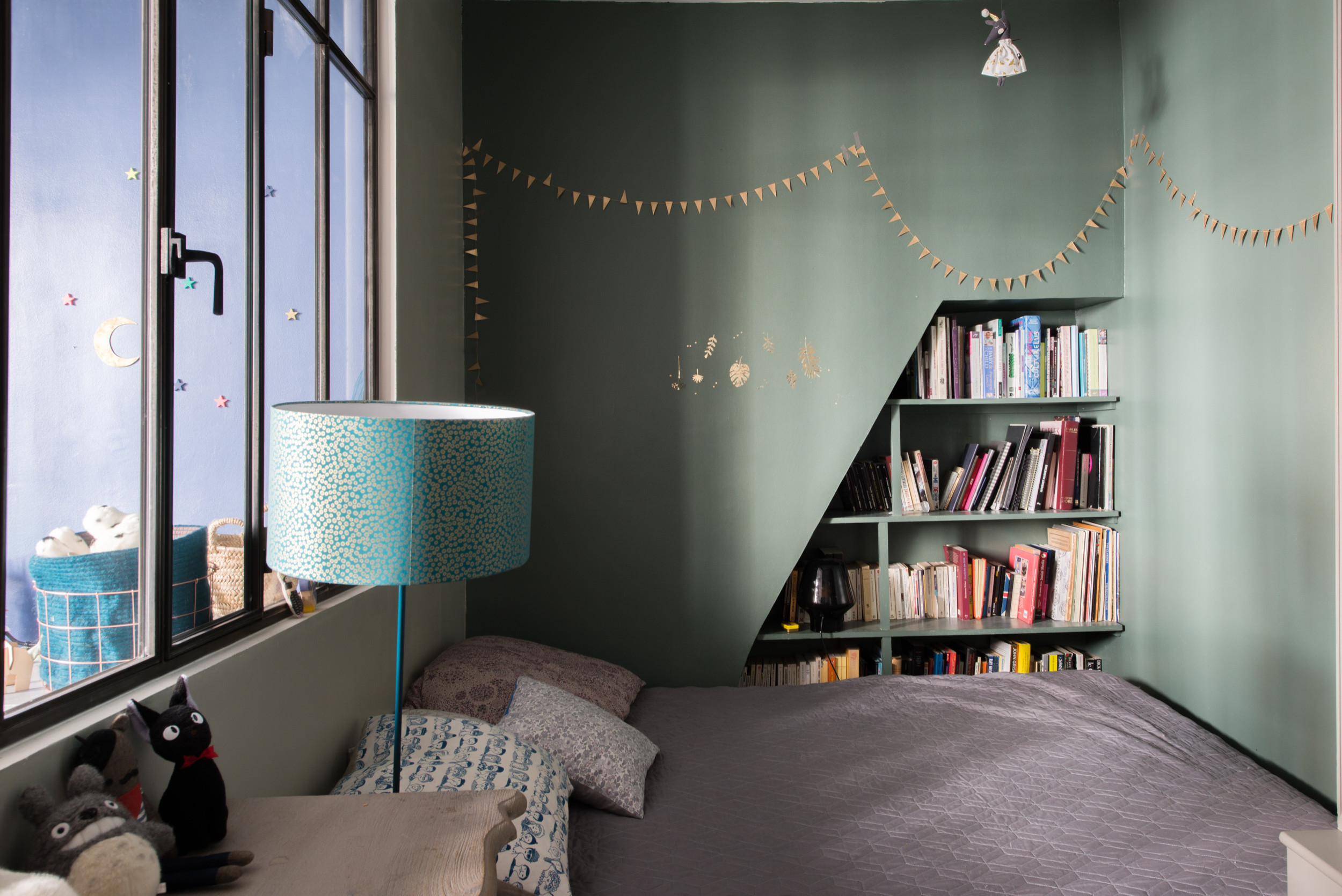 À gauche, l’alcôve est le dernier vestige d’une porte qui menait à la chambre d’Ella. « Il faut imaginer une cheminée à l’emplacement de la tête de lit. Nous avons fait murer la porte et refaire le mur pour un rendu homogène », explique Elodie. « Comme la cloison était très épaisse, nous avons pu créer un espace de rangement en ajoutant quelques étagères. »