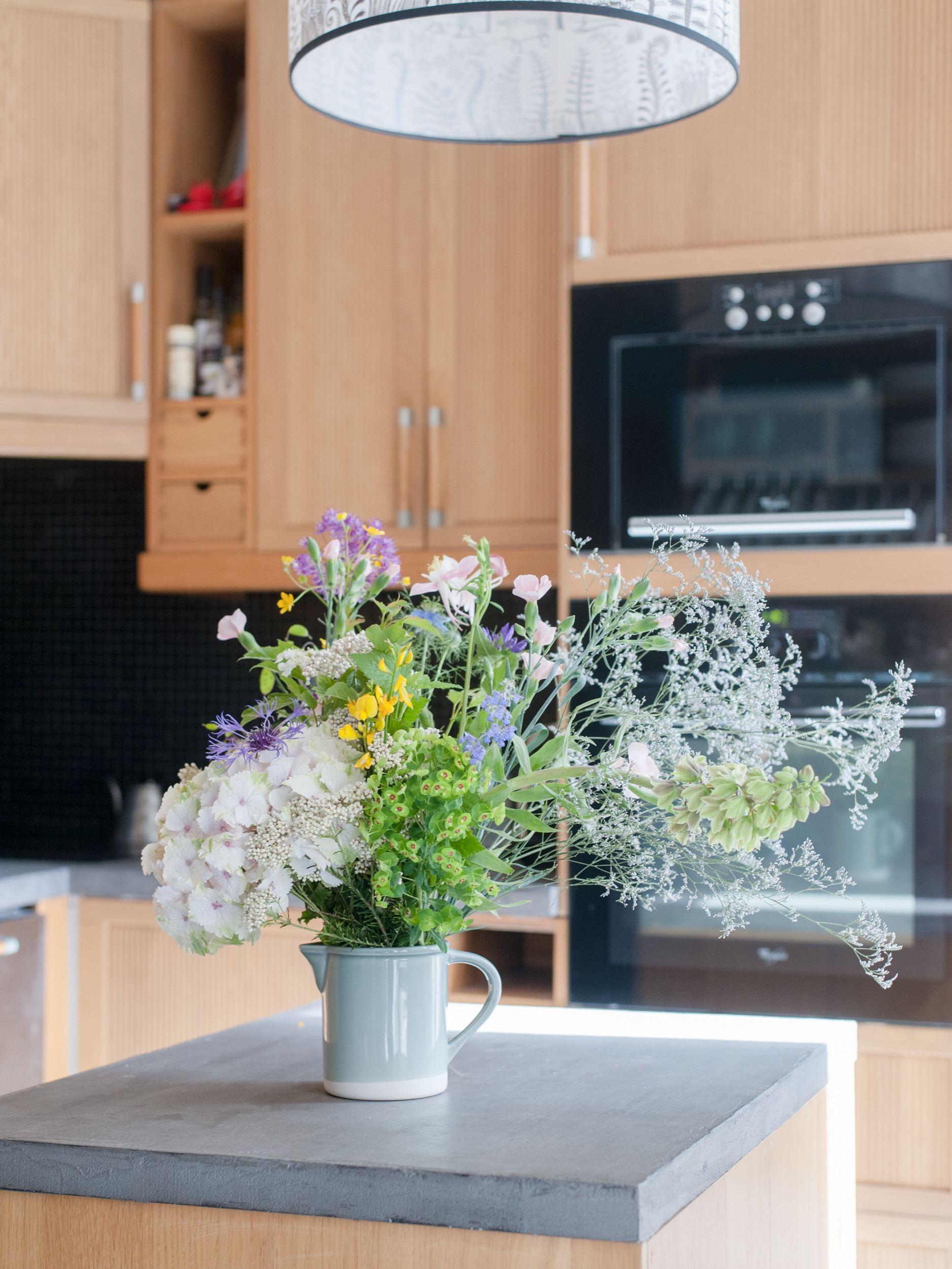 Sur l’îlot, une cruche détournée en vase témoigne de la passion d’Elodie. « J’adore détourner des objets du quotidien : arrosoir, pots de confiture… Tout peut faire office de vase ! », explique-t-elle. « J’en chine et j’en ramène de voyages. »