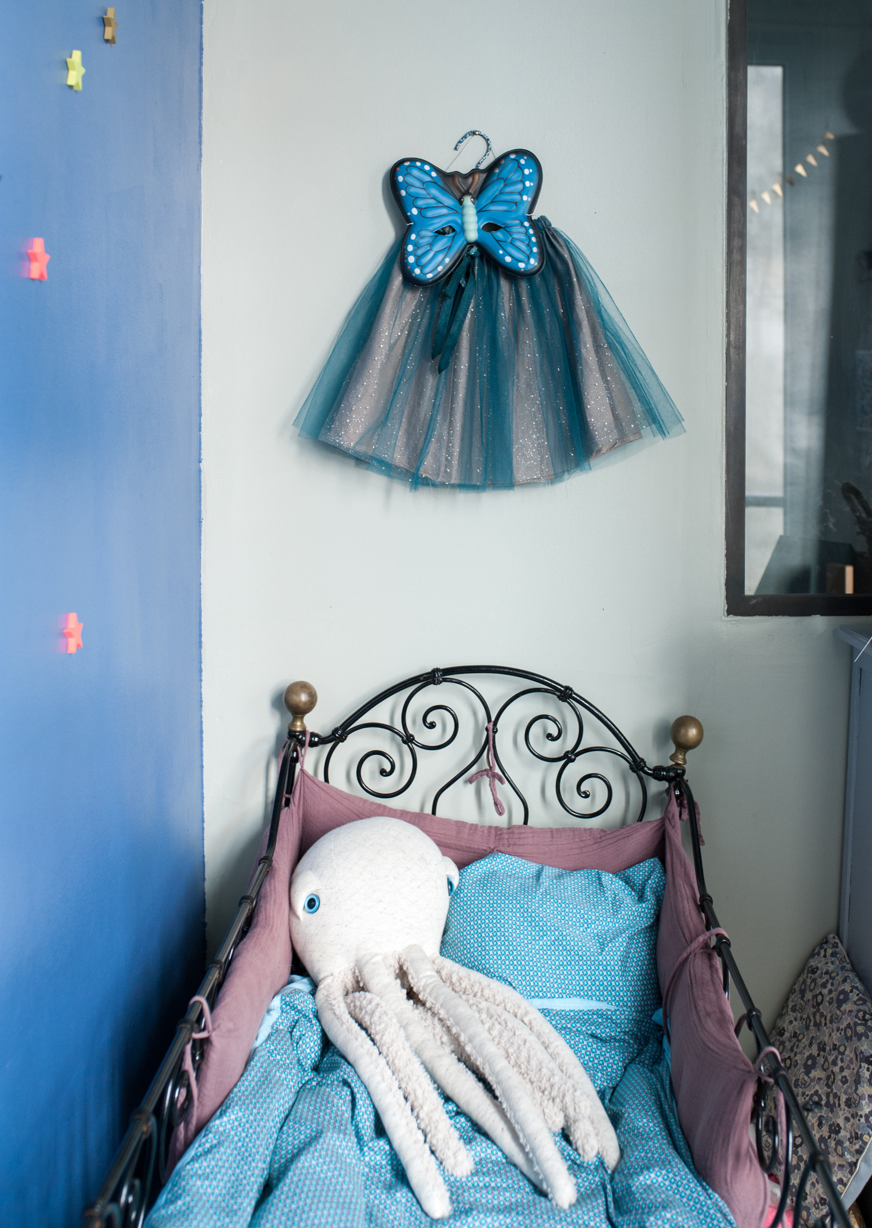 Nous voici dans la chambre de la petite Ella, où une banquette dénichée chez sa grand-mère a été détournée en lit de transition, puisqu’il n’y a plus de barreaux, mais une structure suffisamment haute pour empêcher qu’elle tombe. « Nous avons fait faire un matelas sur mesure et un ciel de lit devrait arriver pour son anniversaire… », ajoute Elodie. Un petit escabeau permet à la petite fille de grimper dans son lit et d’en descendre en toute sécurité.