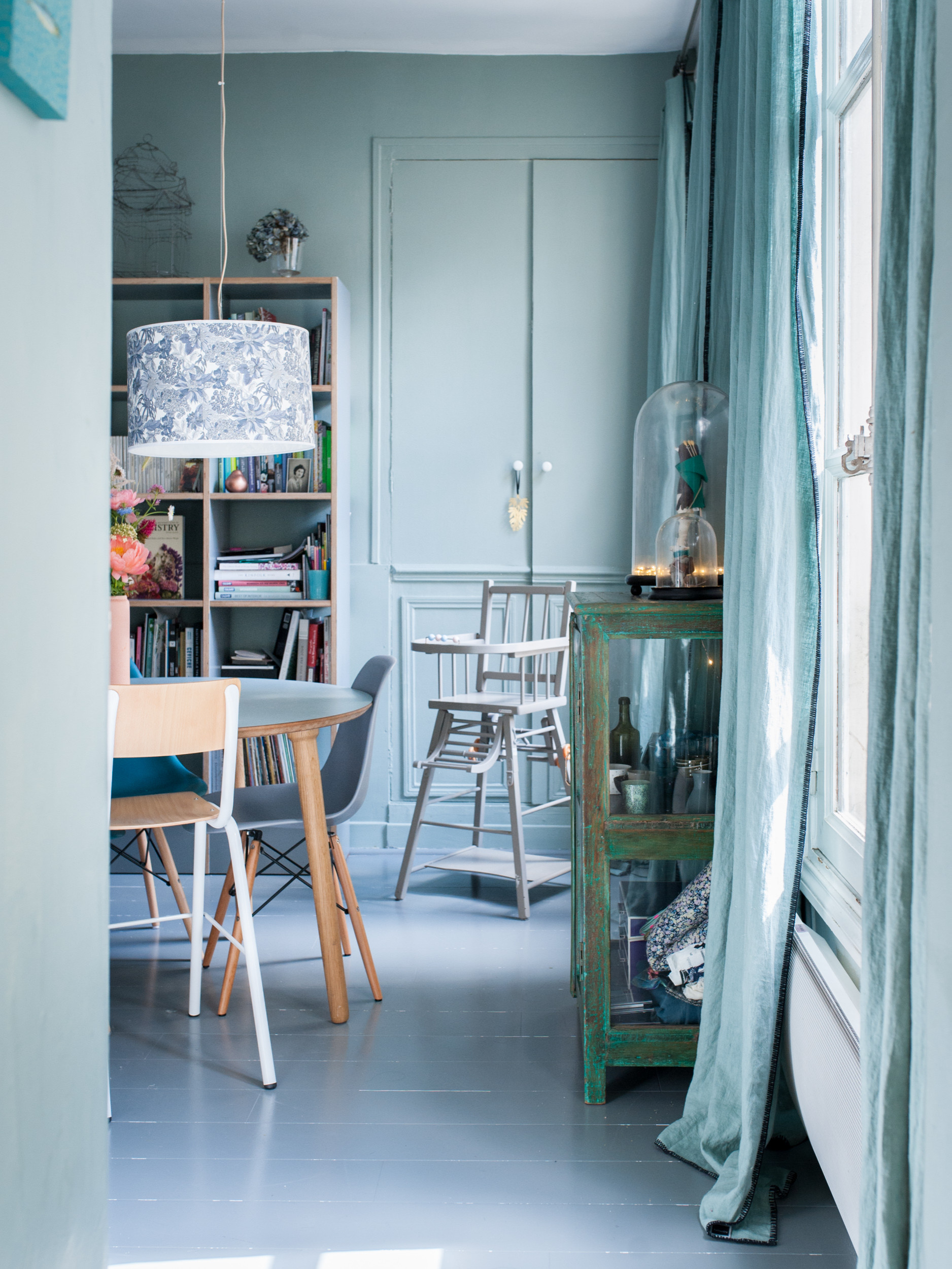 Le parquet aussi a été repeint pour adopter une tonalité de gris différente dans chaque pièce pour renforcer la luminosité de l’appartement et contraster avec les murs colorés. Un parti pris inspiré de l’Allemagne et de la Scandinavie, où cette pratique est courante. « C’est beaucoup plus facile qu’on peut le penser », explique Elodie. « Nous avons comblé les espaces entre les lattes avec de la pâte à bois, que nous avons poncée, avant de passer une peinture qui ne demande pas de sous-couche. » Quand on évoque l’entretien d’un parquet peint dans une teinte aussi claire lorsqu’on partage l’appartement avec un enfant et un chat, la jeune maman précise : « Il suffit de passer le balai et l’aspirateur régulièrement, et de laver avec un peu de produit entretien et d’eau. Quant à Kitsune, les chats à poils longs les perdent beaucoup moins qu’on ne le pense ! »