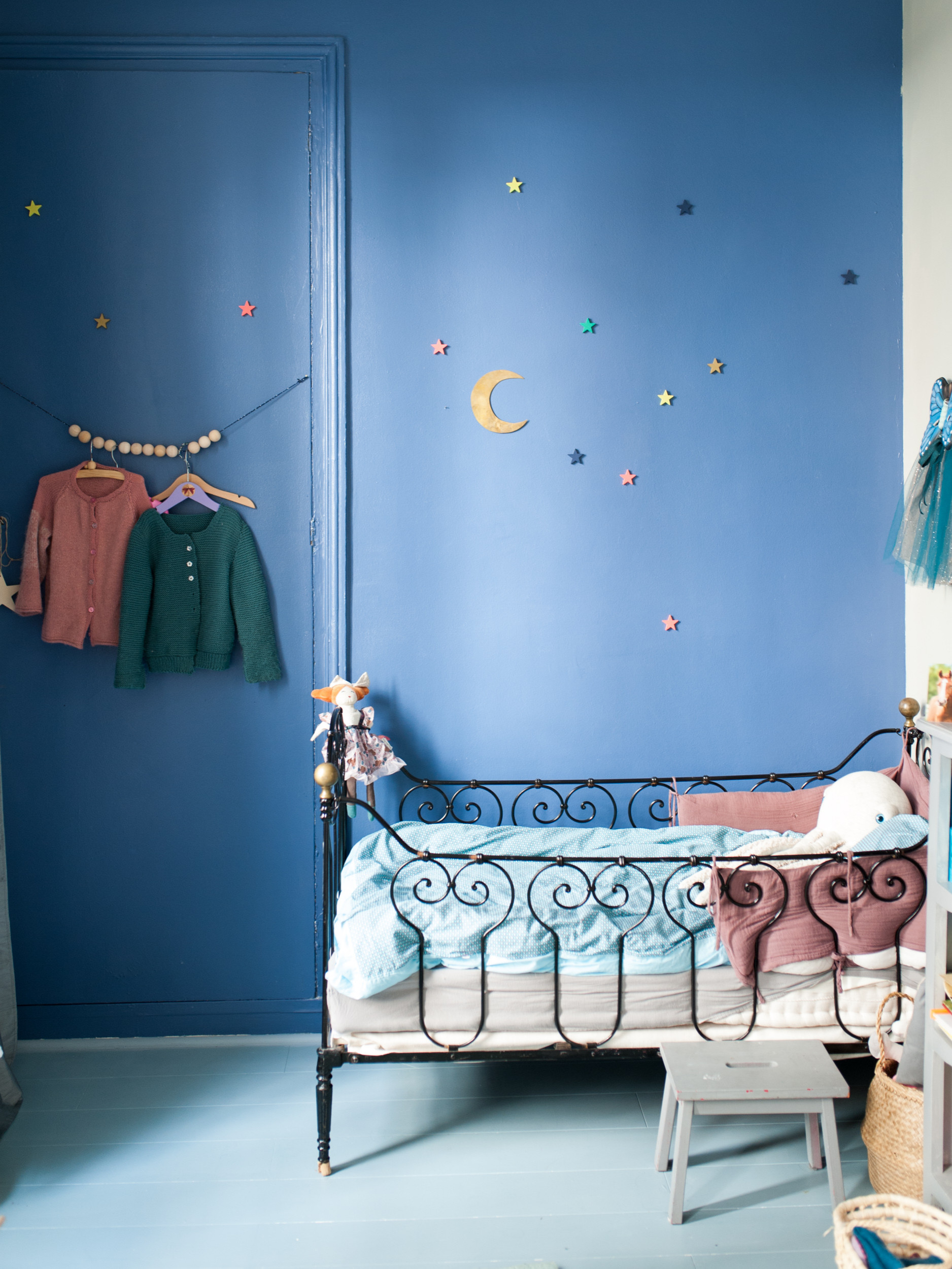 Peinture : Pitch Blue chez Farrow & Ball ; Étoiles collées au mur : CoDesign ; Lune en cuivre : Les Petits Bohèmes
