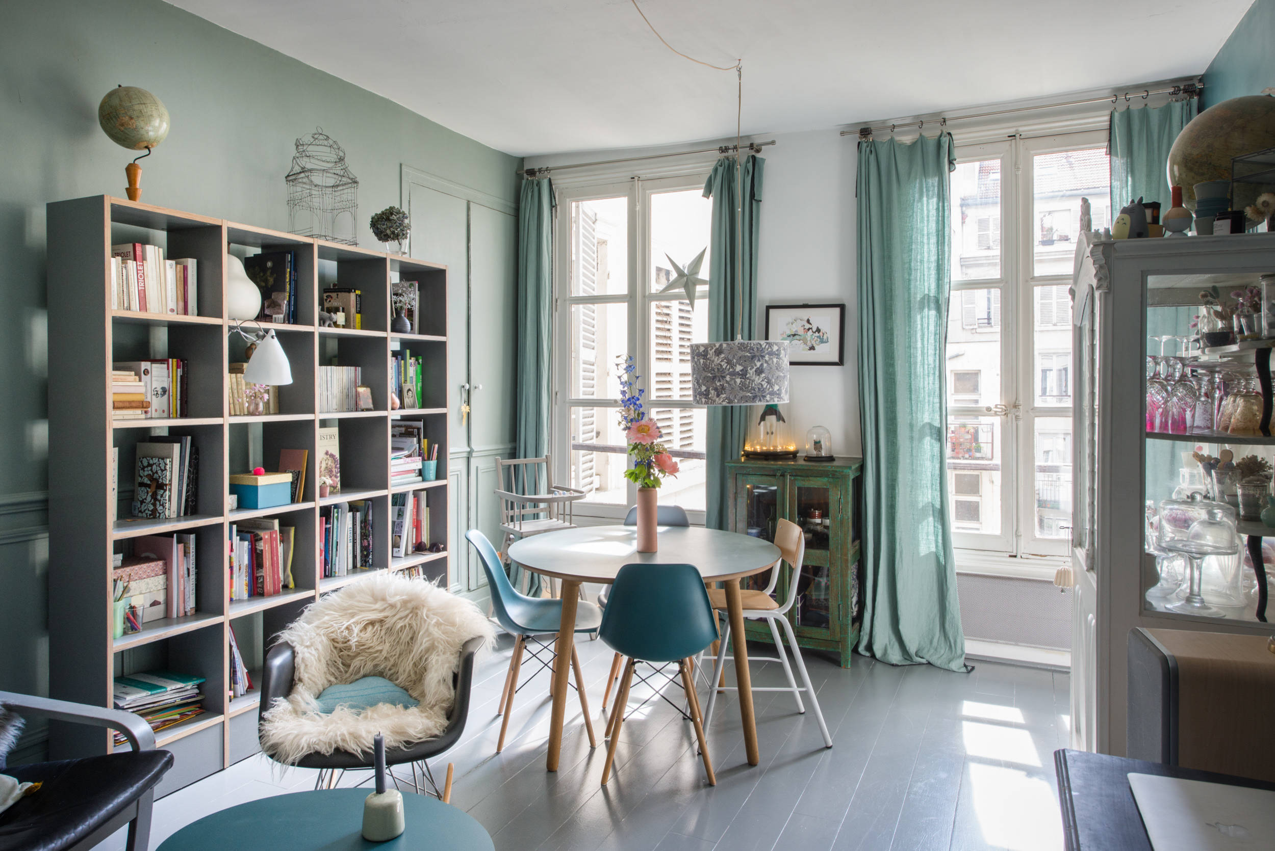 L’astuce d’Elodie pour alléger le budget déco ? Coudre ses rideaux dans des nappes en lin. « Nous avons trouvé un tissu céladon qui s’harmonisait parfaitement à la peinture du salon, alors nous avons sauté sur l’occasion ! », précise-t-elle. « En plus d’être moins cher qu’acheter des rideaux classiques, cette astuce permet de varier les tailles à volonté. Et c’est très facile à nettoyer. »