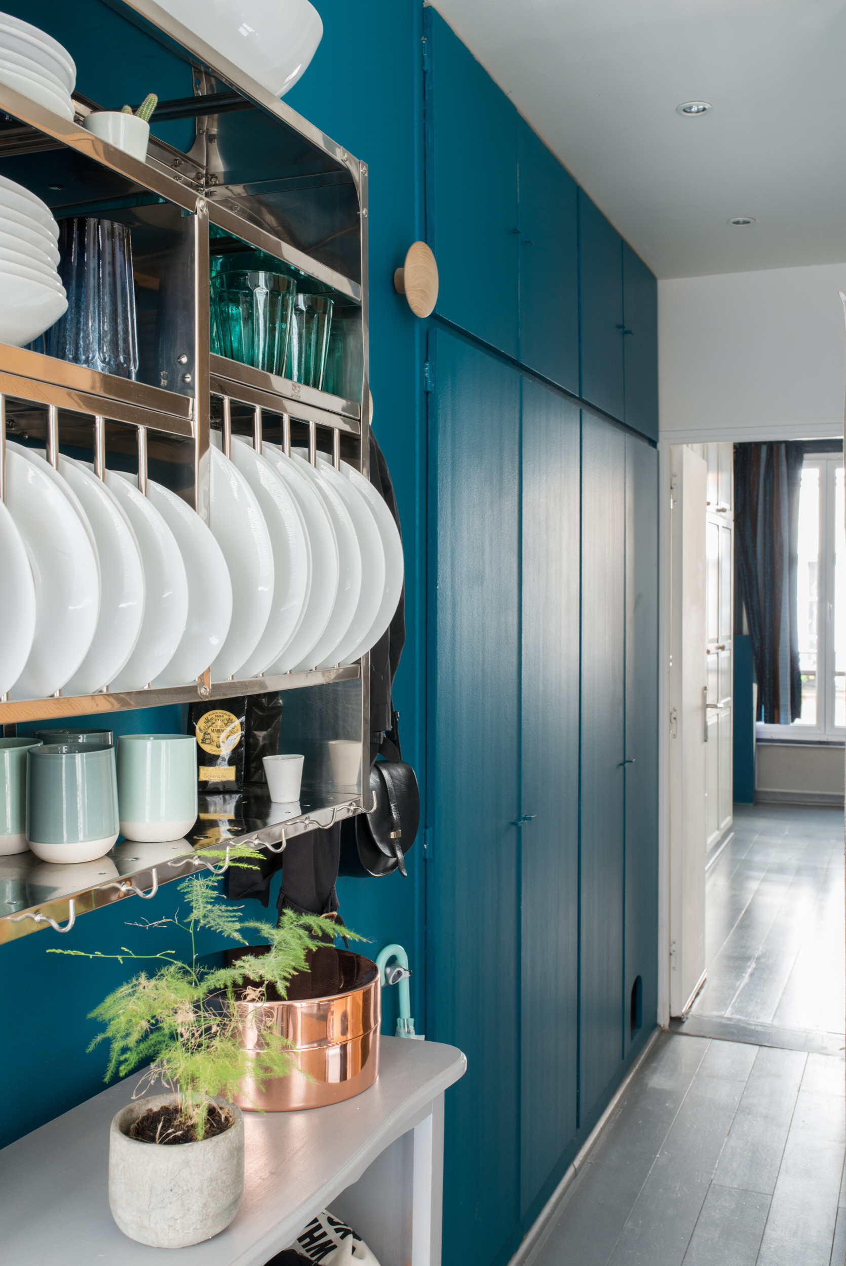 À droite du vaisselier, on aperçoit le couloir qui mène à la salle de bains et aux chambres. Les placards, taupe à l’origine, ont été repeints en bleu grâce à un reste de peinture que la blogueuse a récupéré d’un shooting. « La chatière découpée dans la porte était déjà là. Elle permet aujourd’hui à Kitsune d’accéder à sa litière, dissimulée derrière la porte. C’est très pratique ! », précise Elodie.
