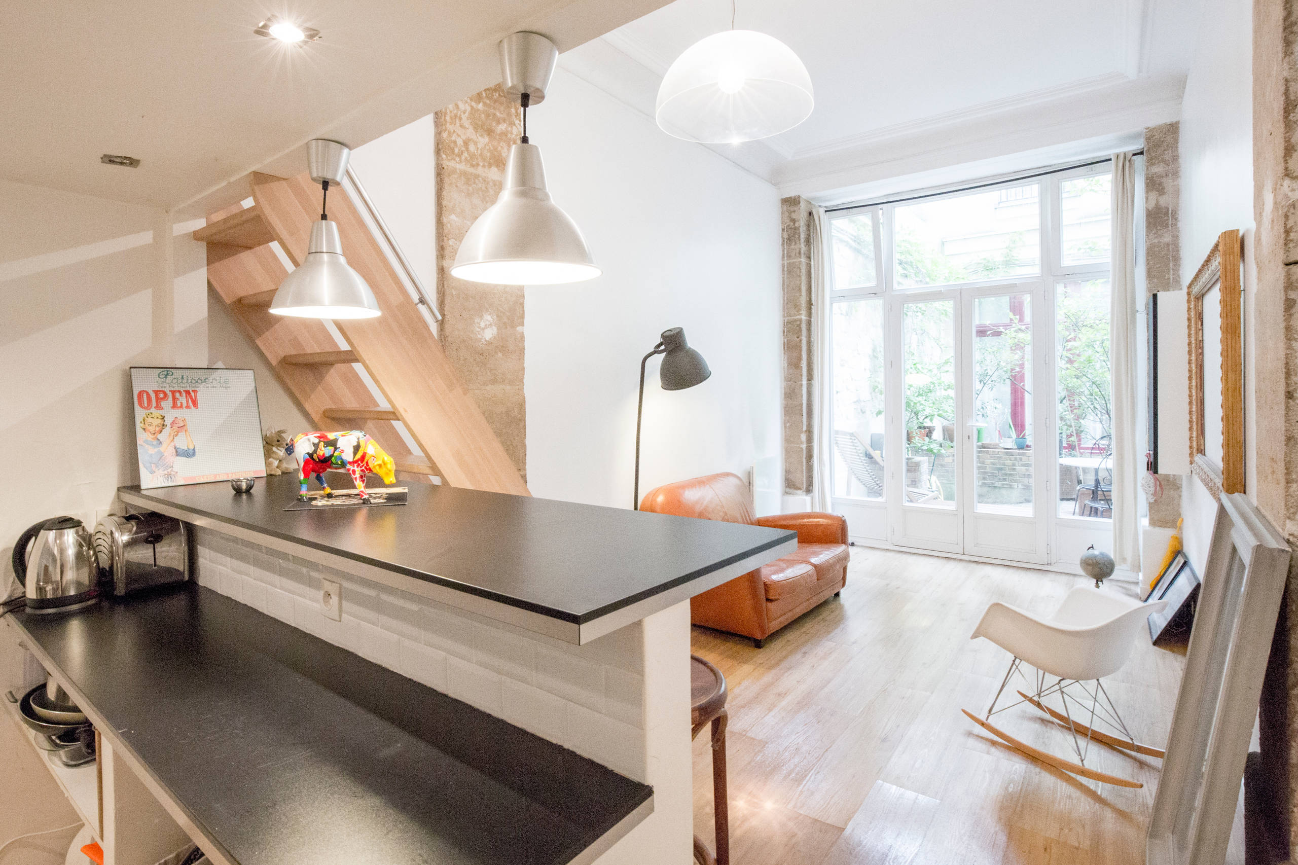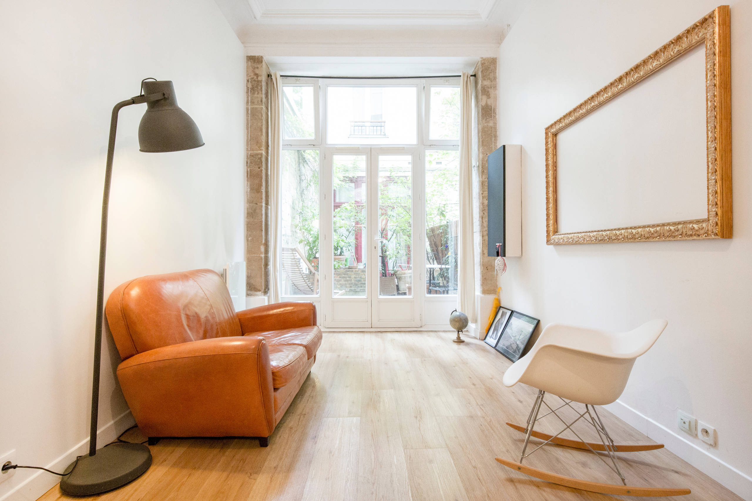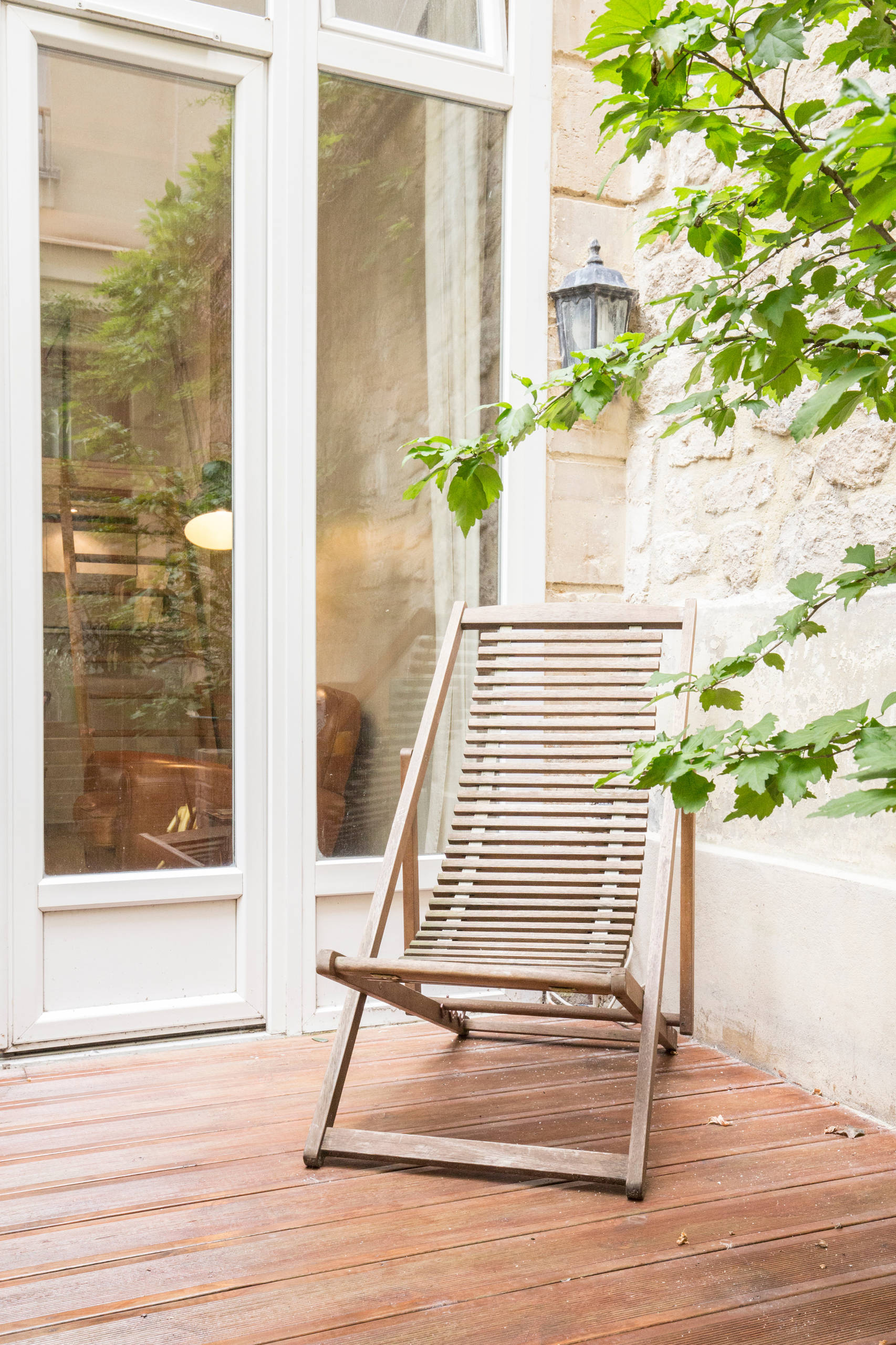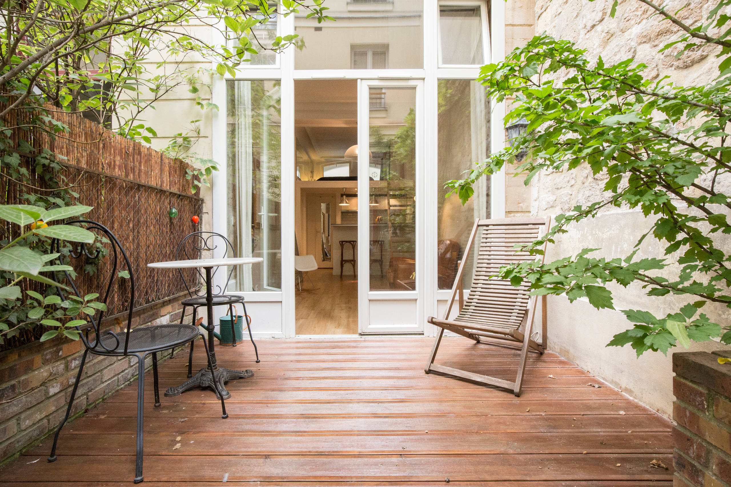 Orienté plein est, le salon est baigné de lumière grâce à ses grandes portes vitrées. Dès que la météo le permet, la maîtresse des lieux les ouvre pour accéder à une terrasse en bois de 10 m² aménagée dans une cour intérieure au calme.