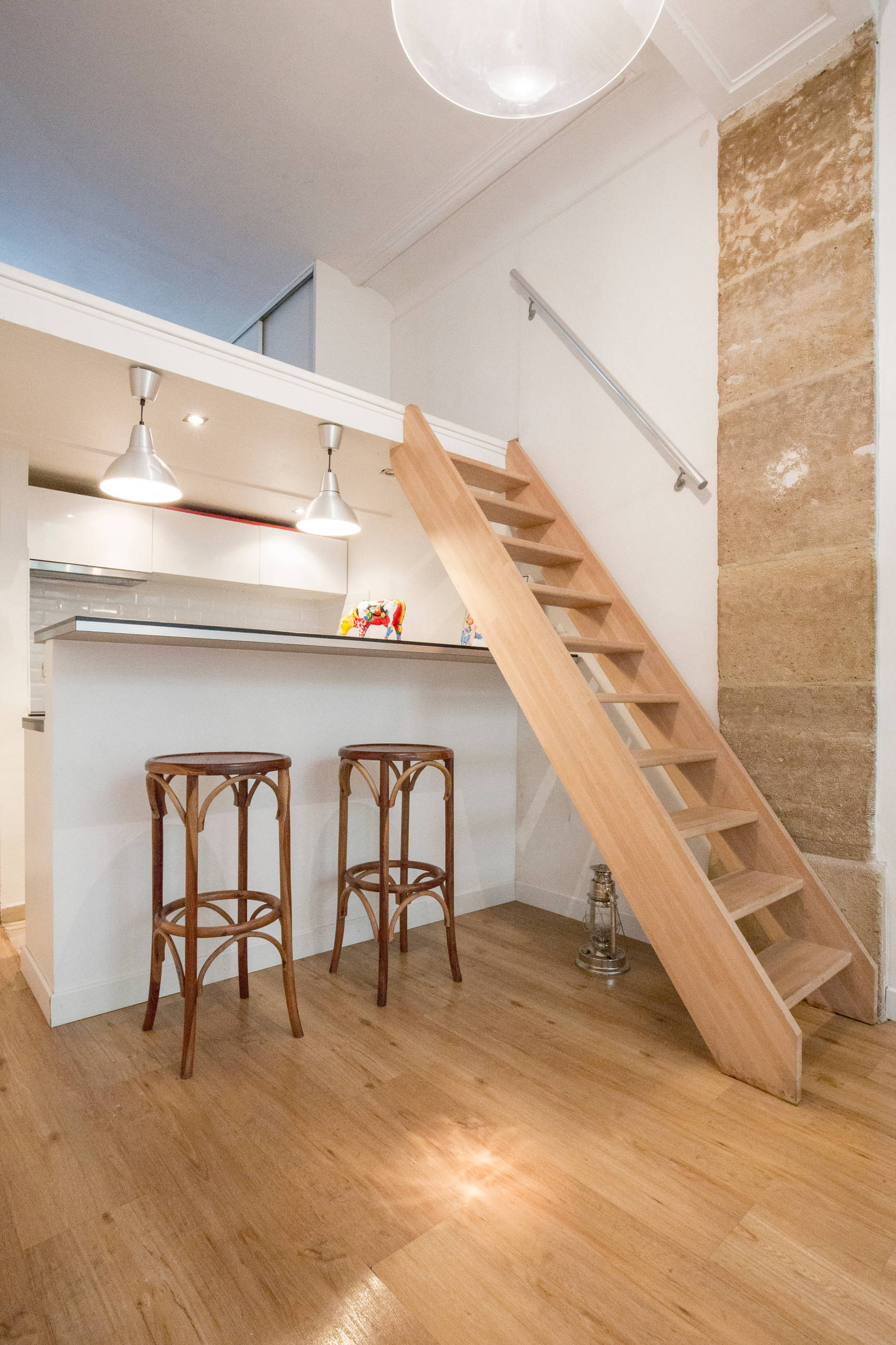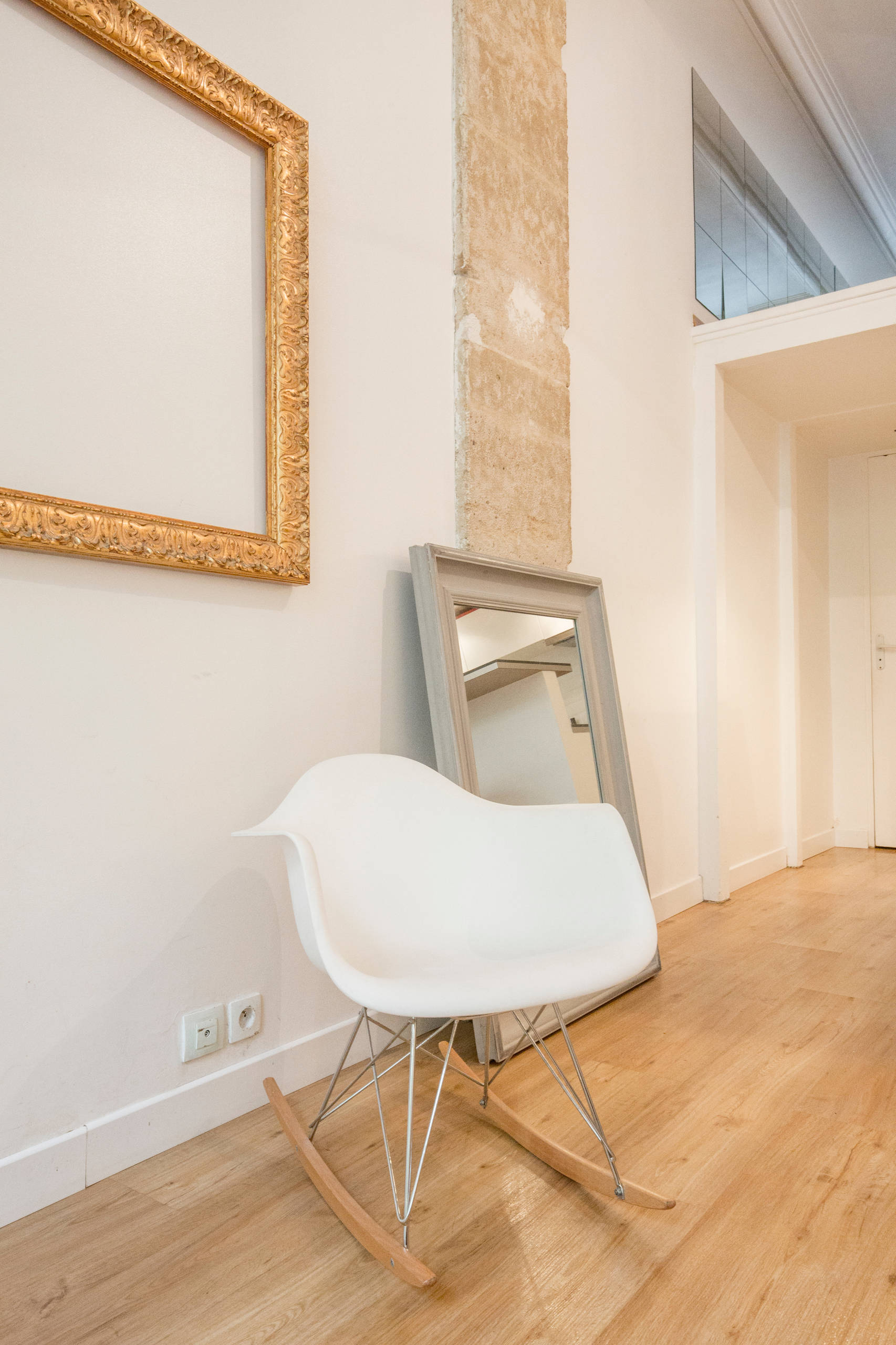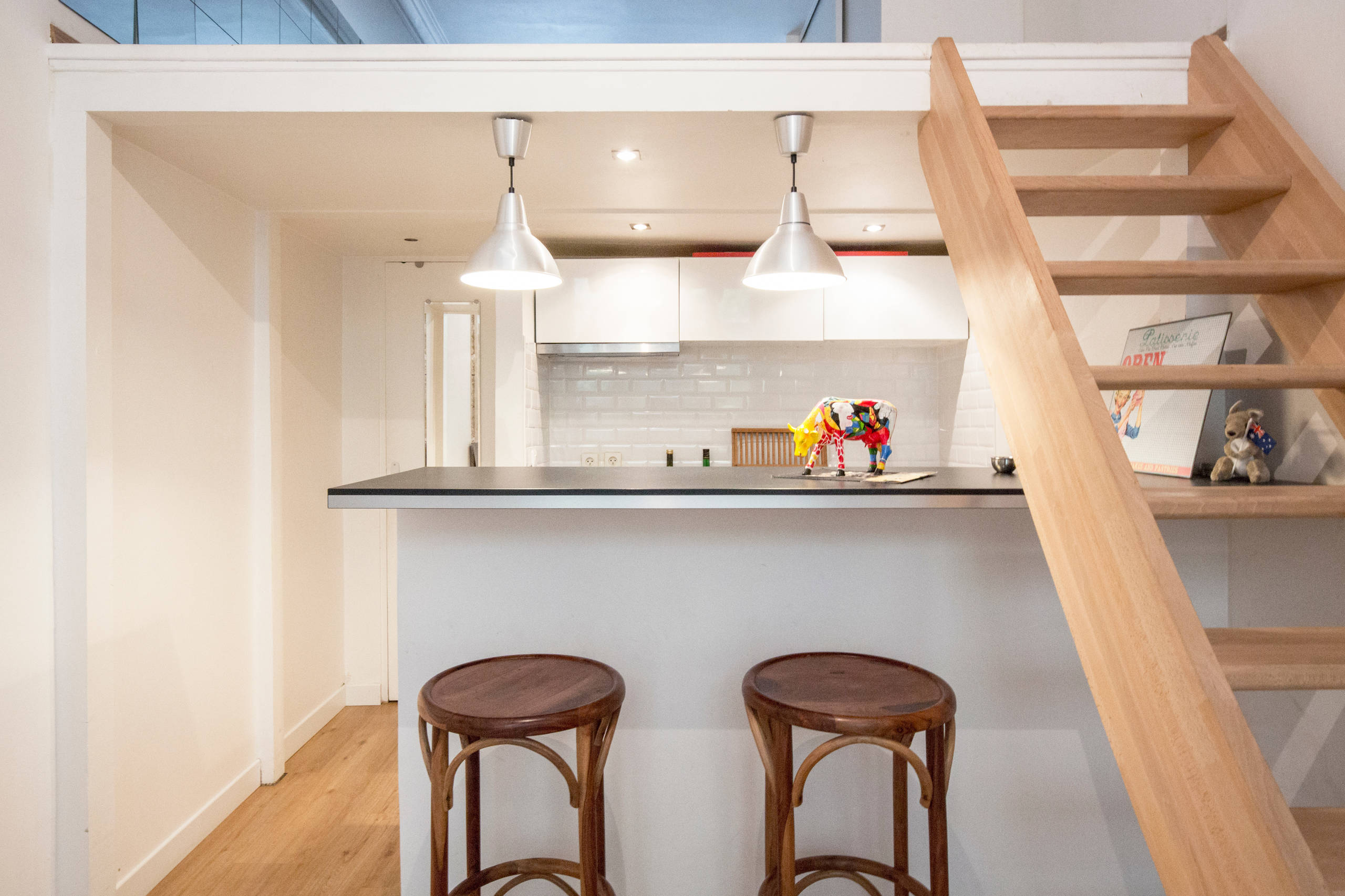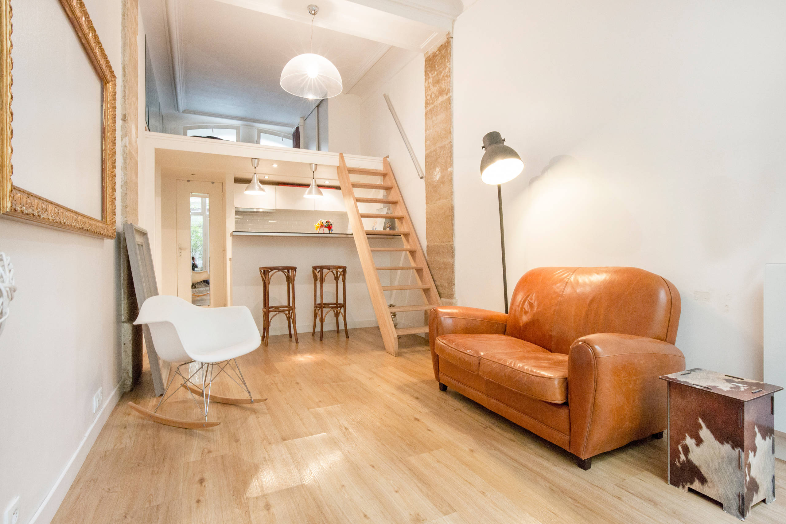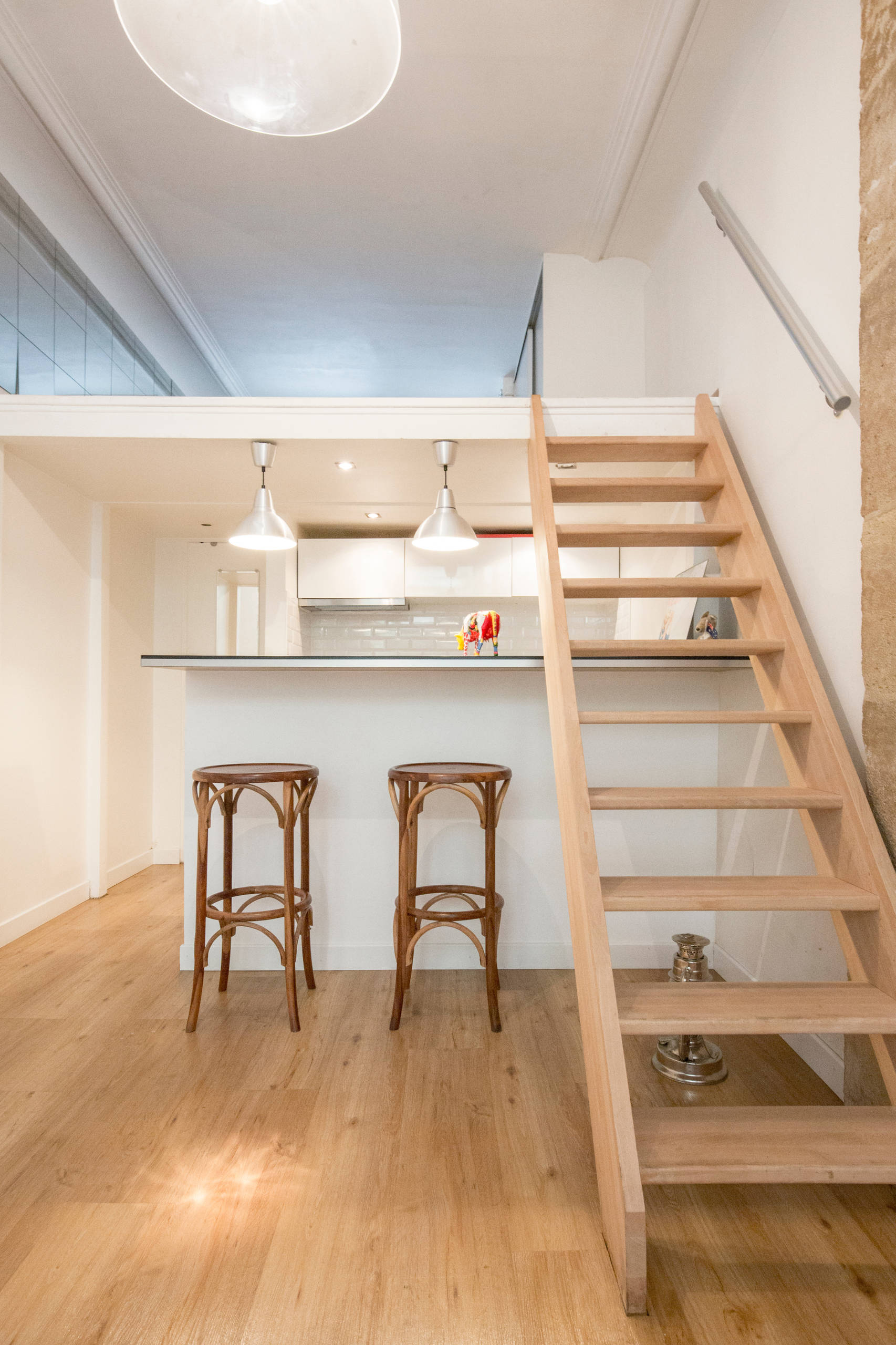 La jeune femme se lance alors dans les travaux, en commençant par tout repeindre en blanc pour gagner en luminosité et renforcer la sensation d’espace. Elle s’appuie également sur le savoir-faire d’un menuisier meilleur ouvrier de France pour concevoir sur mesure une nouvelle terrasse en bois dans la cour intérieure de l’immeuble et un escalier sécurisé (et non plus une simple échelle) pour accéder à la mezzanine, où il conçoit également un dressing.