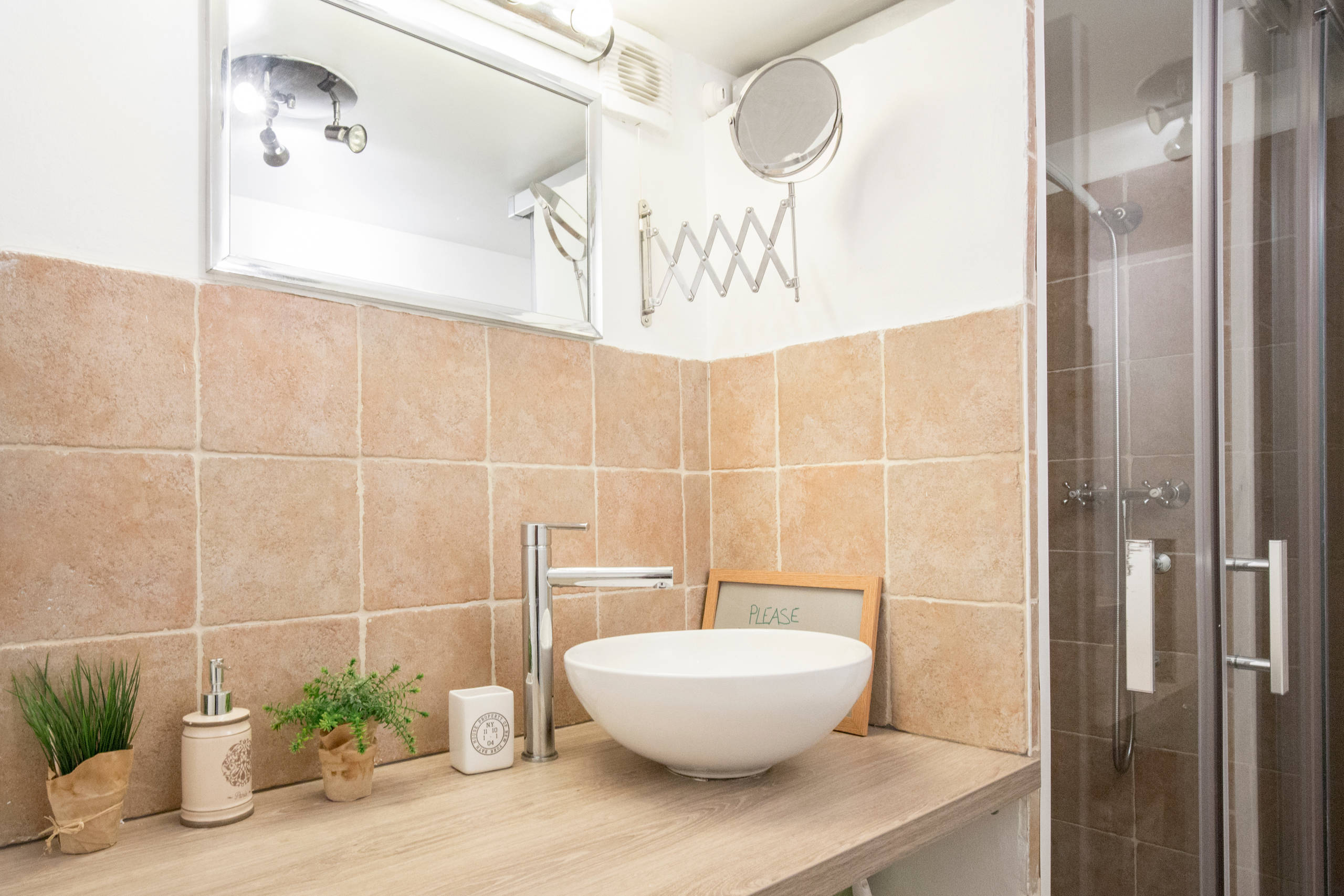 De retour au rez-de-chaussée, à gauche de la cuisine, la salle de bains a été rafraîchie à moindre coût par Raphaëlle : « La vasque est d’origine mais je l’ai posée sur une planche que j’ai fait découper, tout simplement. » La peinture a été refaite, un miroir posé et une porte de douche coulissante installée pour optimiser l’espace.