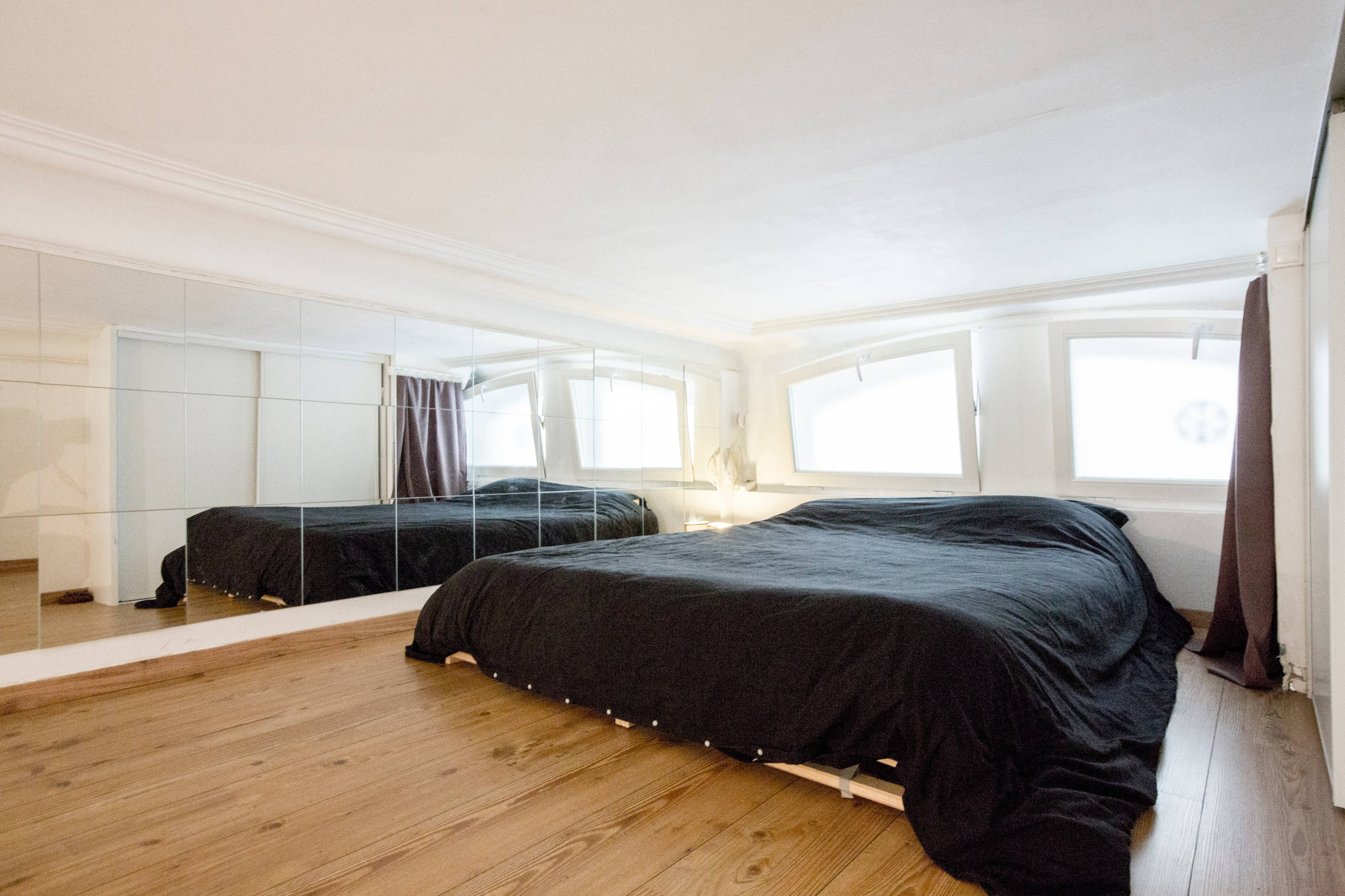 L’astuce de la jeune femme pour ne pas se sentir à l’étroit dans cet espace de 1,50 mètre de haut ? Recouvrir un pan de mur de miroirs. « Ils renforcent incroyablement la sensation d’espace et la luminosité », ajoute-t-elle. On aperçoit le reflet du dressing sur mesure conçu par le menuisier pour investir au mieux cet espace difficile.