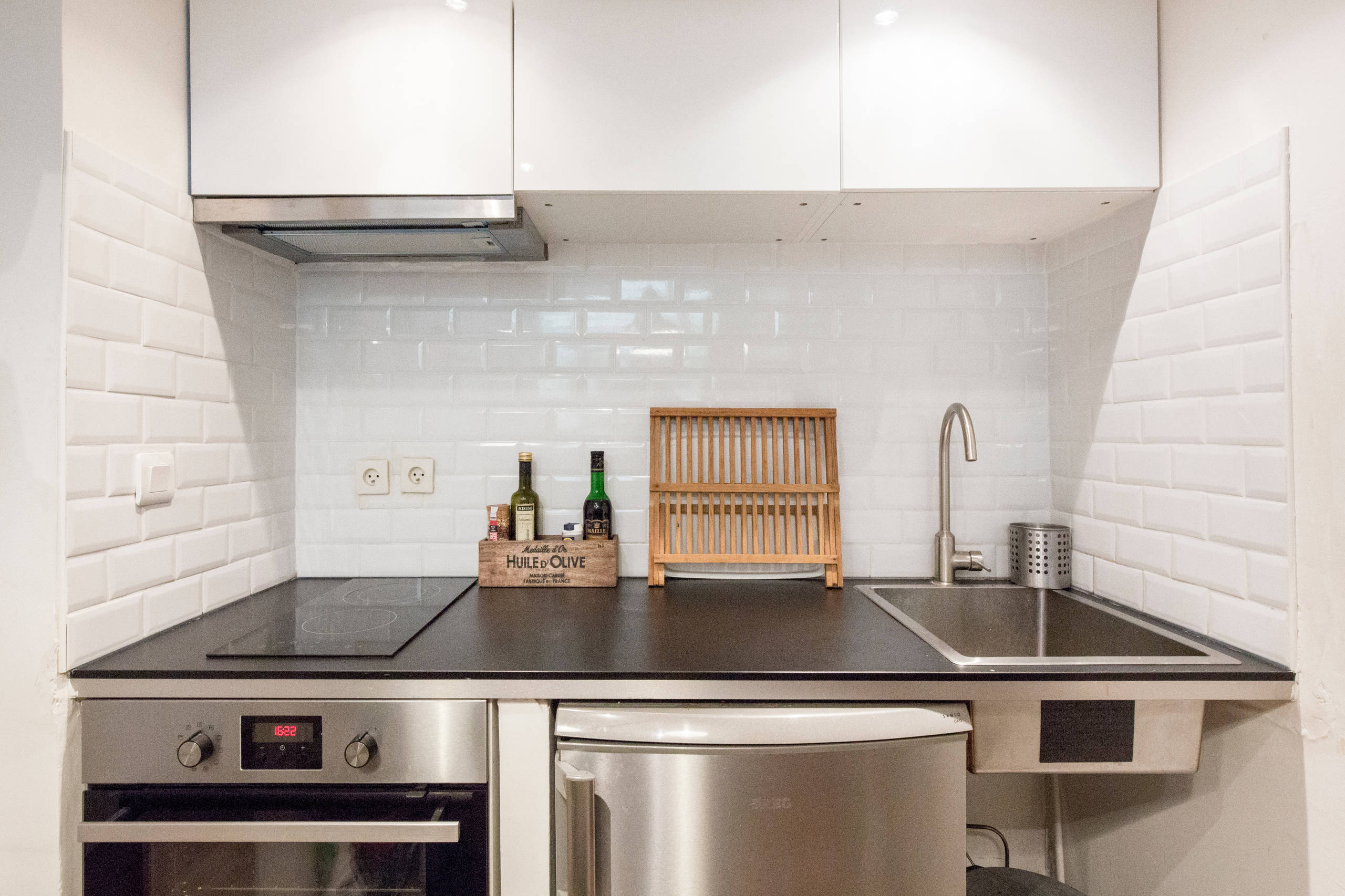 Une peinture jaune a laissé la place à un carrelage métro blanc qui fait office de crédence. « Tous les meubles devaient être remplacés », explique Raphaëlle. « J’ai également installé un four, des plaques et un réfrigérateur. » De quoi rendre cette kitchenette parfaitement fonctionnelle pour une gastronome en herbe qui s’affaire derrière les fourneaux tous les soirs.