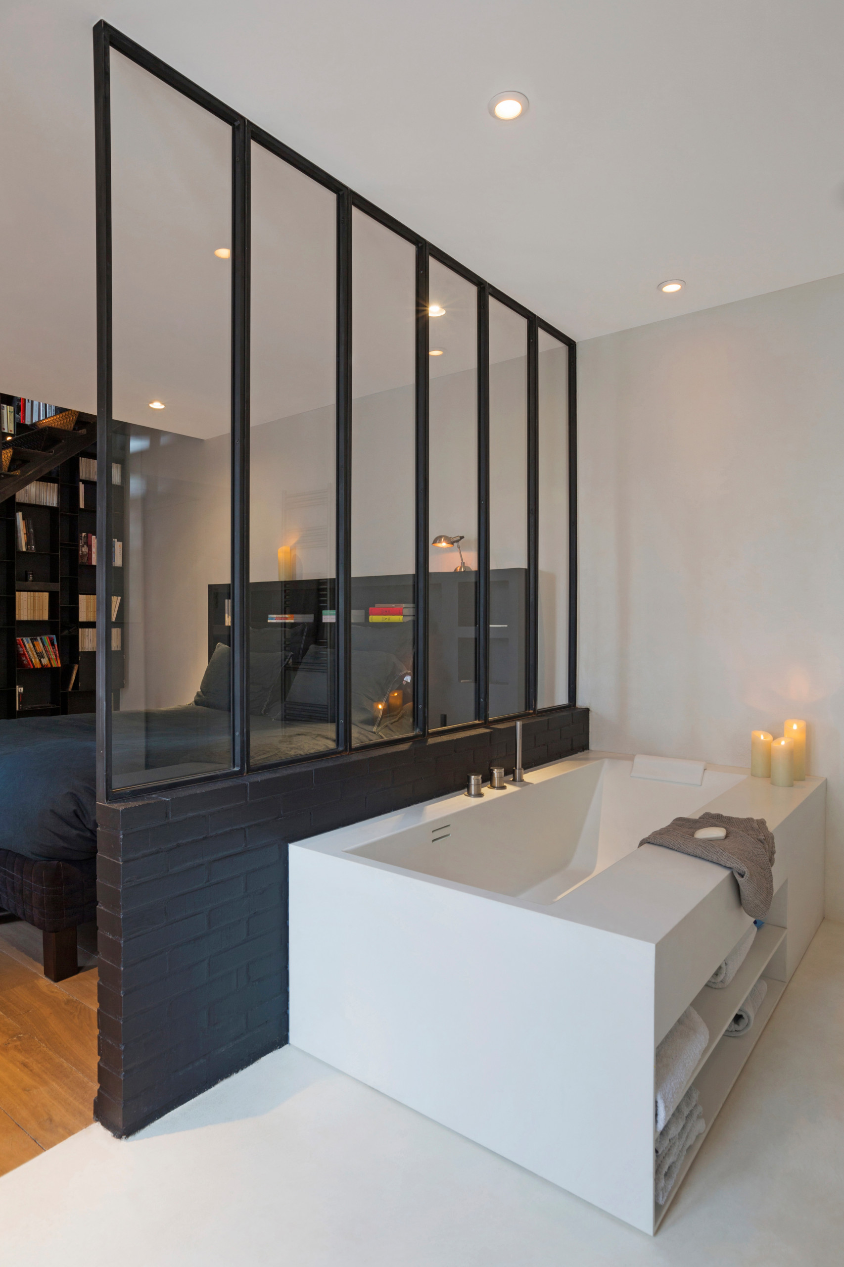 Pour augmenter la sensation d’espace dans une petite surface, il suffit parfois de se défaire des parois de la pièce. « En ouvrant la salle de bains sur la chambre, par exemple, on peut se servir de la baignoire pour séparer les espaces et ainsi gagner de la place d’un côté comme de l’autre. Un vitrage ou une porte coulissante sont envisageables pour préserver l’intimité », explique Sylvie.