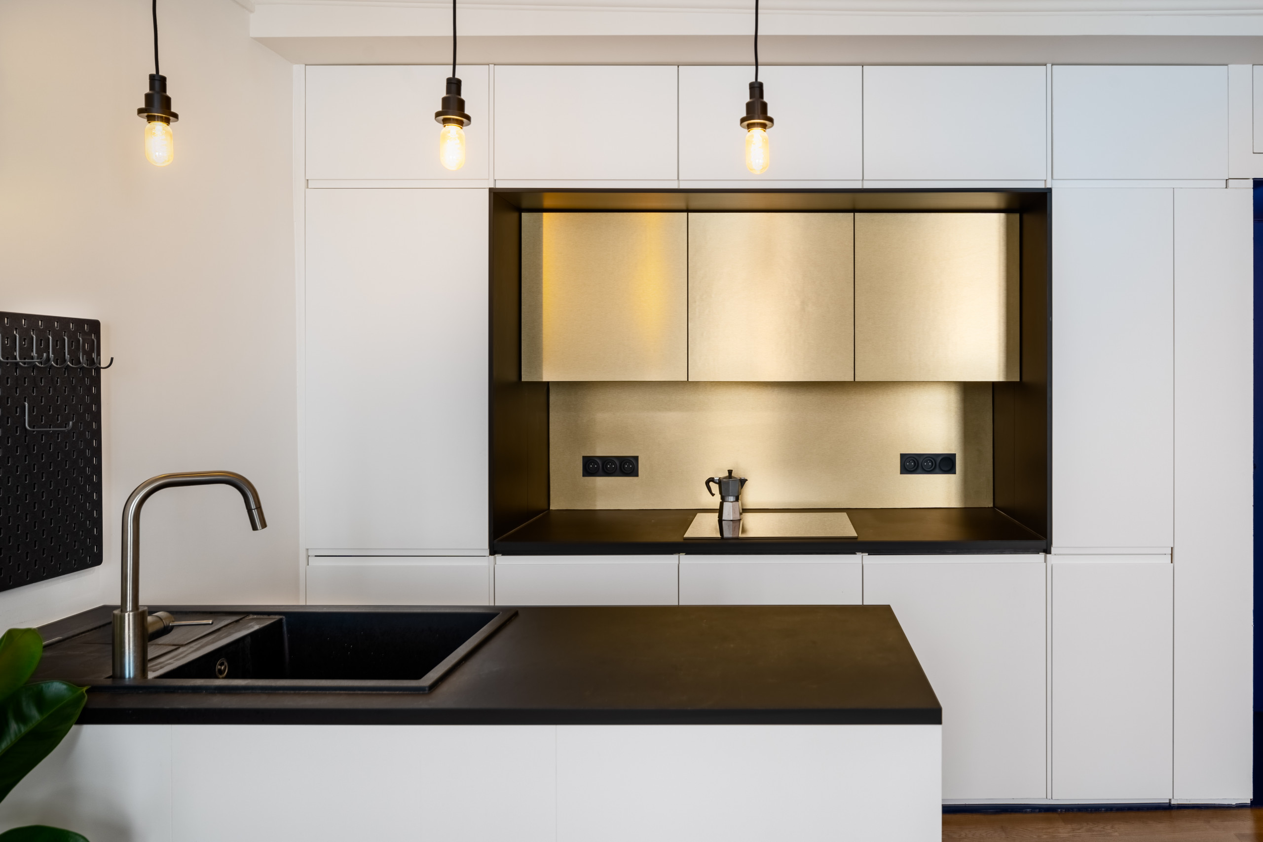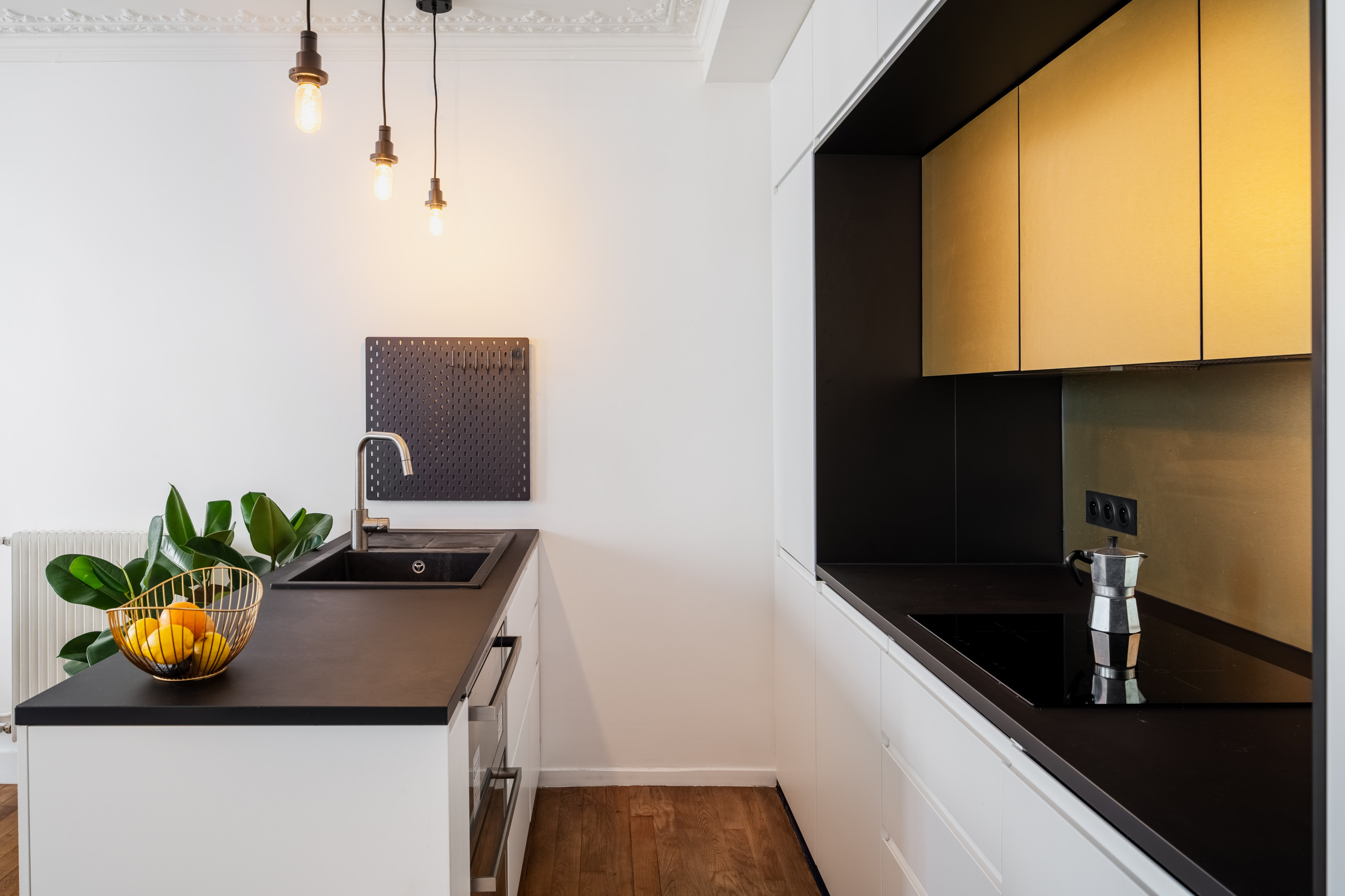 De fait, la cuisine – autrefois résumée à un lavabo contre le mur et à un petit îlot central – se pare notamment de doré. Une niche a été conçue pour l’accueillir. Les portes dorées ont été réalisées sur mesure par un menuisier et la crédence or est en stratifié. Le cadre noir qui l’entoure n’a pas été choisi au hasard… Le noir reflète en effet joliment le doré ! Les placards cachent tous les équipements nécessaires, et s’étirent jusqu’au bout, au niveau haut.