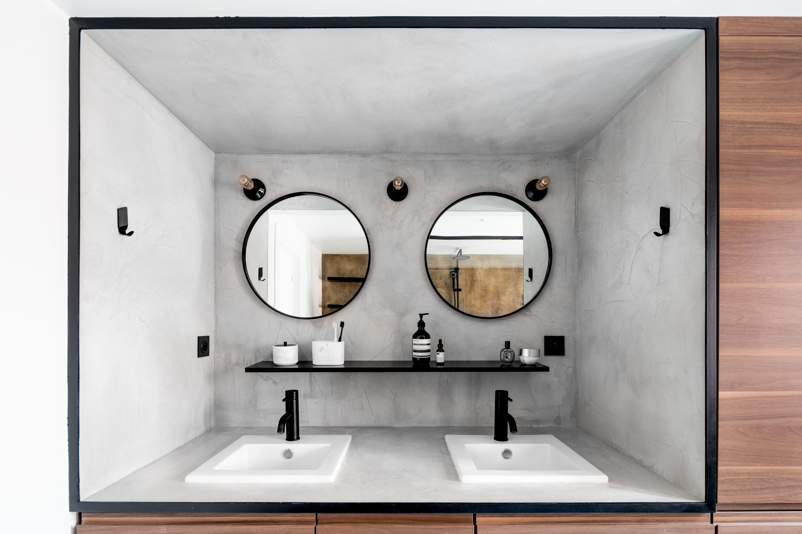 La zone vasque a été pensée comme un tableau. Un tableau composé de béton ciré – utilisé aussi au niveau du sol – et d’accessoires noirs.