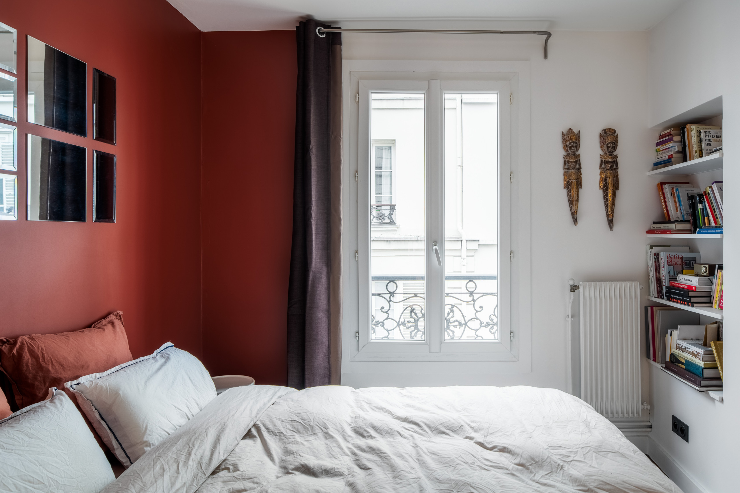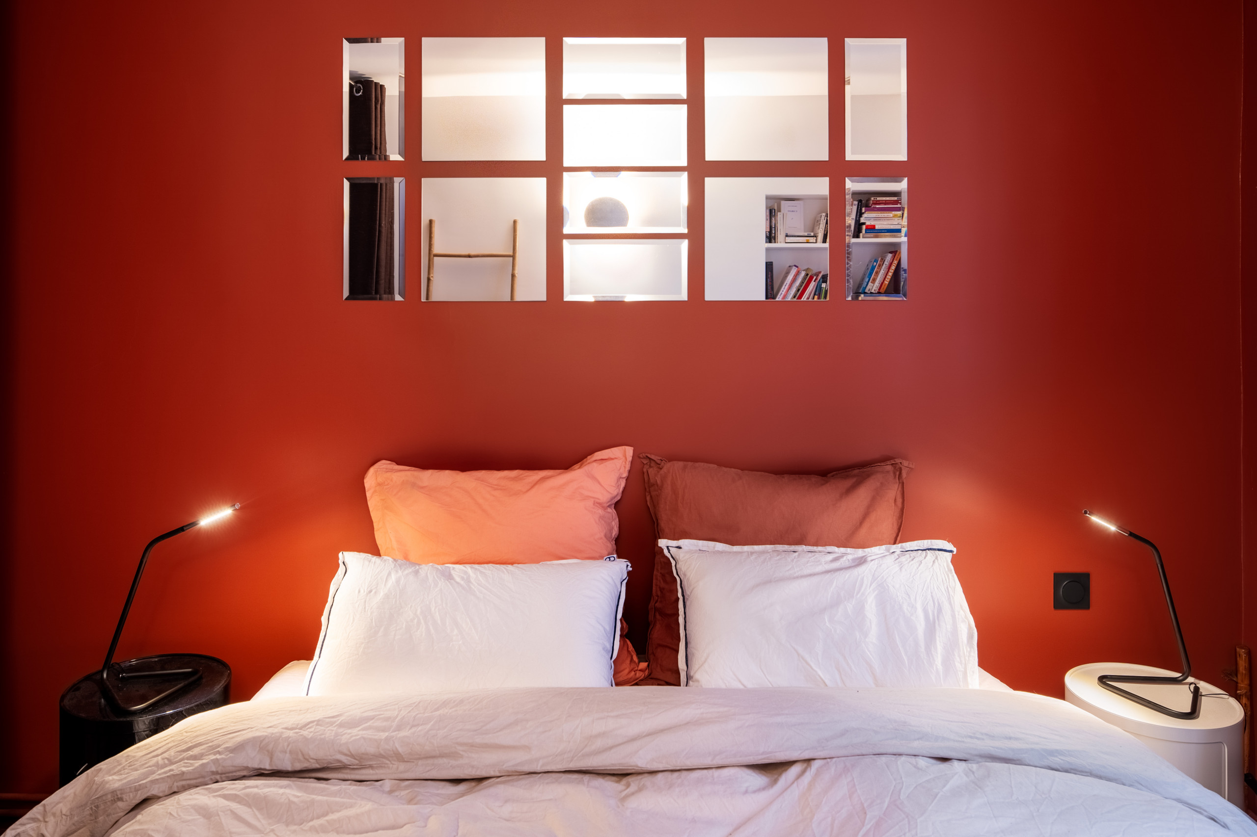 La couleur terracotta ajoute de la chaleur à la chambre. On aime cette composition de miroirs biseautés chinés dans une brocante, et surtout disposés comme une œuvre d’art !