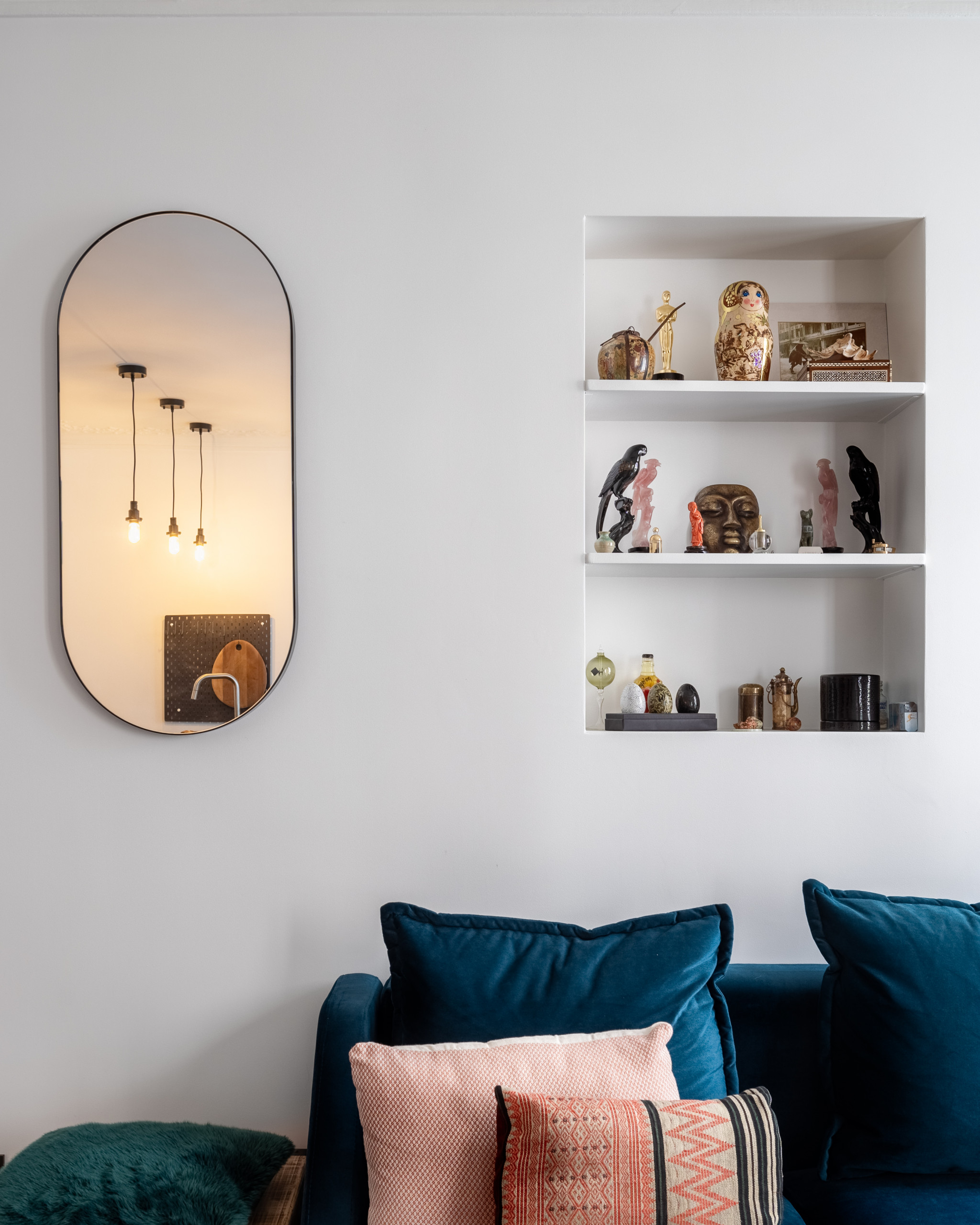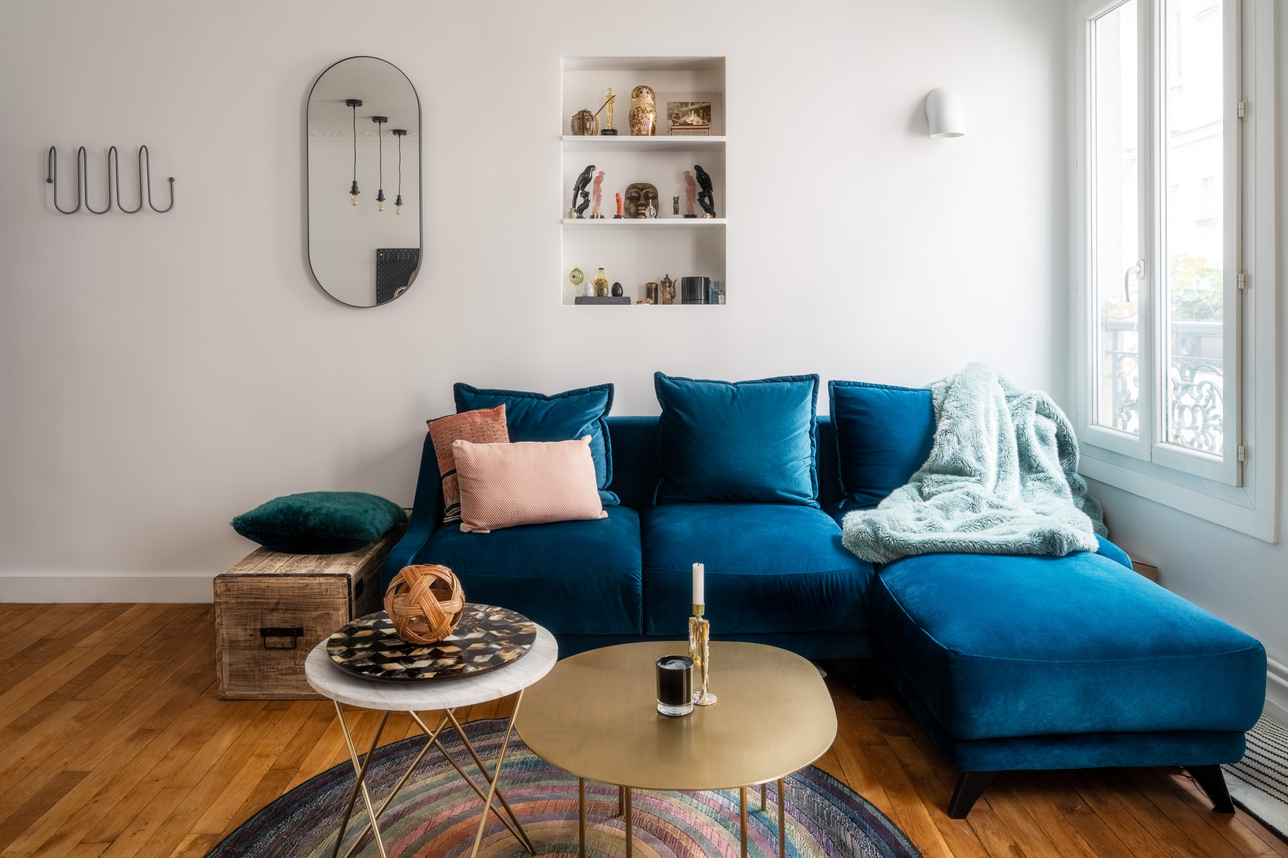 Difficile d’imaginer que l’accès à la chambre était jadis derrière le canapé où se situe cette niche ! Côté mobilier, un style contemporain magnifie désormais la pièce… et les couleurs n’ont pas été sélectionnées au hasard : le bleu fait écho à la teinte du couloir, et le doré des tables basses, à l’un des tons de la cuisine…
