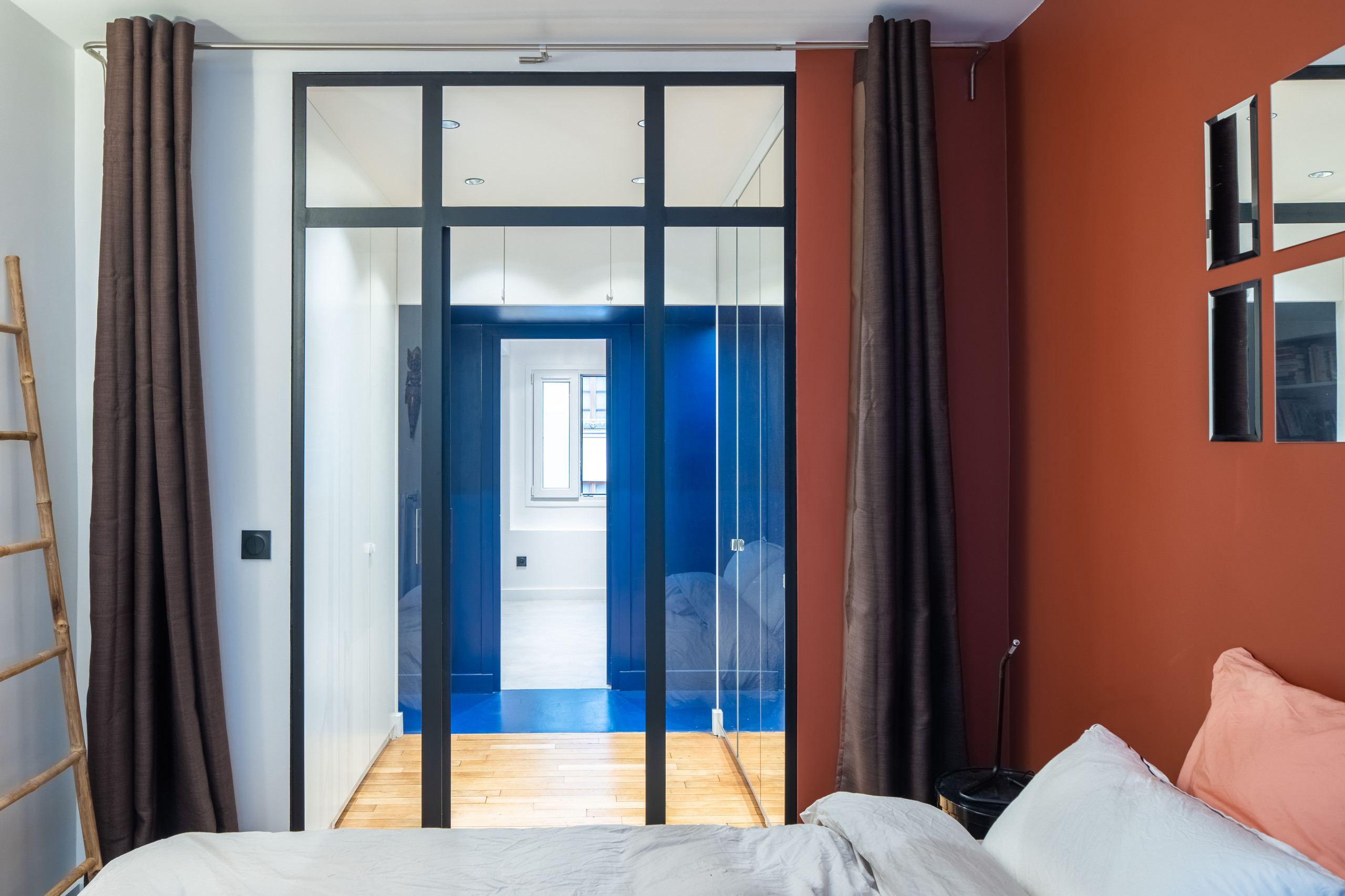 Teinter tout le couloir en bleu cobalt, il fallait oser ! « Nous leur avons proposé des solutions différentes, notamment ce grand couloir bleu dans l’entrée qui répartit les pièces. C’était l’articulation principale de l’appartement, et nous avons suggéré que cette teinte soit l’axe fort du projet », témoigne Thomas. Un parti pris qui a laissé sceptique la propriétaire, aujourd’hui conquise… La peinture bleue est une peinture polyuréthane, prévue pour les endroits avec beaucoup de passage.